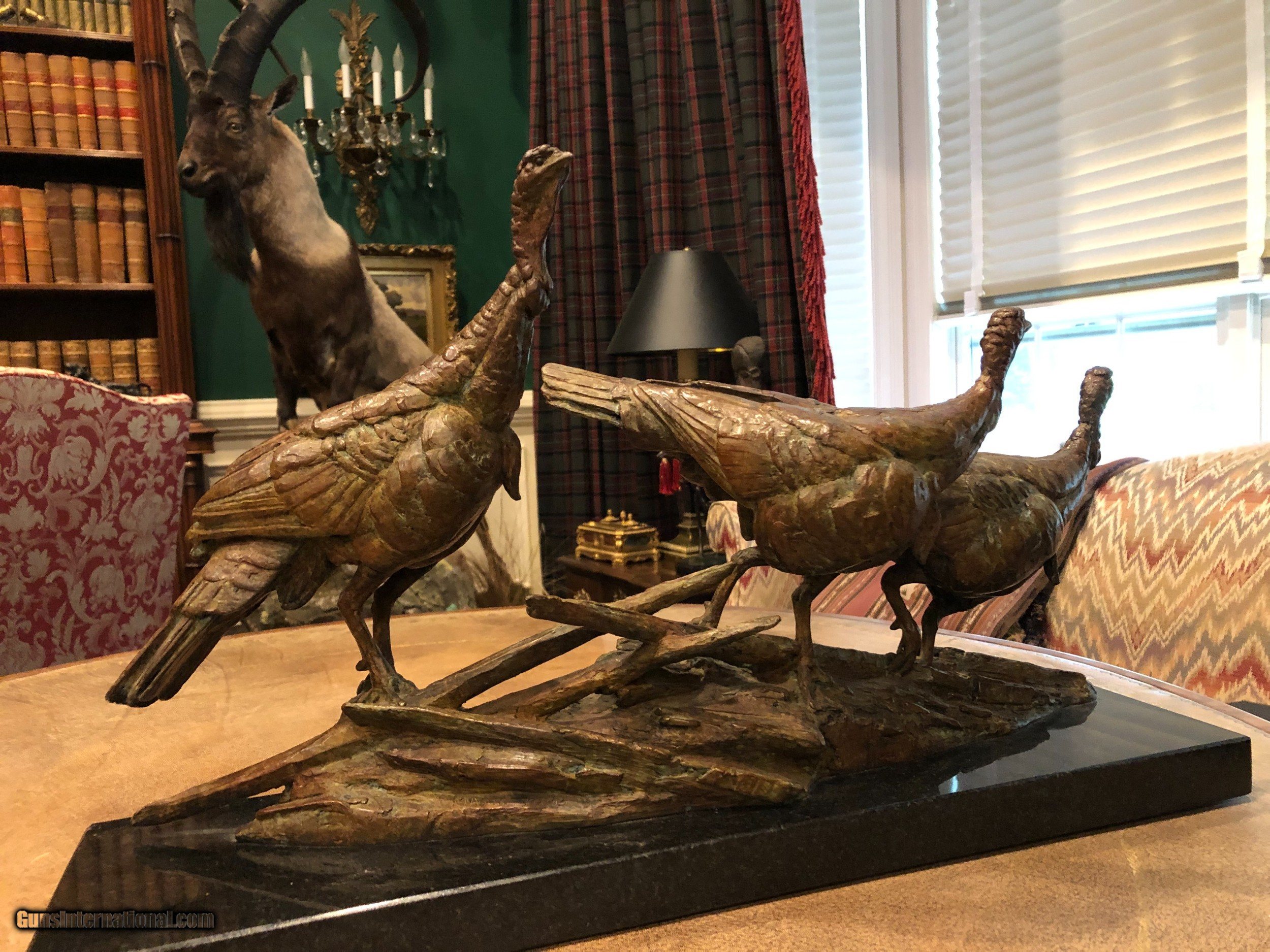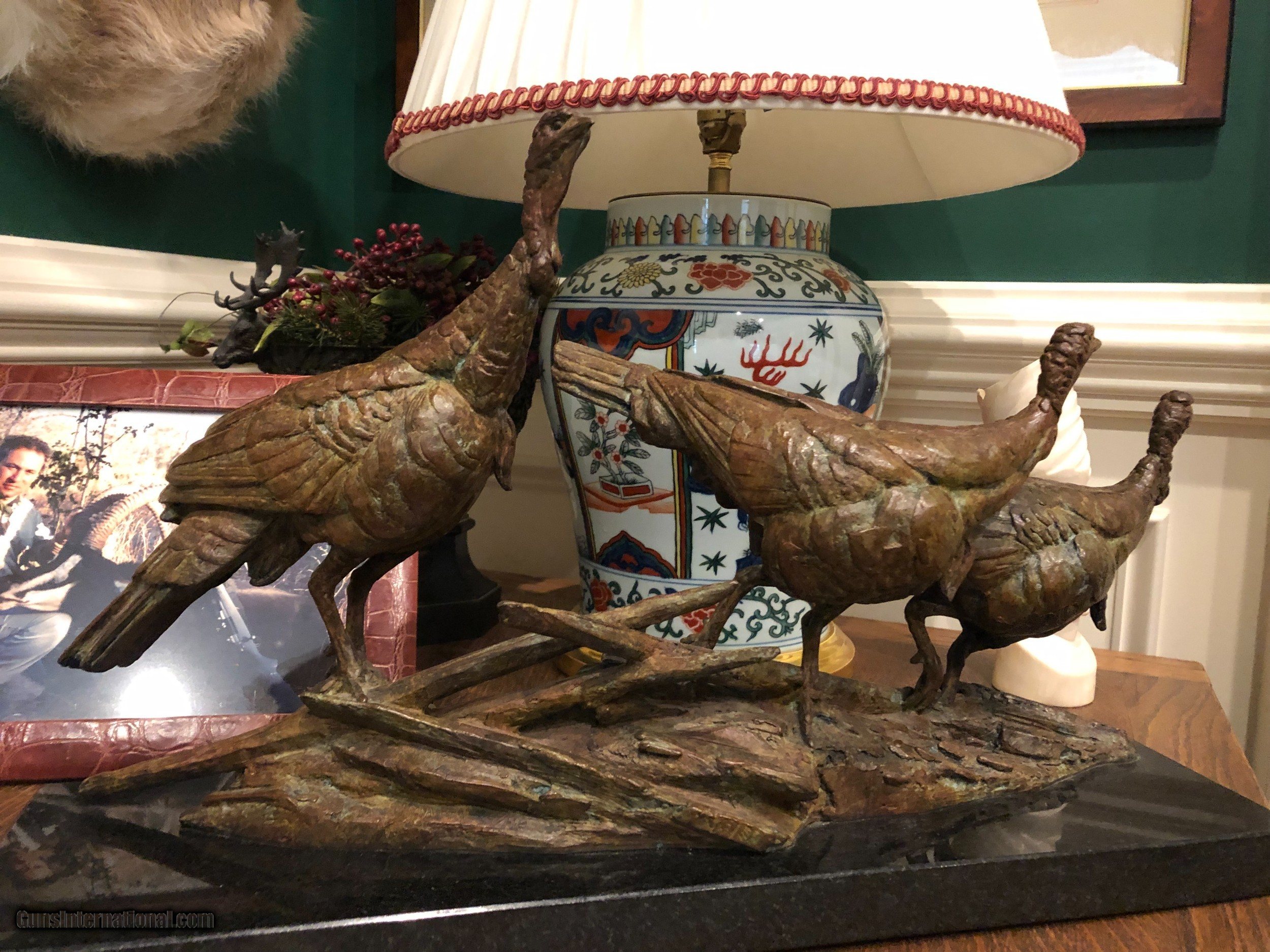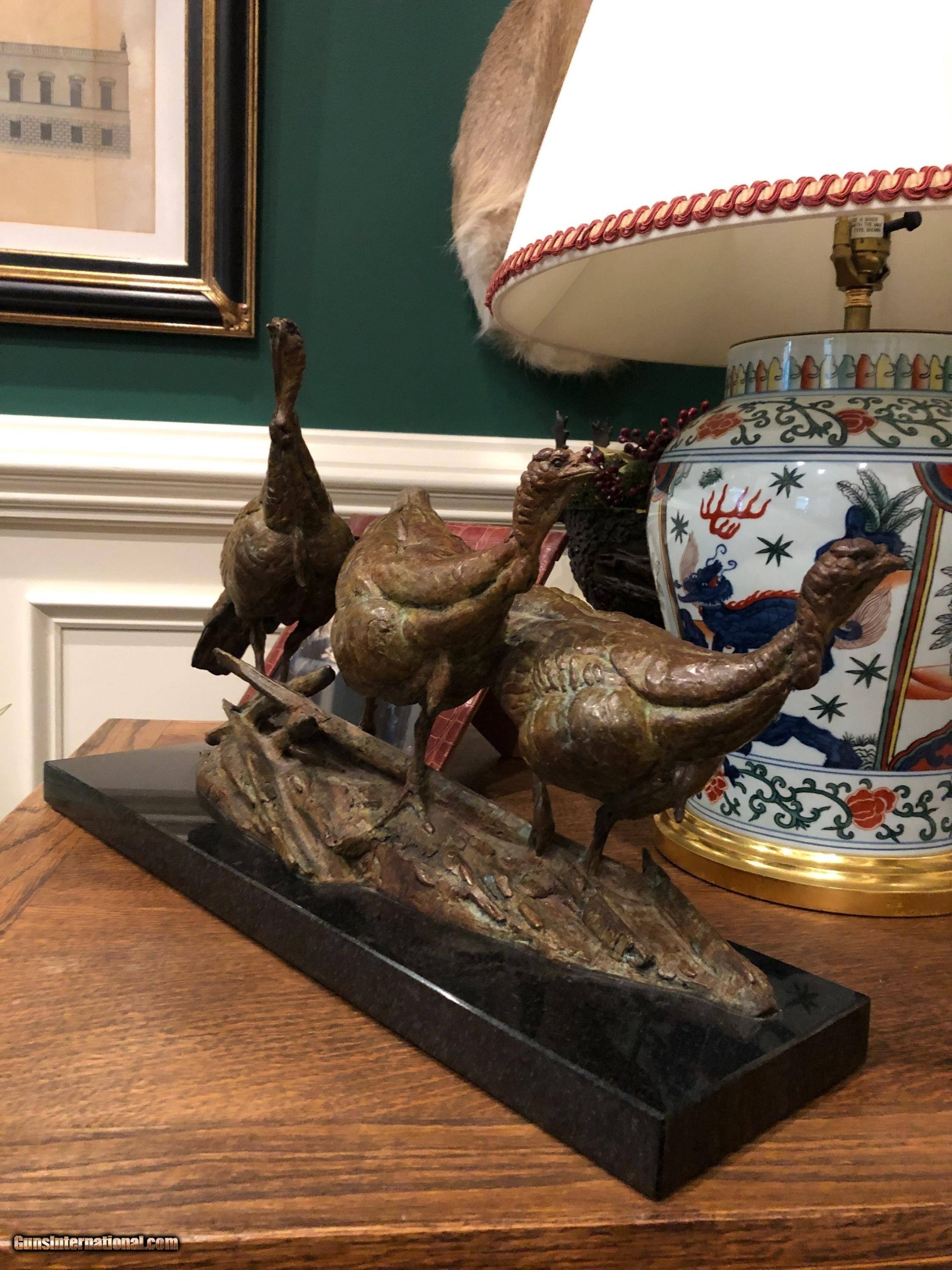 Description: This is #34 of a limited edition of 48 bronze sculptures. Incredible detail with proper proportions and shape of wild turkeys. Dimensions: 14" H X 22" L X 6" D. Weight: 38 pounds Mounted on a thick solid black granite base. Attractive traditional bronze patina. Walter T. Matia (Curlew Castings) is widely recognized for his sculptures of game birds and sporting dogs. His work has been featured in numerous sporting publications, art exhibits, and museums. Among the many awards he has received are the National Sculpture Society Gold Medal Award and Masters of the American West Award. Priced well below replacement. Price includes packing, shipping, and insurance in the Lower 48. Layaway option. Thank you. SOLD |