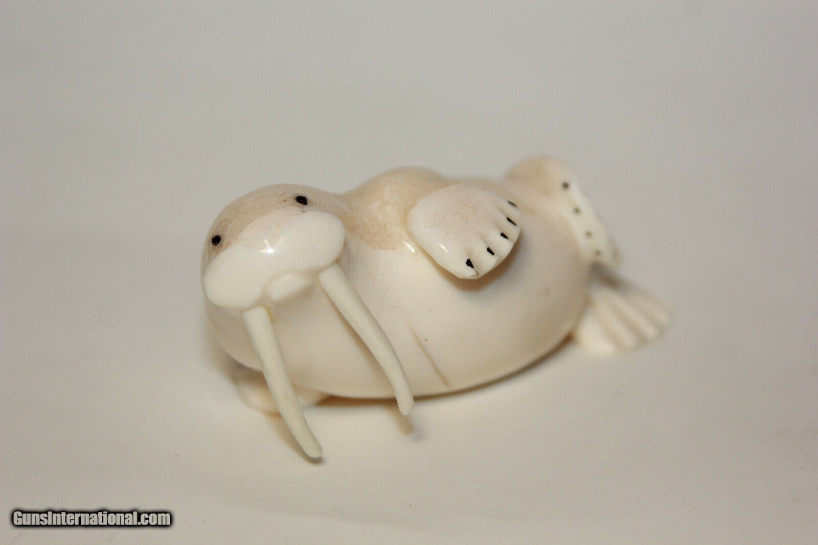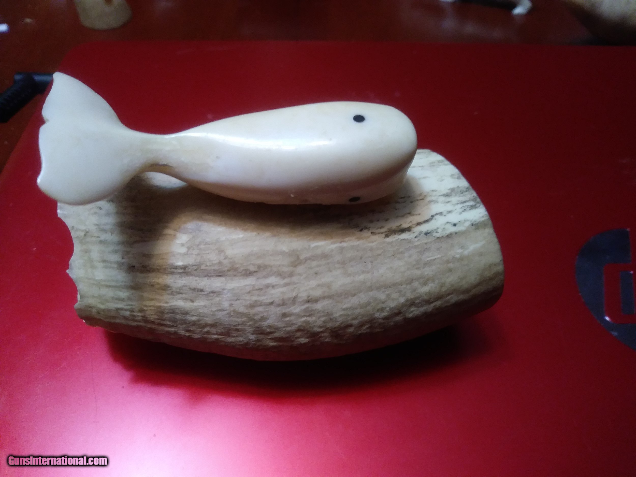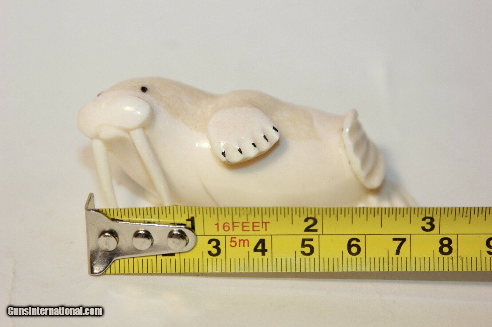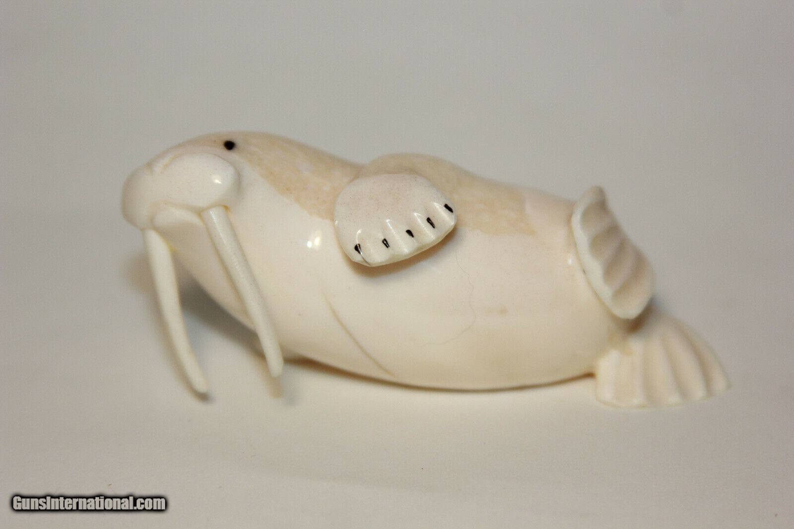 Description: Price reduced to $445.00...This is an awesome Inuit carved whale on a portion of a 100+ year old tooth.'This is something you never see. The base is Ivory and 4 inches by 2 by 1 1/4 inches and the whale is 2 1/2 inches. There are no issues good antique condition. The base could even be scrimshawed if you are a scrimshaw artist. A great Ivory Find for your collection. Email any questions and good Luck Last pictures are of another signed Inuit walrus Ivory piece Of a Walrus)available soon. Not included in the sale I can list for you. SOLD |