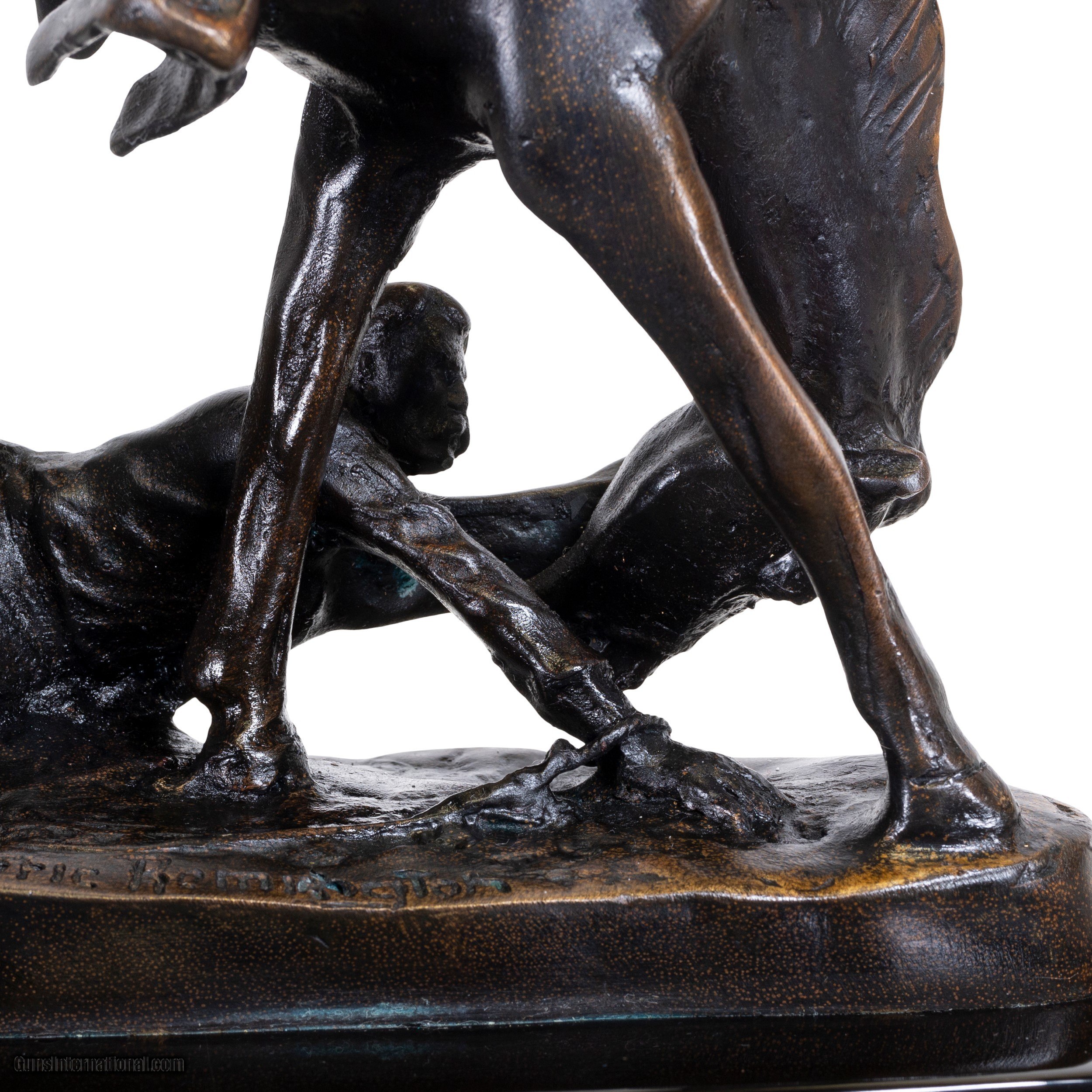 Description: Frederic Remington (1861-1909) depicted the life of the cowboy during the 1880s and 1890’s better, perhaps, than any other artist of his time. He thought of himself as a true citizen of the American West. A native of Canton, New York, Remington left college at the age of 19, looking for adventure in the West. Remington operated his own ranch in Kansas, and in 1886 he gave it up as a failure and came back to the East. The experience served him well in his later career as an artist. “What success I have had,” Remington once told a newspaper reporter, “has been because I have a horseman’s knowledge of a horse. No one can draw equestrian subjects unless he is an equestrian himself.” As an artist, Remington first made a name for himself as an illustrator and painter, and began sculpting only 14 years before his death in 1909. “I was impelled to try my hand at sculpture by a mental desire to say something in the round as well as in flat. Sculpture is the most perfect expression of action. You can say it all in clay.” The first Remington in clay was “Bronco Buster,” completed in 1885. Among his admirers were Theodore Roosevelt, who once said that “Remington portrayed a most characteristic and yet vanishing type of American life. The soldier, the cowboy, the rancher, the Indian, the horses and the cattle of the plains will live in his pictures and bronzes, I verily believe for all time.” Free shipping. Sizes (Baby) 9 1/2"H x 8"L, (Medium) 12"H x 9"L, (Regular) 22 1/2"H x 21"L PERIOD: Contemporary ORIGIN: Cisco's SIZE: Multiple Sizes Available SOLD |