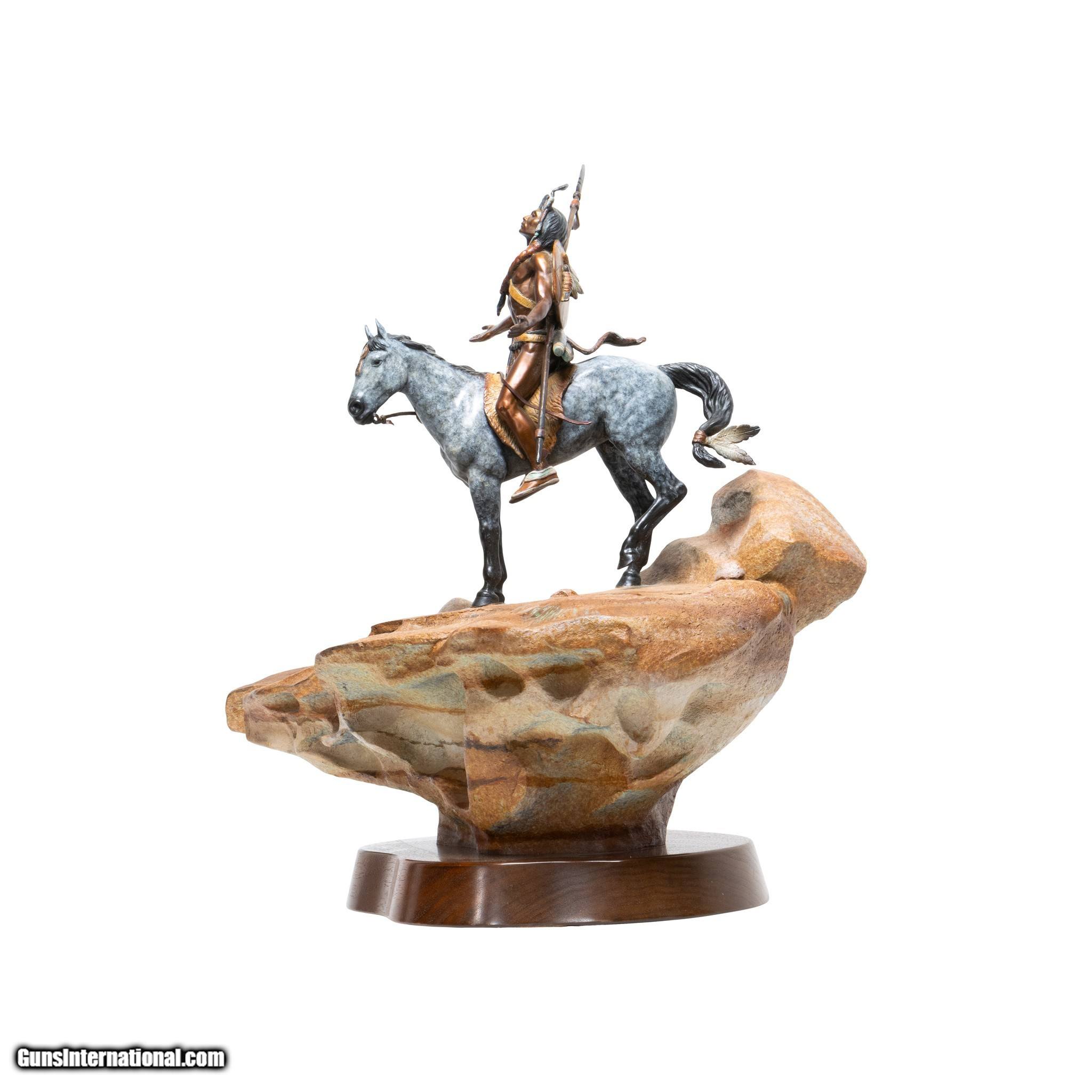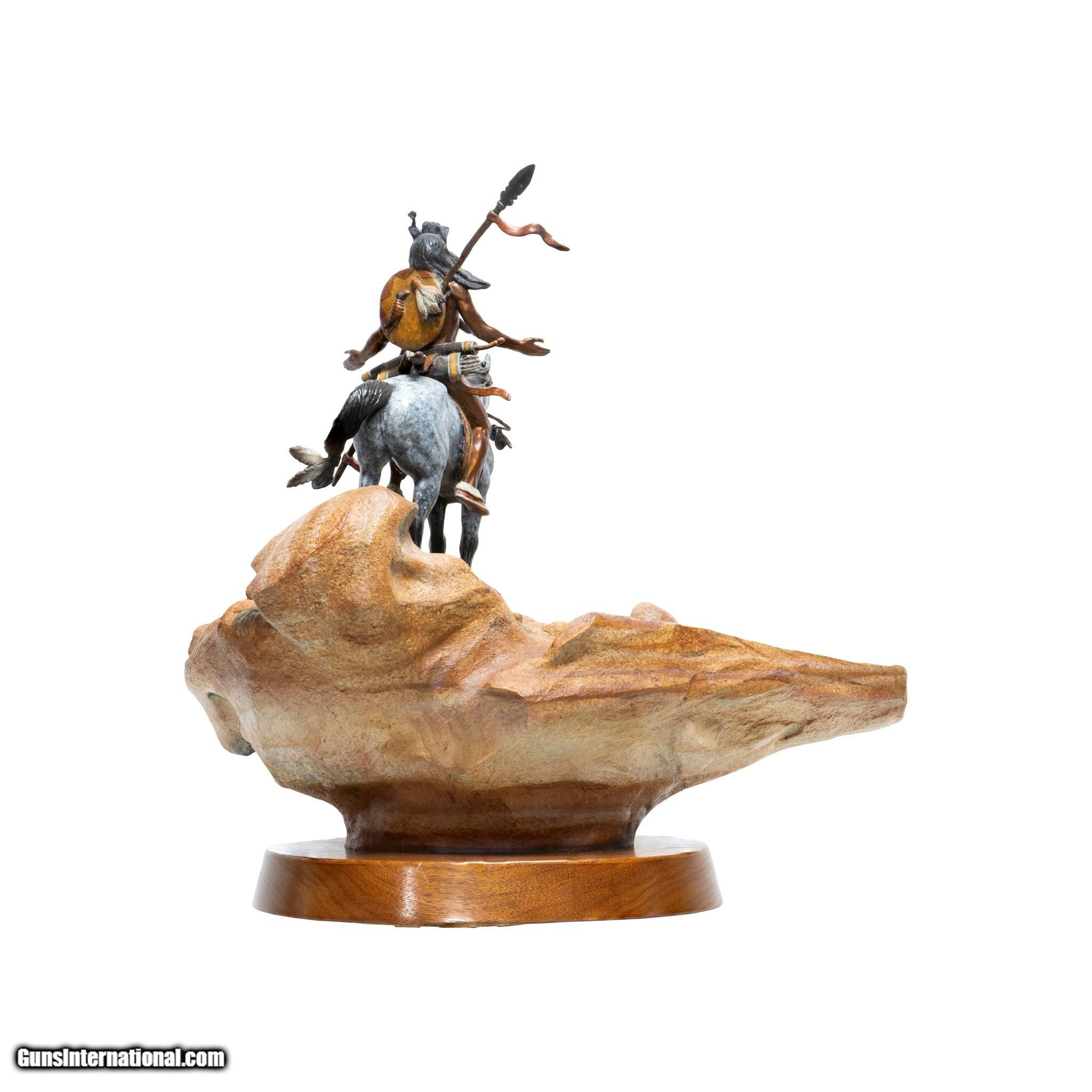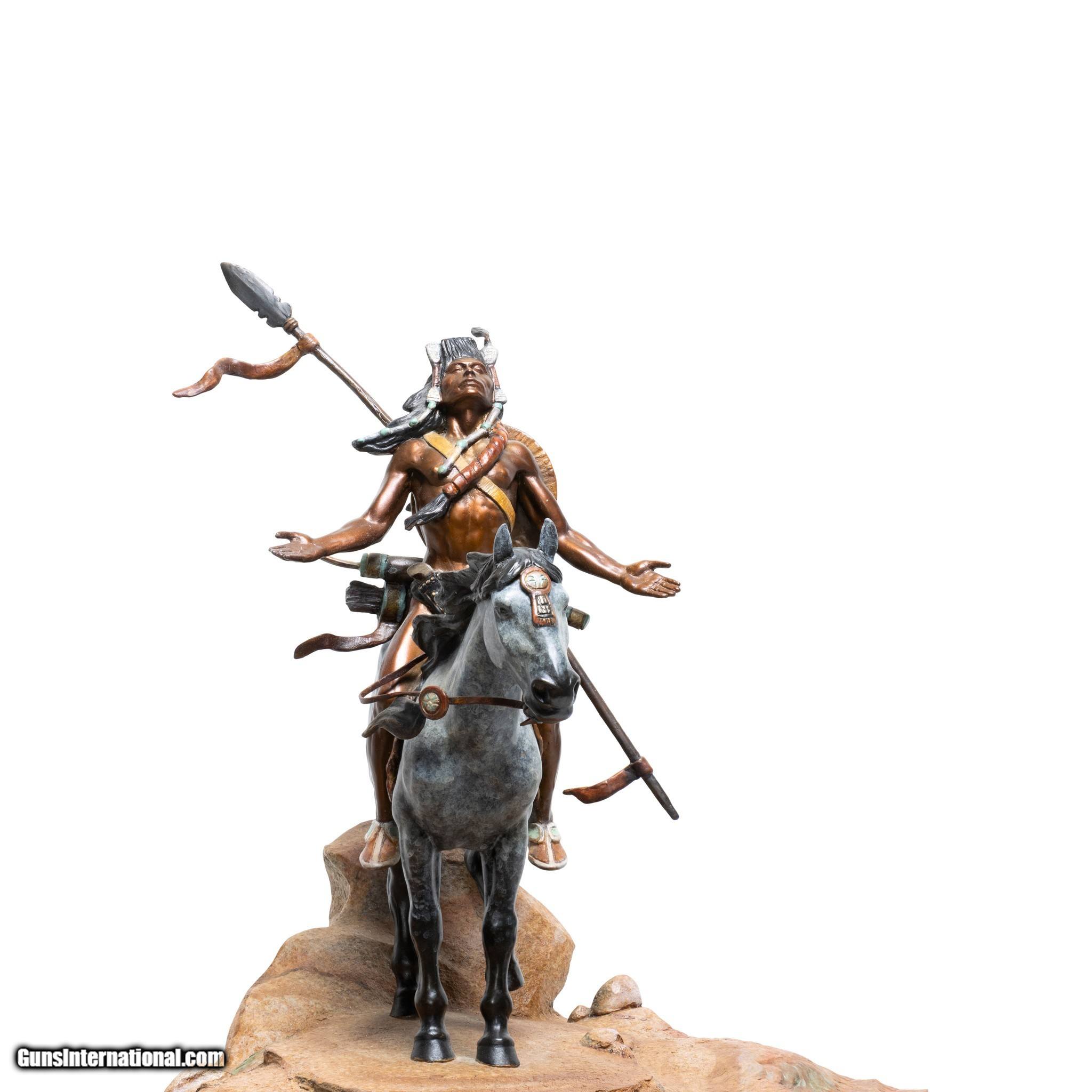 Description: Worshipping the Sun God by Kevin McCarthy. Native with bow and lace on appaloosa on sandstone rotating base. He has face raised to the sky with eyes closed and arms spread in worship. Signed. 22" x 16" x 23"H. Sculptor Kevin McCarthy began his art studies in high school under Jim Wheeler and continued his education at Northern Arizona University. McCarthy, who specializes in western sculpture, has been features in Southwest Art magazine. He is the sone of CAA sculptor and painted, Frank C. McCarthy. Family Owned & Operated Cisco’s Gallery deals in the rare, exceptional, and one-of-a-kind pieces that define the history of America and the Old West. Our pieces range from American Indian to Cowboy Western and include original items of everyday life, commerce, art, and warfare that tamed America’s frontier. Our 14,000 square foot gallery opened in 1996 in beautiful Coeur d’Alene, Idaho. Personal Service Cisco’s operates on old fashioned values – honesty and integrity, and all of our items are backed by our money back guarantee. We appreciate the opportunity to earn your business. Whether you desire assistance with a jewelry purchase, choosing a gift, identification, or even selling – we hope to be your trusted source. SOLD |