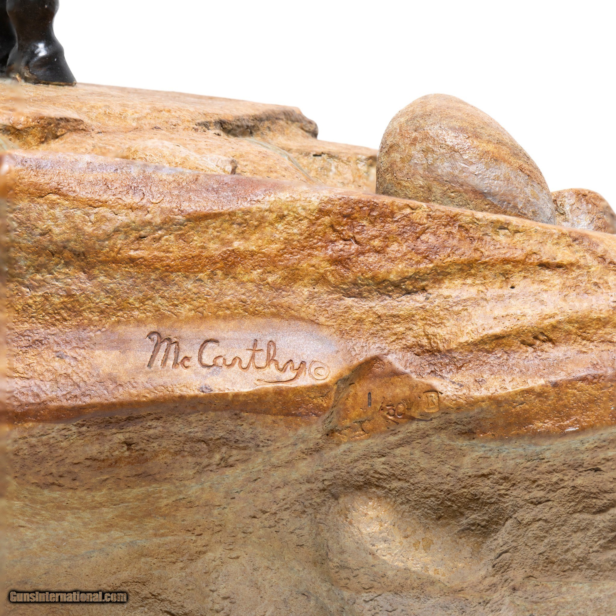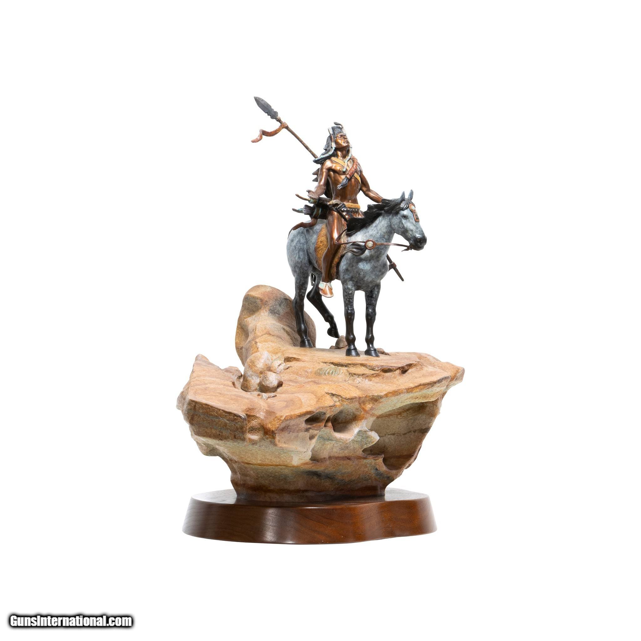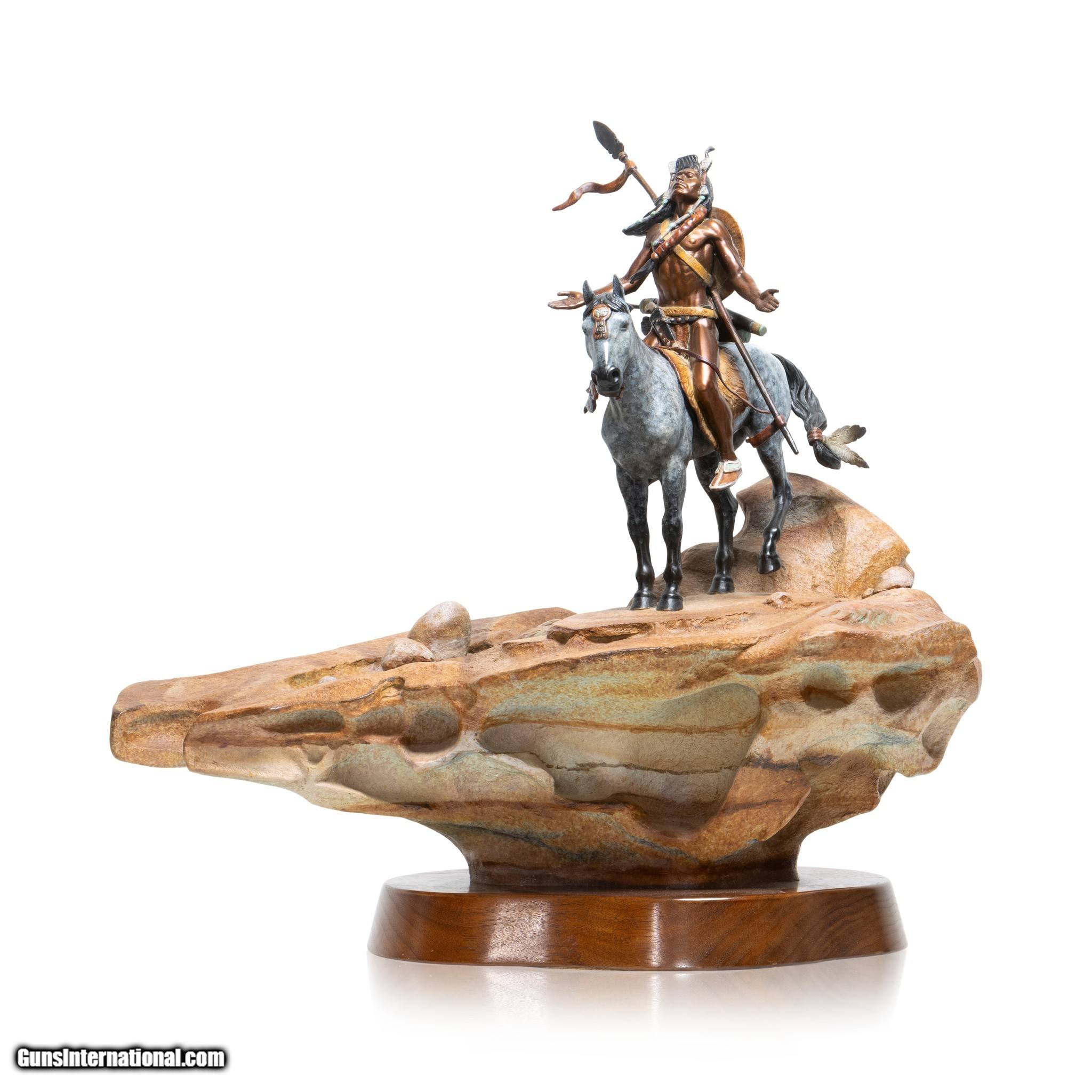 Description: Worshipping the Sun God by Kevin McCarthy. Native with bow and lace on appaloosa on sandstone rotating base. He has face raised to the sky with eyes closed and arms spread in worship. Signed. 22" x 16" x 23"H. Sculptor Kevin McCarthy began his art studies in high school under Jim Wheeler and continued his education at Northern Arizona University. McCarthy, who specializes in western sculpture, has been features in Southwest Art magazine. He is the sone of CAA sculptor and painted, Frank C. McCarthy. Family Owned & Operated Cisco’s Gallery deals in the rare, exceptional, and one-of-a-kind pieces that define the history of America and the Old West. Our pieces range from American Indian to Cowboy Western and include original items of everyday life, commerce, art, and warfare that tamed America’s frontier. Our 14,000 square foot gallery opened in 1996 in beautiful Coeur d’Alene, Idaho. Personal Service Cisco’s operates on old fashioned values – honesty and integrity, and all of our items are backed by our money back guarantee. We appreciate the opportunity to earn your business. Whether you desire assistance with a jewelry purchase, choosing a gift, identification, or even selling – we hope to be your trusted source. SOLD |