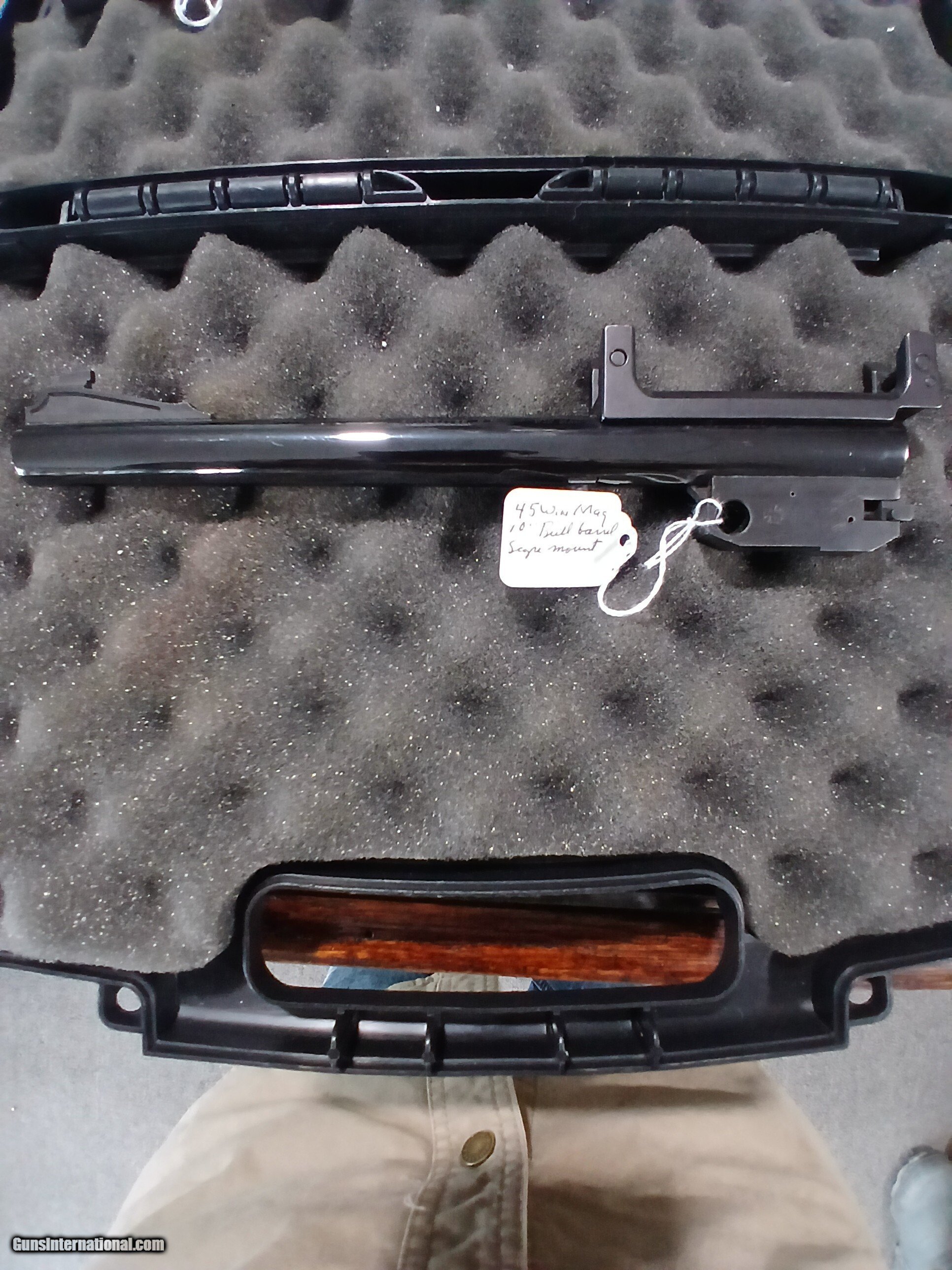 Description: We have a Thompson Center Contender .45 Win Mag 10" Bull Barrel with scope mount. case not included SOLD Handgun Caliber: .45 Winchester Magnum |
