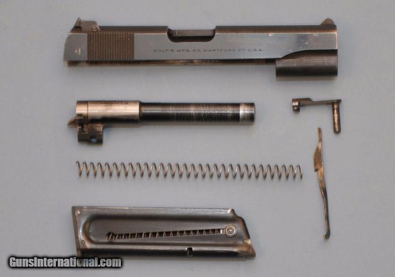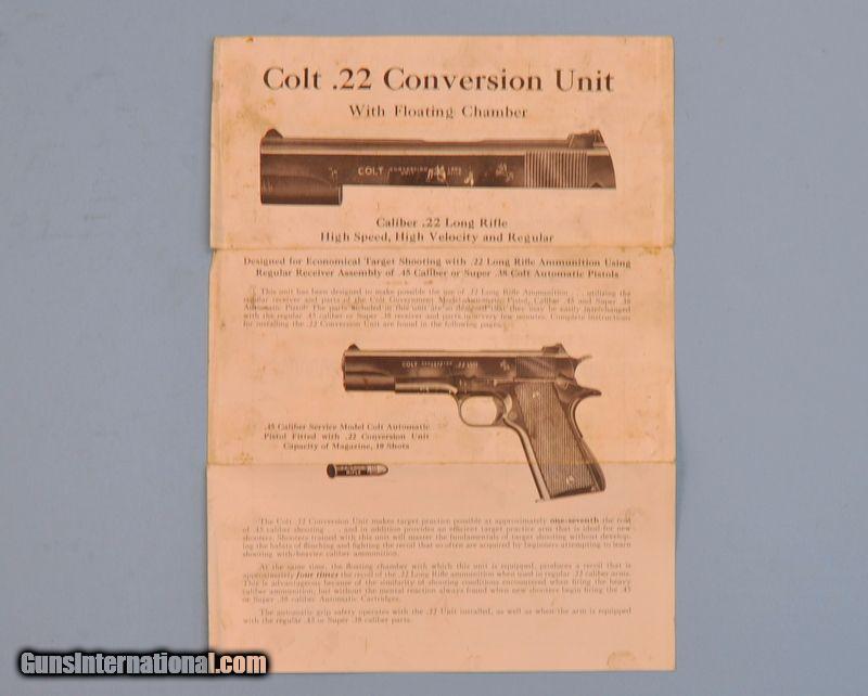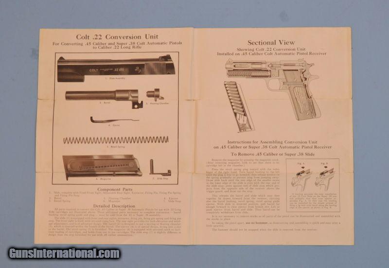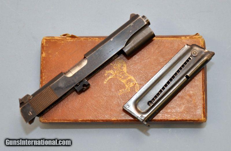 Description: Fits Colt 38 Super or 45 ACP Government Model pistols. 5" barrel with floating chamber. Blued slide with serrated ramp front sight & adjustable rear sight. Includes 10 round magazine, recoil spring, ejector & slide stop. Original 1 piece brown box has tattered exterior. Includes instruction sheet. 85% blue shows scattered scratches & marks. Very good bore. Priority mail $10.00 SOLD |