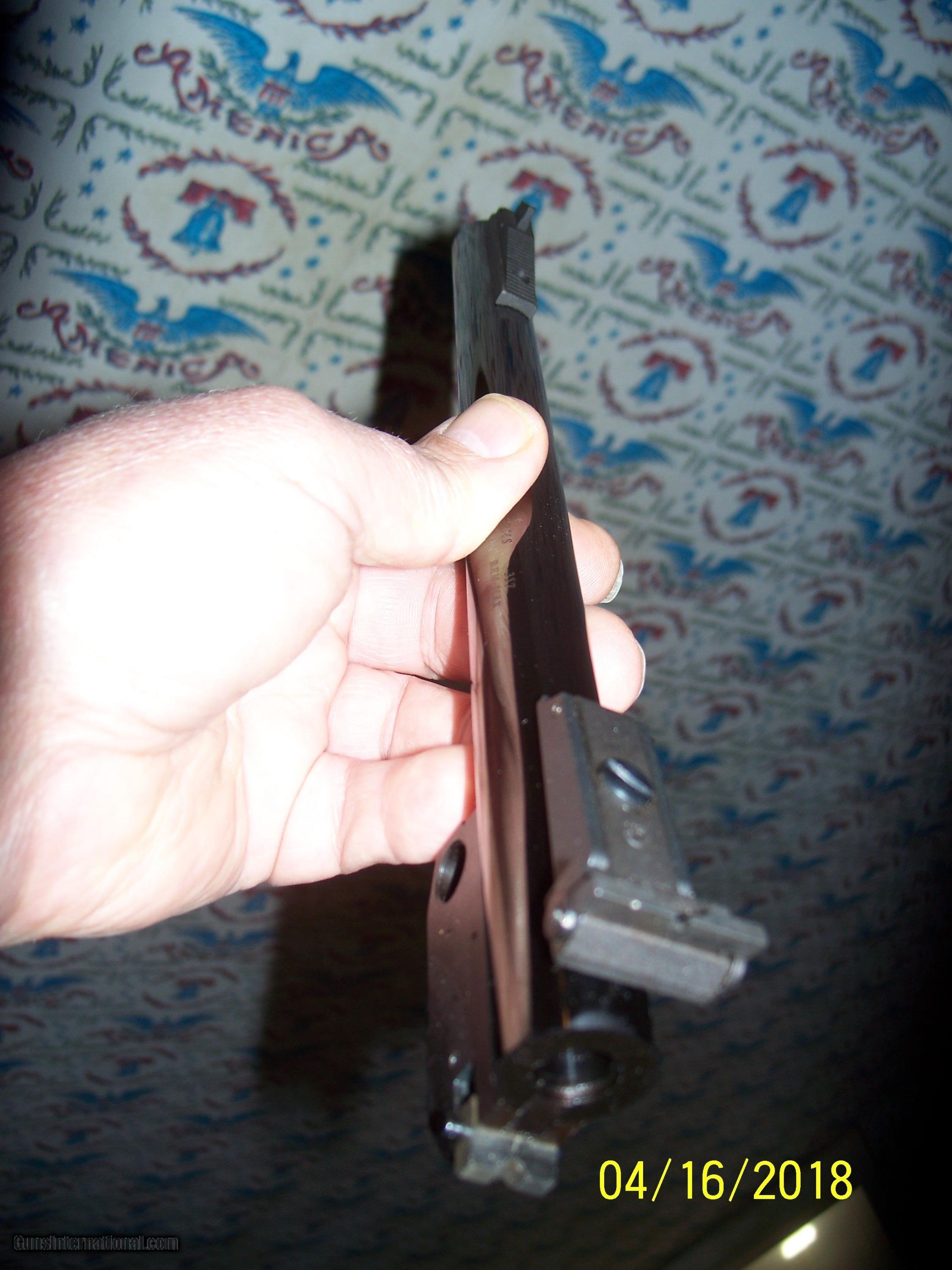 Description: CONTENDER barrell, 10" bull, deep high polish blue,.357 MAXIMUM cartridge, with adjustable sights. New condition, looks unfired. Perfect bore. Includes correct factory box and foam insert. I have owned this barrel since 1995, and never fired it. It is catalog item #4097, and was listed in the 1993 catalog, but not listed in the 1994 catalog. Ship & insure to anywhere in the USA is $24. SOLD |