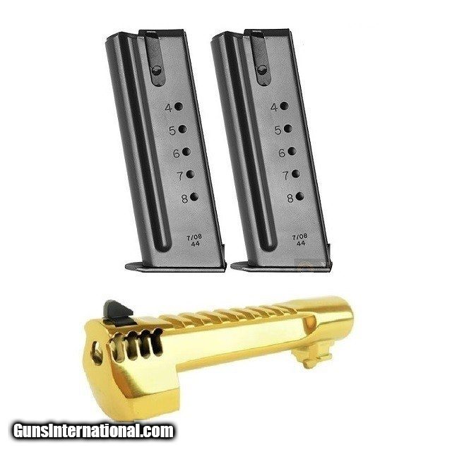 Description: Manufacturer: Magnum Research Item: Desert Eagle Caliber Conversion Kit (.44 MAG to .50 AE) SKU: BMCP446TGIMB Caliber: .44 Magnum Magazines: (2) 8 Round Barrel Length: 6" w/ Integral Muzzle Brake Picatinny Optics Rail Finish: Titanium Gold All items are factory new in box unless otherwise stated. Based on the information available to us, the above specifications describe this item to the best of our knowledge. For further information, please contact or visit the manufacturer's . SOLD |