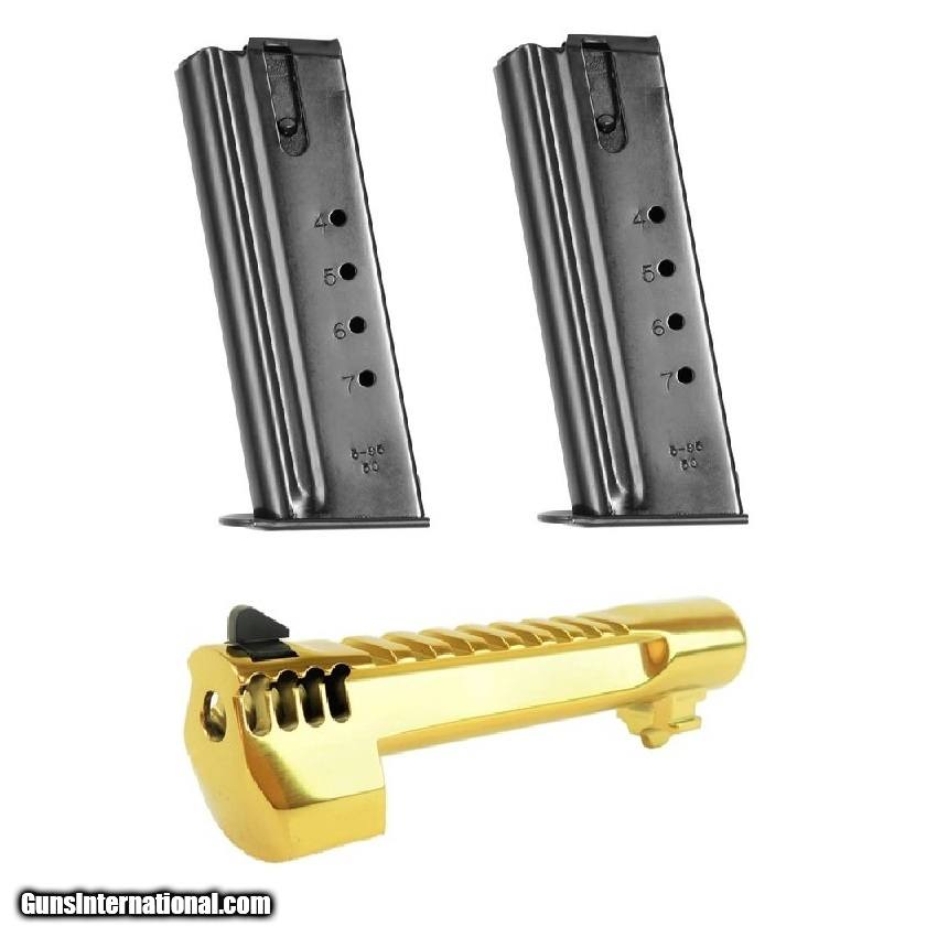 Description: Manufacturer: Magnum Research Item: Desert Eagle Caliber Conversion Kit (.44 MAG to .50 AE) SKU: BMCP506TGIMB Caliber: .50 AE Magazines: (2) 7 Round Barrel Length: 6" w/ Integral Muzzle Brake Picatinny Optics Rail Finish: Titanium Gold Convert your Mark XIX Desert Eagle .44 Magnum to a .50 AE with this conversion kit! Conversion kit includes one Desert Eagle .50 AE 6" Black Barrel and (2) 7 round Magazines. This barrel is designed to work in conjunction with Desert Eagle Mark XIX's. It can be used either as a factory replacement part or as a caliber conversion package. Over the past 29 years MRI has been responsible for the design and development of the Desert Eagle pistol. The design was refined and the actual pistols were manufactured by Israel Military Industries (IMI), subsequently shifted to Israeli Weapons Industries (IWI) until 1995, when MRI moved the manufacturing contract to Saco Defense in Saco, Maine. In 1998, MRI moved manufacturing back to IWI. Both Saco and IMI/IWI were strictly contractors: all of the intellectual property, including patents, copyrights and trademarks are the property of Magnum Research. Since 2009 the Desert Eagle Pistol has been produced in the USA at MRI's Pillager, MN facility. SOLD |