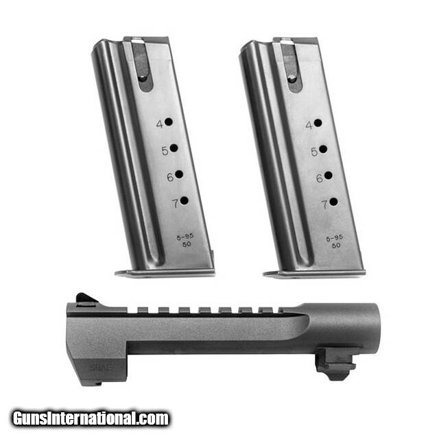 Description: Manufacturer: Magnum Research Item: Desert Eagle Caliber Conversion Kit (.44 MAG to .50 AE) SKU: BMCP506TU Caliber: .50 AE Magazines: (2) 7 Round Barrel Length: 6" Picatinny Optics Rail Finish: Tungsten All items are factory new in box unless otherwise stated. Based on the information available to us, the above specifications describe this item to the best of our knowledge. For further information, please contact or visit the manufacturer's . SOLD |