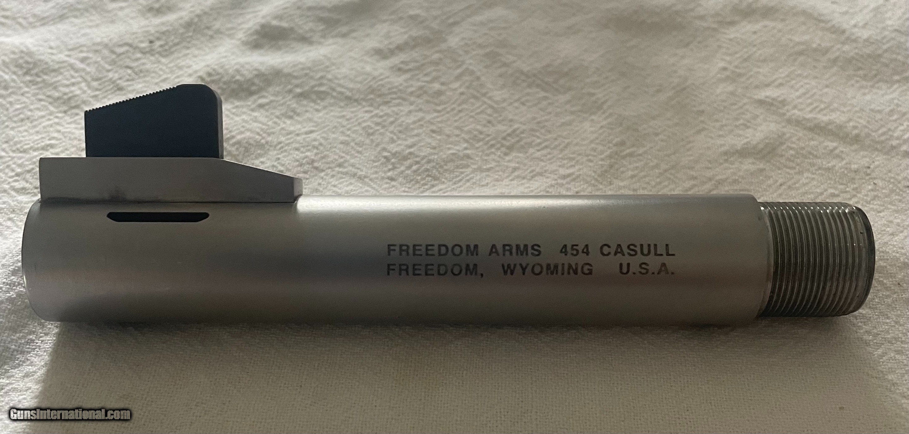 Description: For sale: Used Freedom Arms barrel in excellent condition; Model 83 field grade barrel; .454 Casull caliber; is a 4 and ¾ length barrel; ported by a gunsmith; excellent bore; front sight needs set screw; good shooter! SOLD Handgun Caliber: .454 Casull |