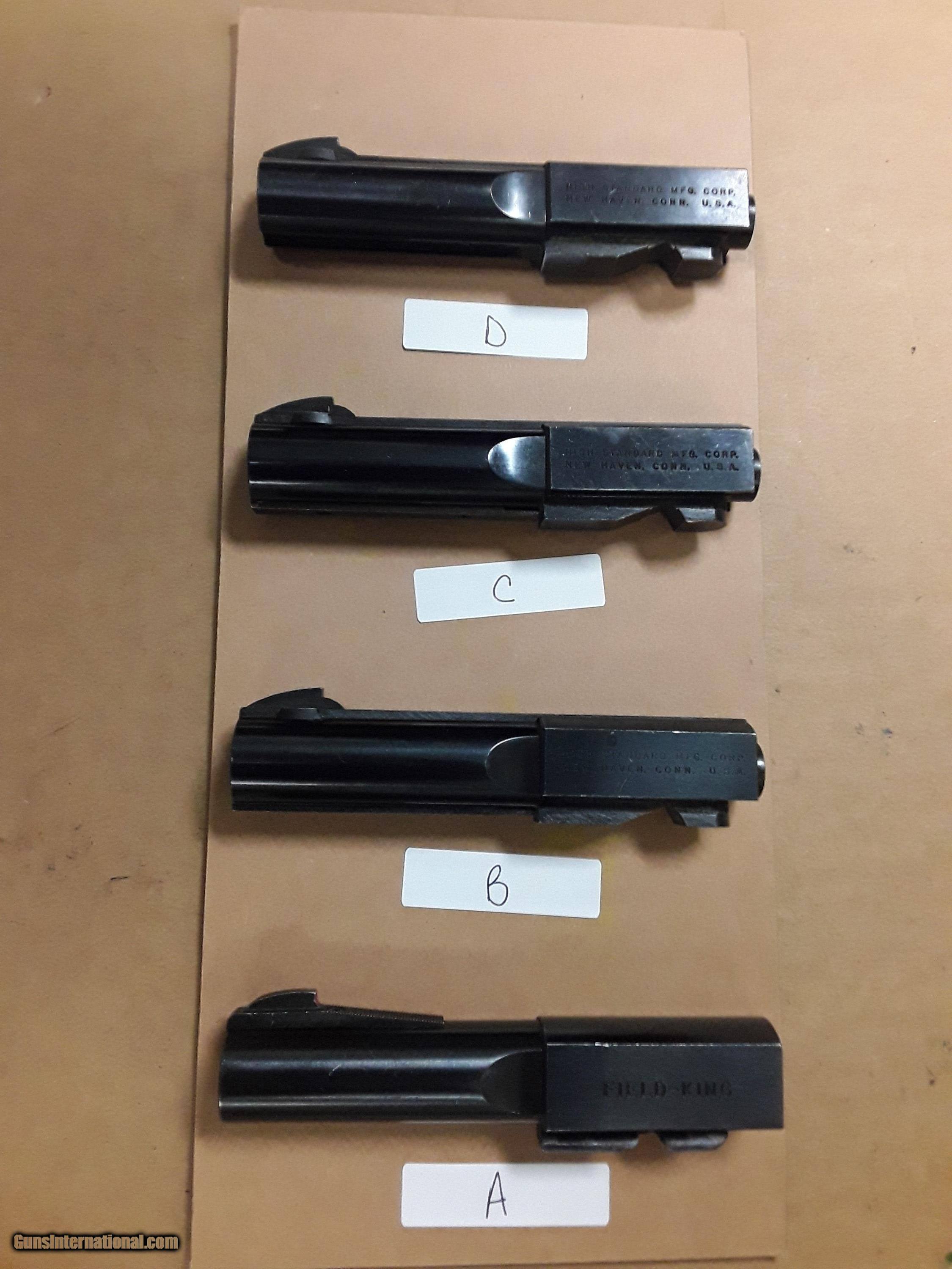 Description: HIGH STANDARD 22CAL BARRELS 4-1/2" THREE STD, ONE FIELD KING ALL SHOW LITTLE USE WITH GOOD BORES $75.00EA DELIVERED SPECIFY WHICH ONE YOU WANT, CHOICE SUBJECT TO AVAILABILITY B+C SOLD D is .22SHORT/ A is a Field King .22LR SOLD |