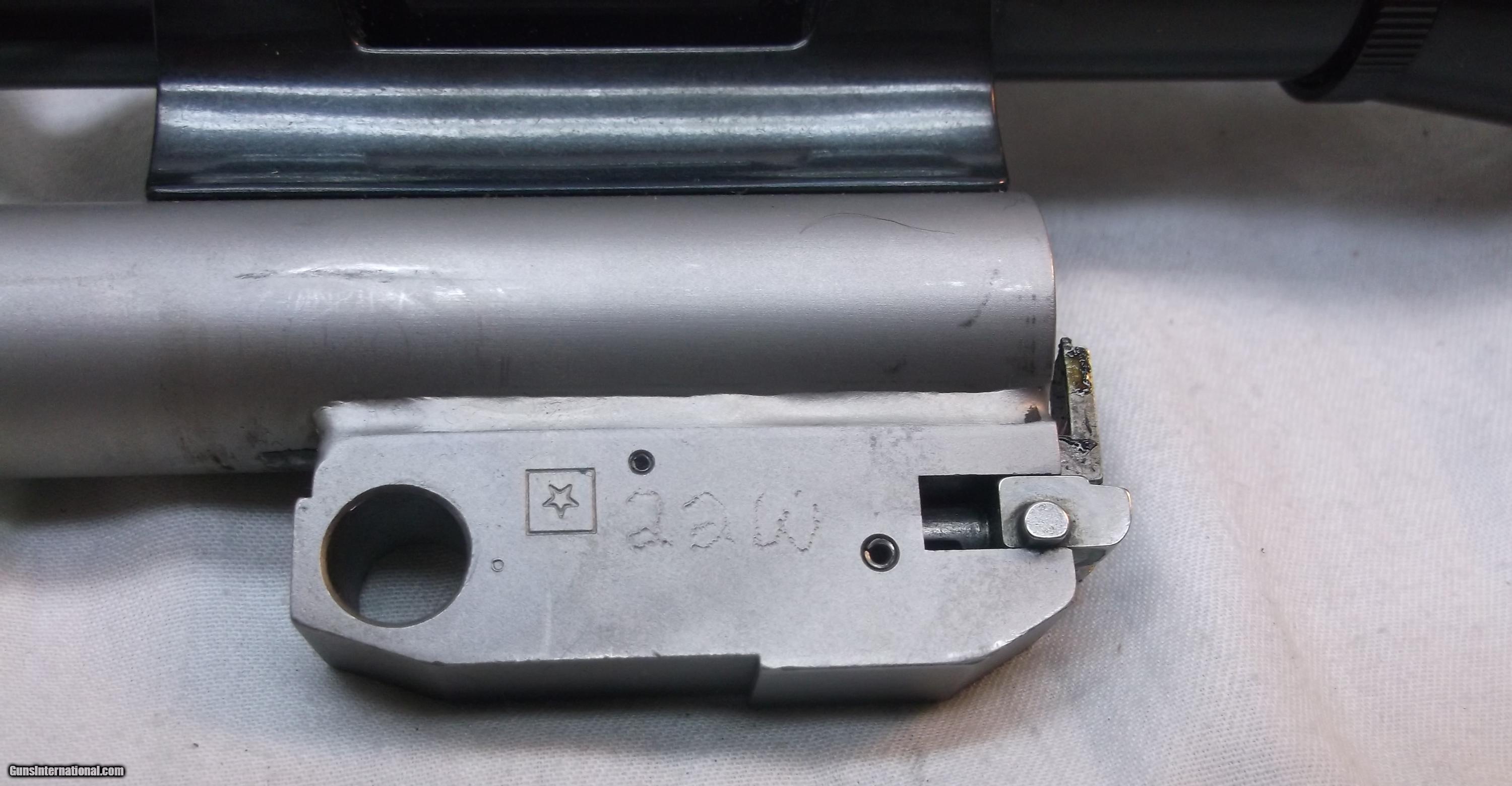 Description: This 22 Mag TC Contender pistol barrel is in good pre-owned condition. The matte stainless steel round barrel 14-1/8" x 13/16" with 1:12 twist is fitted with a Nikon Monarch 2X scope. Bore condition is near flawless. Stamped on the left side of the barrel is Thompson Center Arms Rochester New Hampshire 22 W.M.R.F. Stamped on the left side of the underlug is an star. Stamped on the bottom of the underlug is a diamond. A previous owner has engraved the letters 22W into the left side of the underlug. Willing to ship anywhere in the USA. Buyer pays freight and insurance. Our stock number is #A180. The Gun Works is a muzzle loading specialty shop located in Springfield Oregon. SOLD |