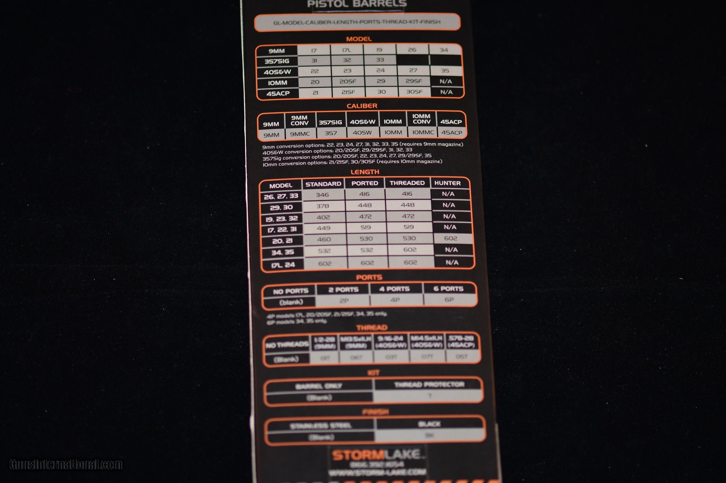 Description: Storm Lake Barrel SLB17-K G31 .357 Sig 5.19 OAL 1/2-32 Thread with Thread Protector. Lightly used barrel. Shipping USPS Priority $7.50. SOLD |