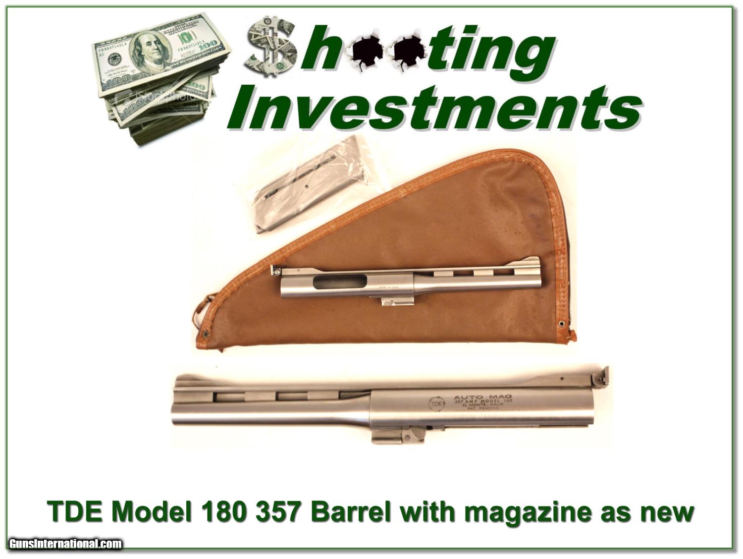 Description: Collectors, this is a TDE barrel and magazine model 160 in 357 Magnum. It can be used with the famous TDE Model 180 44 Auto Mag hand gun. (I am selling one now). I am selling it on consignment and as such lay-a-way can’t be used. It does of course have the standard 3 day inspection. Shipping and insurance is $30. Please email me with any questions or larger pictures. (I now consign quality firearms only 10%! Let me know if you have any you would like to sell!) [15-0761b] Payment: Payment is by Money Order, Cashiers Check or Personal Check. I can now also accept MasterCard and Visa with a 3% convenience fee. PayPal can be used for some items but never firearms. Please let us know if you would like to pay via PayPal. Shipping: The shipping charge will be listed in each description. It is $30 for most guns. Some heavy guns or those insured for over $2000 may be higher. Shipments to Alaska and Hawaii are higher because air shipment is required. Most firearms are shipped within 5 days of receipt of payment. We prefer shipping at the beginning of the week to avoid firearms in transit over weekends. We package all shipments carefully and insure them for the full purchase price, rounded up to the next $100. In the unlikely event that damage occurs, it is important that you save all packaging material for the claims process. Optics are shipped Priority Mail and most other non-firearm shipments are shipped First Class. Returns: Our return policy is simple. If for any reason you are not pleased with your purchase, you may return your item for a refund. The only exception is ammunition, it cannot be returned. It is important to us that you are happy. Guns cannot be fired or dissembled before returning them and must be returned in the same condition as received. Notification of a return must occur with-in 3 days of receipt at your dealer. Shipping, convenience and dealer fees are not refundable and are the responsibility of the buyer. Lay-a-way: If needed, we offer a 60 day lay-a-way option on most firearms. It is 1/3 now, 1/3 in 30 days and 1/3 in 60 days. Lay-a-way firearm sales are final. Consigning your firearms with Shooting Investments: We will help you get top dollar for your firearms. While most local guns shops charge 20% or more, our fee is only 10% with a minimum of $50. At your local gun shop it might take months to sell. Selling on-line provides instant access to thousands of interested buyers. You won’t find any other on-line dealer willing to sell your firearms for only 10% or listing every gun on 4 separate s. Selling through an House typically costs the seller 15% and the buyer an addition 15% (so 30%) and you have to wait several months to sell and longer to receive funds. If properly priced, we will sell your firearms in a week or two. Send us an email or give us a call and we’ll explain how easy it is for you to get top dollar. Trading: We collect guns and usually just trade for guns we want to add to our collections. We often sell guns for others wanting to purchase one of ours. We find this the most fair to both of us. Our Commission is only 10% and we hold the gun you want until yours sells. Please contact us if you want to sell one of yours to buy one of ours. Help for California Buyers: We are happy to ship to California. It is the buyer’s responsibility to make sure any item you buy is legal in your state. We are also happy to help with your purchase of a firearm from someone other than us. If you see a gun you would like to buy but the seller can’t or won’t ship to California we can help. You buy the gun and have it shipped to us. We’ll then ship it to your California dealer. The cost for this service is only $30 + shipping. Let me know if we can help! SOLD |