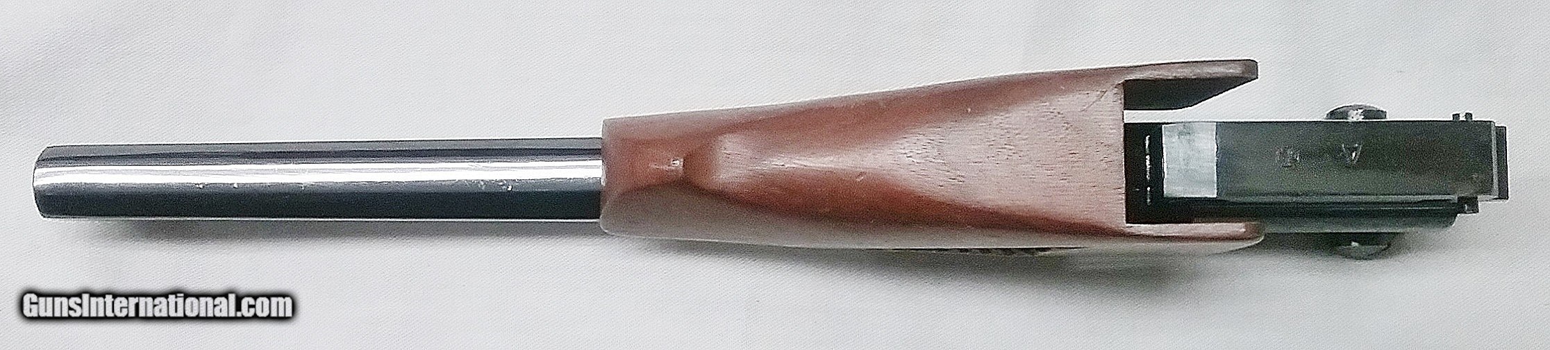 Description: This .22 LR TC Contender pistol barrel is a 10” blued tapered octagon barrel that in very good condition with a ramped blade front sight. The bore is very good. Stamped on the left side of the barrel is Thompson Center Arms Rochester NH 22 LR. Stamped on the left side of the under lug is a star. Stamped on the bottom of the under lug is an A and an iron cross. The P grade checkered American Walnut forend in in good condition with the exception of some light scratches and handling marks. Barrel assembly comes with a Buehler scope mount. Our stock number is #C86. Willing to ship anywhere in the United States. Buyer pays freight and insurance. SOLD |