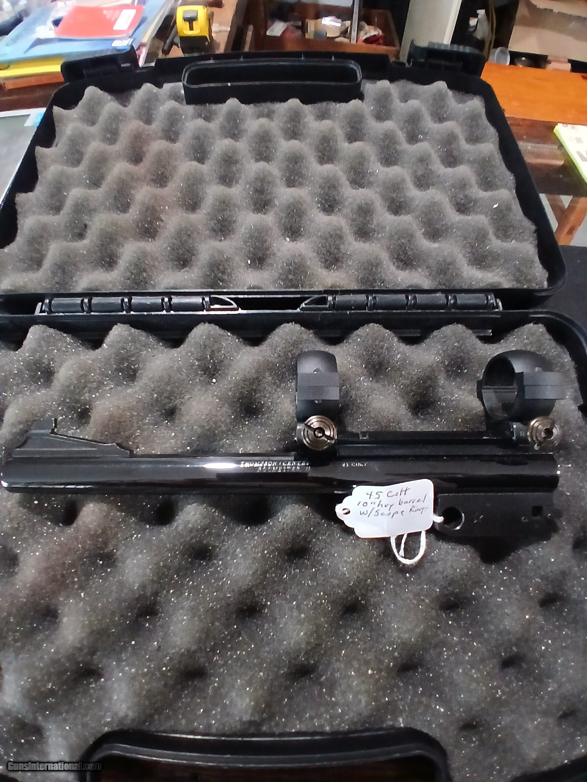Description: We have a 45 Colt 10" hvy barrel w/scope rings, It is for a THOMPSON CENTER ARMS CONTENDER case not included SOLD Handgun Caliber: .45 Colt |