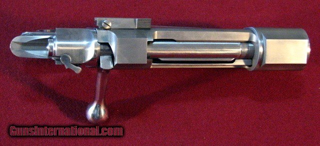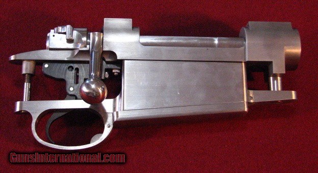 Description: New Granite Mountain, Phoenix Arizona Magnum Double Square Bridge Action with three position side swing safety, drop box bottom metal, and straddle floorplate with trigger bow release. True magnum length action with .416 bolt face. Included with this is a 26 inch .458 Pac-Nor barrel that has been properly contoured to Pre-War .416 Rigby specs with "lumps" left for machining an integral banded ramp front sight, barrel band sling stud, and iconic Rigby short quarter rib. The previous owner planned .450 Rigby build. Action can be sold without the barrel for $3695 or a .416 standard sporting contour barrel can also provided. SOLD |