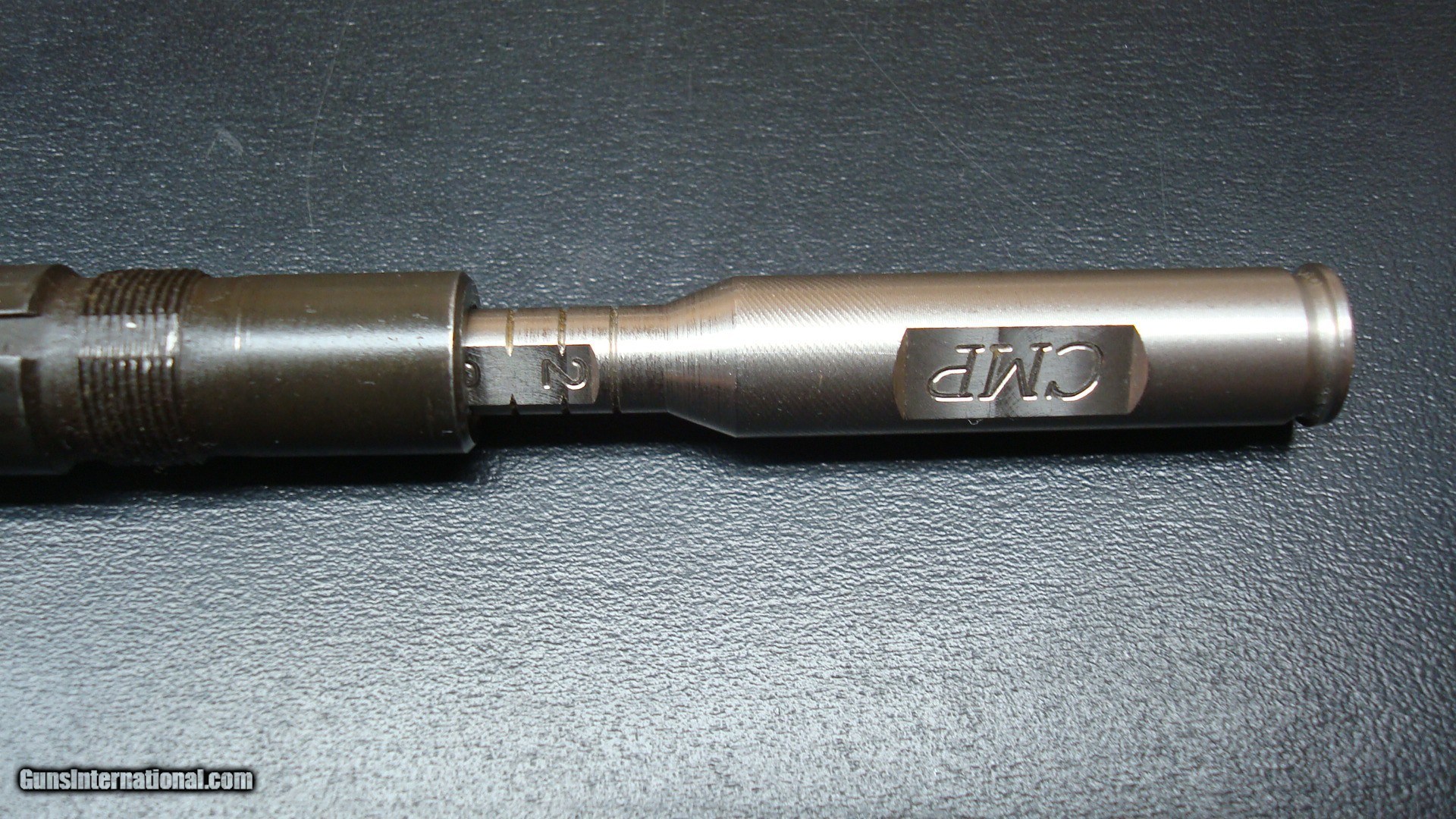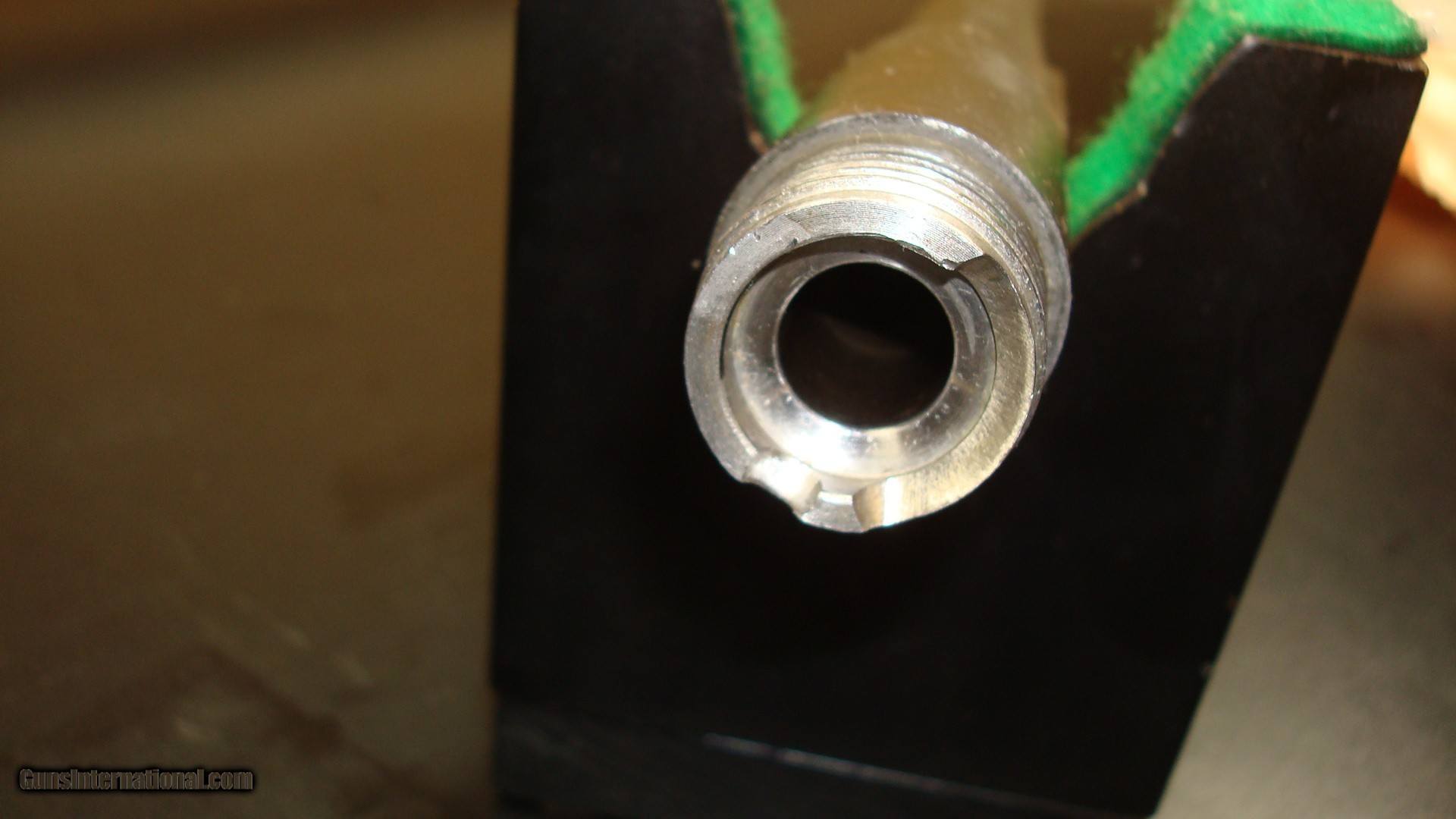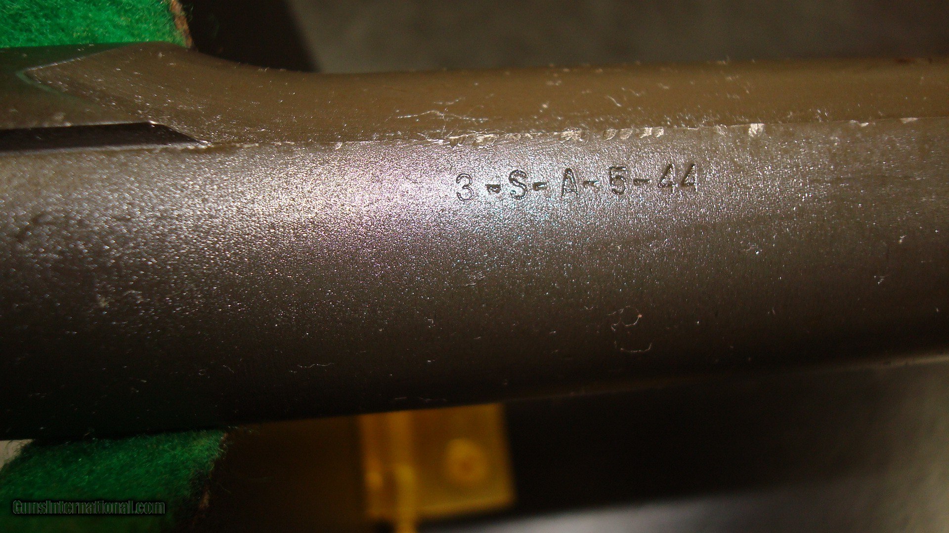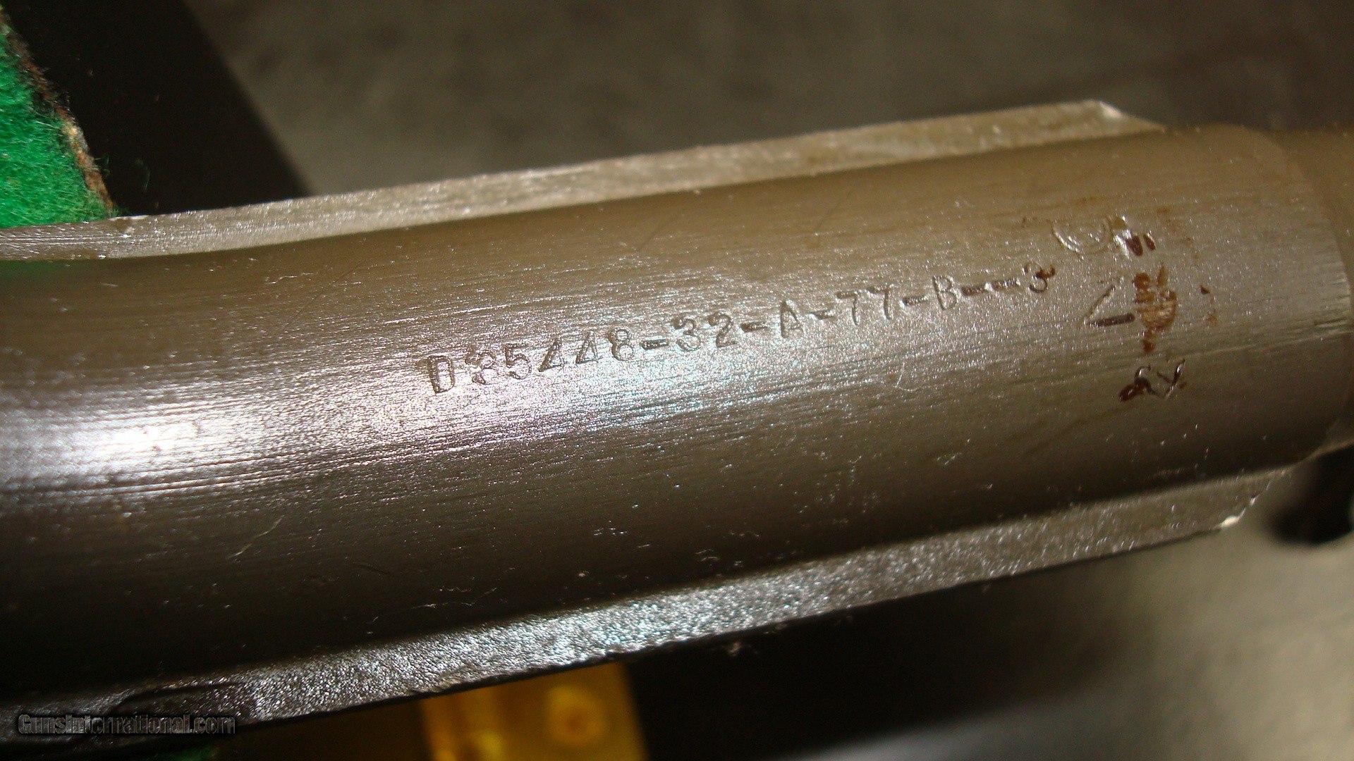 Description: M-1 Garand barrel. 3-S-A-5-44. Excellent condition. Bright bore, bright breech, no pitting, no vice marks, no import marks, good threads ME is just over 0. TE is just under 2. Dark blackish grey Parkerizing. Top of barrel marked D58448-32-A-77-B-3 along with a partial ordnance stamp, an A and a P. Gas port is not chromed. Some light scuffing in Parkerizing but estimated over all Parkerizing at about 95% or better. Others to follow. Priority mail shipping charges to buyer zip code. Payment by Postal MO, Bank check or MO, personal check with shipping pending bank clearance. SOLD |