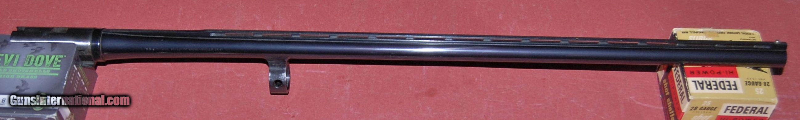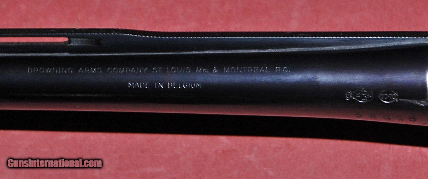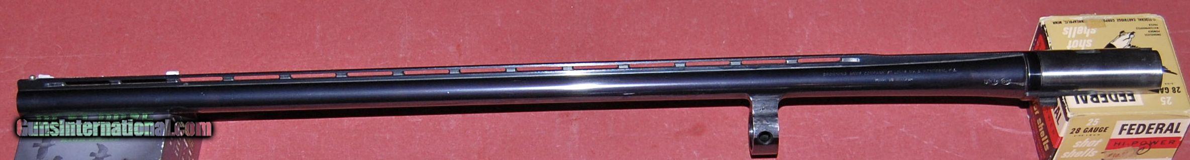 Description: Belgian Browning 20 gauge vent rib barrel.This barrel is 26" long and choked in the hard to find skeet choke.The barrel retains at least 98% of the original blue.There is one small slide mark on the bottom of the barrel that will not show when on a gun.The bore is bright and free of any rust,dents,or damage.The barrel has a St.Louis and Montreal address.A hard to find barrel in excellent condition. SOLD |