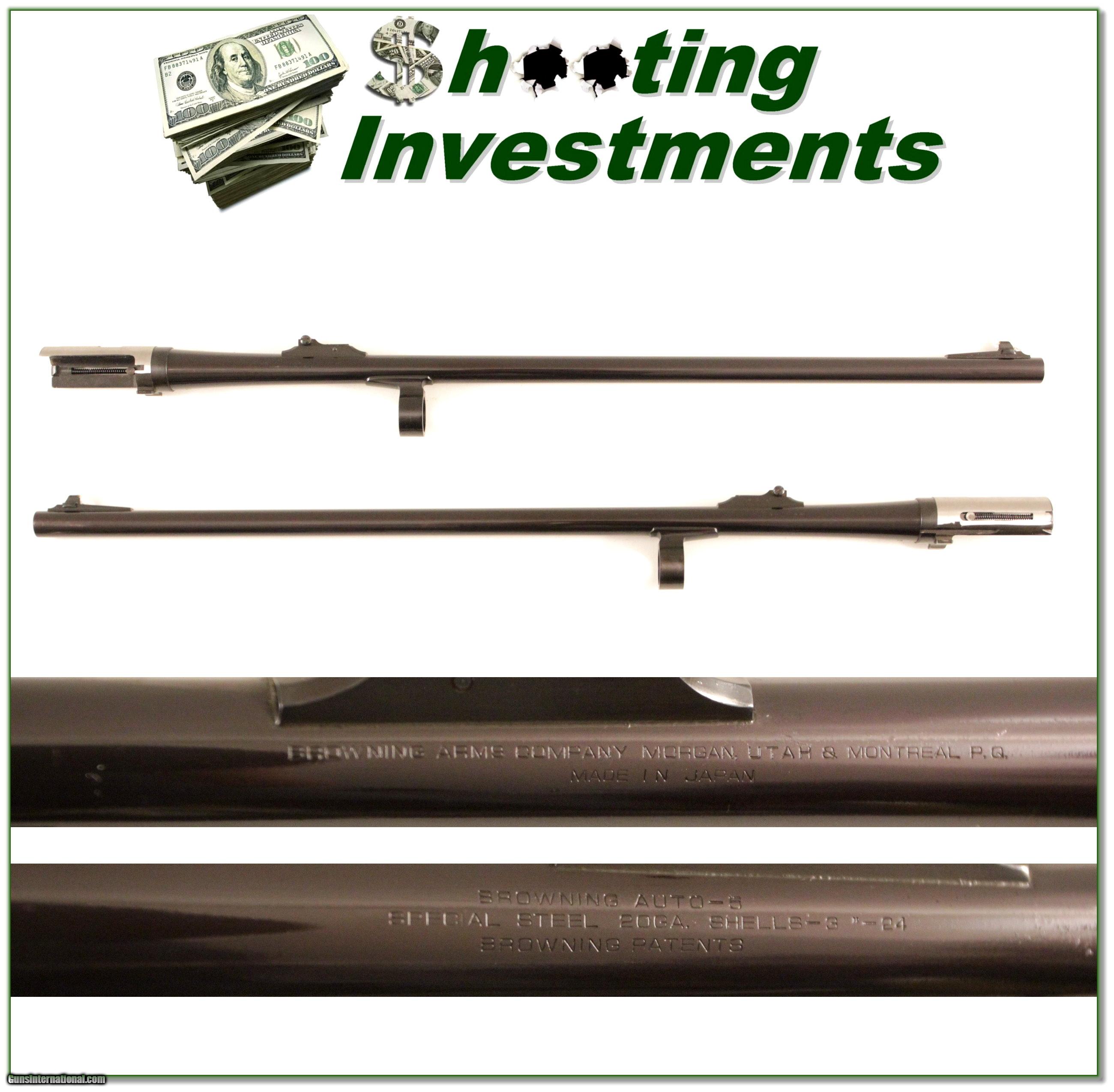 Description: This is an excellent condition Browning A5 barrel. It fits Magnum 20 Gauge A5’s. This one was made in Japan and will work with all Belgium and Japan made A5 20 Magnums. Shipping is $14.95 and please email me with any questions or larger pictures. (I now consign quality firearms only 10%! Let me know if you have any you would like to sell!) [16-0354b] Payment: Payment is by Money Order, Cashiers Check or Personal Check. I can now also accept MasterCard and Visa with a 3% convenience fee. PayPal can be used for some items but never firearms. Please let us know if you would like to pay via PayPal. Shipping: The shipping charge will be listed in each description. It is $35 for most guns. Some heavy guns or those insured for over $2000 will be higher. Shipments to Alaska and Hawaii are higher because air shipment is required. Most firearms are shipped within 5 days of receipt of payment. We prefer shipping at the beginning of the week to avoid firearms in transit over weekends. We package all shipments carefully and insure them for the full purchase price, rounded up to the next $100. In the unlikely event that damage occurs, it is important that you save all packaging material for the claims process. Optics are shipped Priority Mail and most other non-firearm shipments are shipped First Class. Returns: Our return policy is simple. If for any reason you are not pleased with your purchase, you may return your item for a refund. The only exception is ammunition, it cannot be returned. It is important to us that you are happy. Guns cannot be fired or dissembled before returning them and must be returned in the same condition as received. Notification of a return must occur with-in 3 days of receipt at your dealer. Shipping, convenience and dealer fees are not refundable and are the responsibility of the buyer. Lay-a-way: If needed, we offer a 60 day lay-a-way option on most firearms. It is 1/3 now, 1/3 in 30 days and 1/3 in 60 days. Lay-a-way firearm sales are final. Consigning your firearms with Shooting Investments: We will help you get top dollar for your firearms. While most local guns shops charge 20% or more, our fee is only 10% with a minimum of $50. At your local gun shop it might take months to sell. Selling on-line provides instant access to thousands of interested buyers. You won’t find any other on-line dealer willing to sell your firearms for only 10% or listing every gun on 4 separate s. Selling through an House typically costs the seller 15% and the buyer an addition 15% (so 30%) and you have to wait several months to sell and longer to receive funds. If properly priced, we will sell your firearms in a week or two. Send us an email or give us a call and we’ll explain how easy it is for you to get top dollar. Trading: We collect guns and usually just trade for guns we want to add to our collections. We often sell guns for others wanting to purchase one of ours. We find this the most fair to both of us. Our Commission is only 10% and we hold the gun you want until yours sells. Please contact us if you want to sell one of yours to buy one of ours. Help for California Buyers: We are happy to ship to California. It is the buyer’s responsibility to make sure any item you buy is legal in your state. We are also happy to help with your purchase of a firearm from someone other than us. If you see a gun you would like to buy but the seller can’t or won’t ship to California we can help. You buy the gun and have it shipped to us. We’ll then ship it to your California dealer. The cost for this service is only $30 + shipping. Let me know if we can help! SOLD |