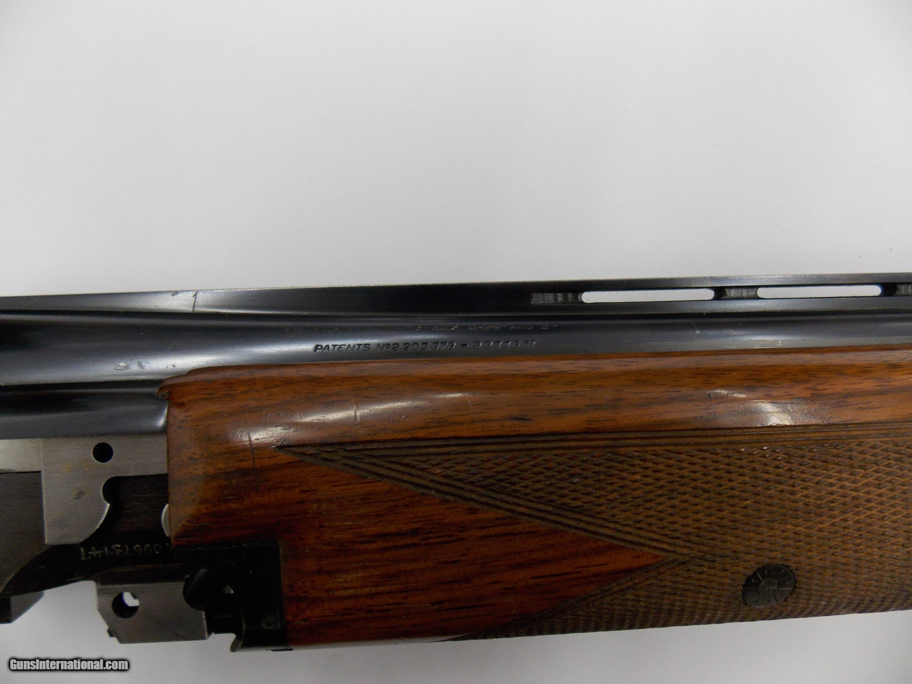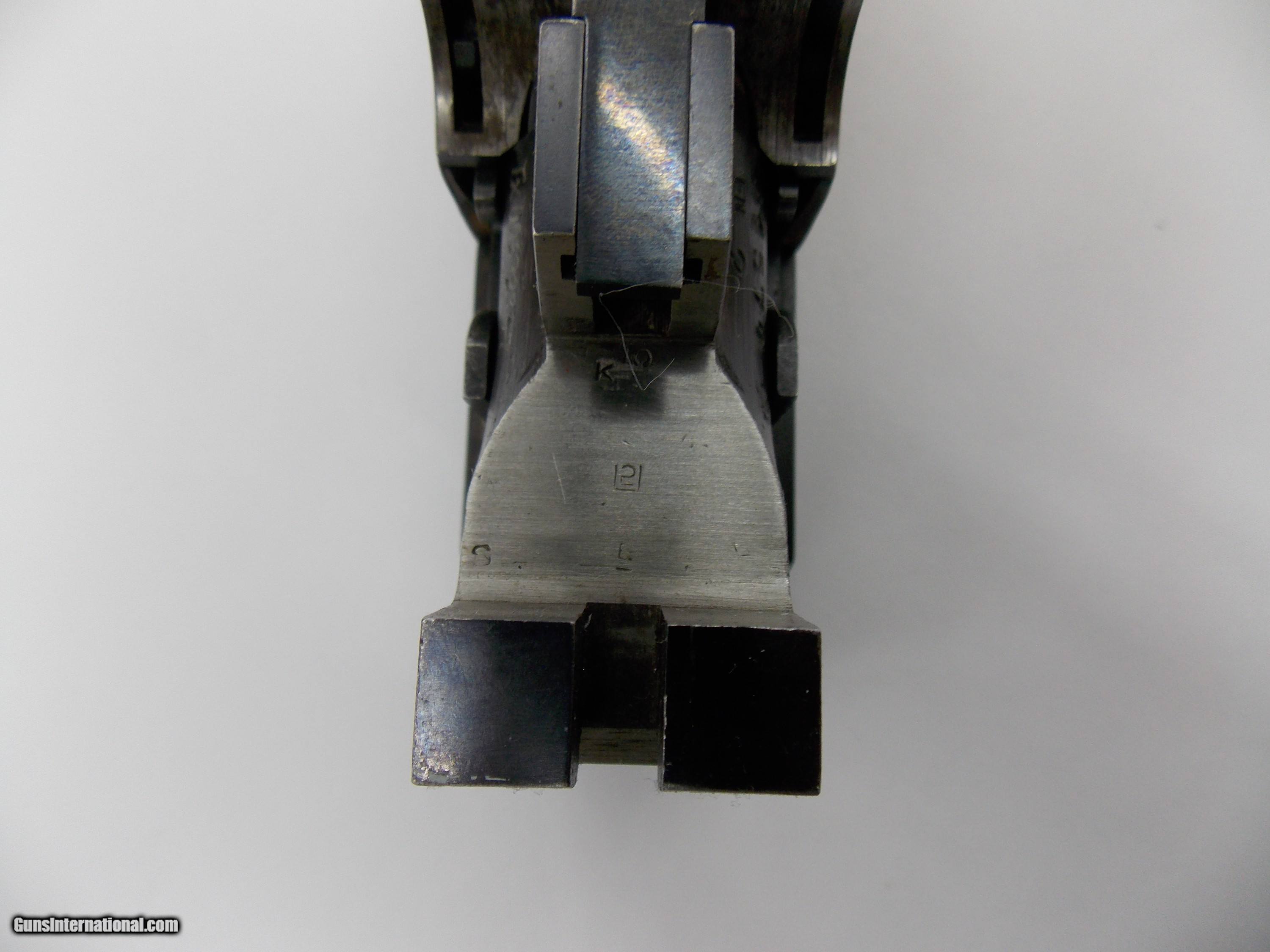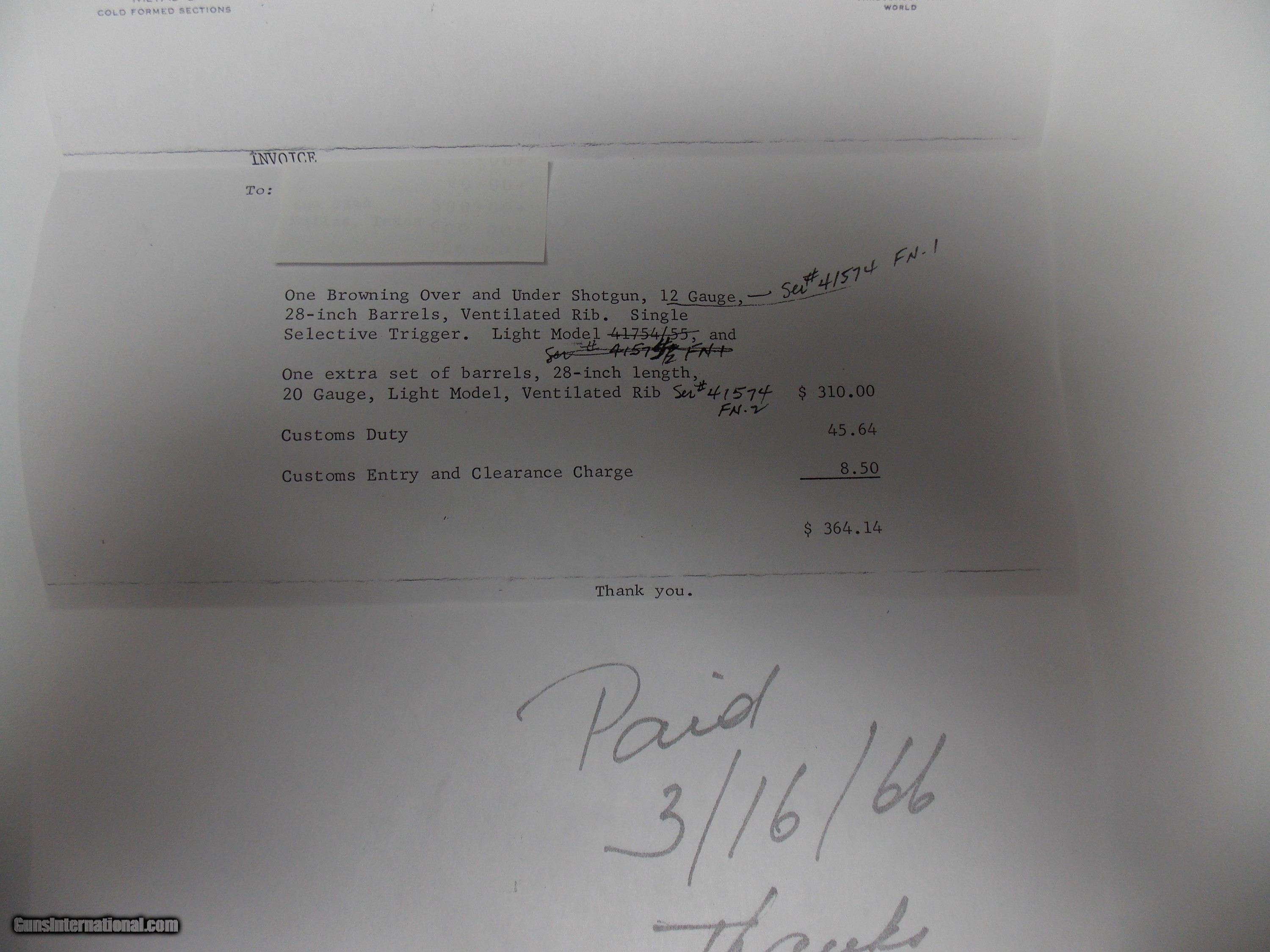 Description: These barrels were part of a Browning Superposed two barrel set shotgun. The barrels are 20 ga. , 28" with factory forend. These are 20ga. barrels for a 12ga. receiver. The factory blue finish is 90-95% with one minor flaw pictured. The bores are excellent. Fixed choked Mod over Imp. Cyl. Wood is very good with the usual light handling, hunting dings. TX DL # engraved on the right underside. Sales letter dated 1966 from Houston, Texas with customs duty fees listed. Email or call with any questions. $15.00 ships to the lower 48 states. No international sales. SOLD |