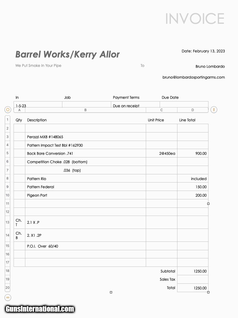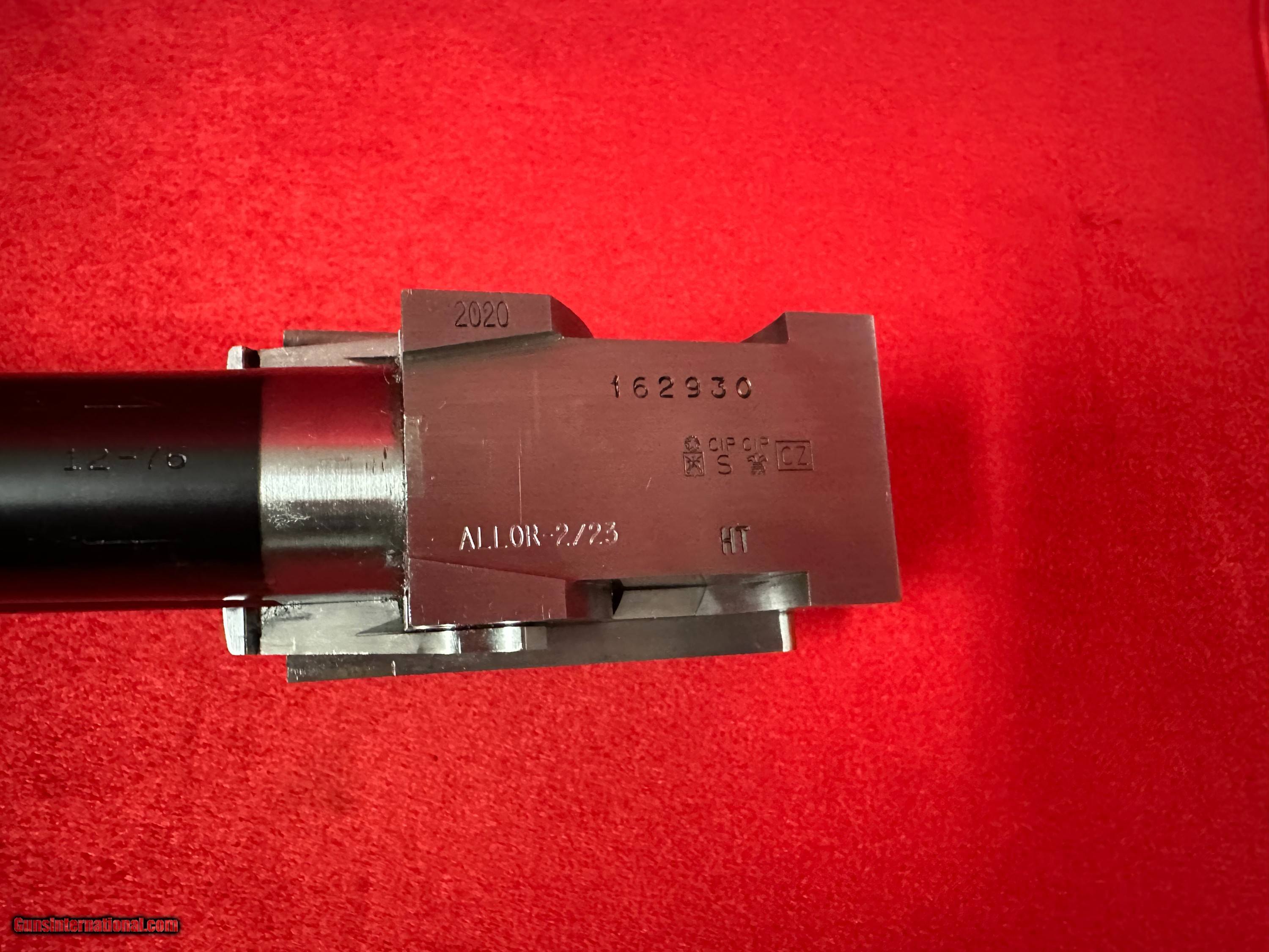 Description: Serial #162XXX. 2020. This was one of my personal barrels, bought it brand new and sent barrel to Kerry Allor to tune the barrel for optimal patterns for pigeons/ZZ’s or bunker. See attached invoice with specs from Kerry Allor and you can see this cost me $1250 and the barrel alone cost me $6500. Barrel has only had 2 boxes of shells fired through it Barrel Specs: 31.5 inch barrel Stamped 1.640kg after Kerry’s work weighs 1.560kg .740 bore Ported Fixed choke .028 bottom and .036 top $6499 SOLD |