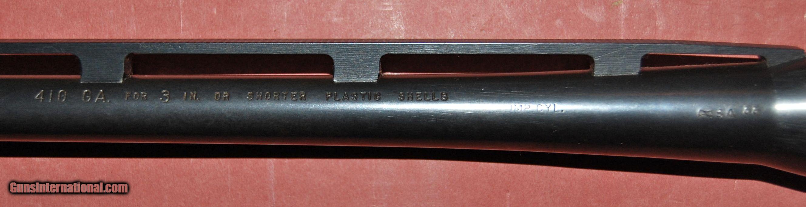 Description: Remington 410 vent rib barrel for the 870 Wingmaster.25" length choked improved cylinder.Chambered for 23/4" or 3" shells.Excellent condition,retaining 99% of the original blue with a mint bore.Very hard to find. SOLD |