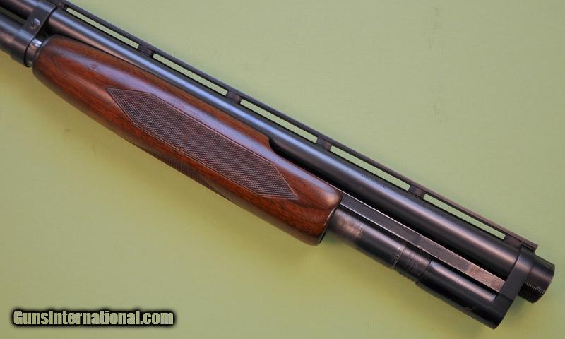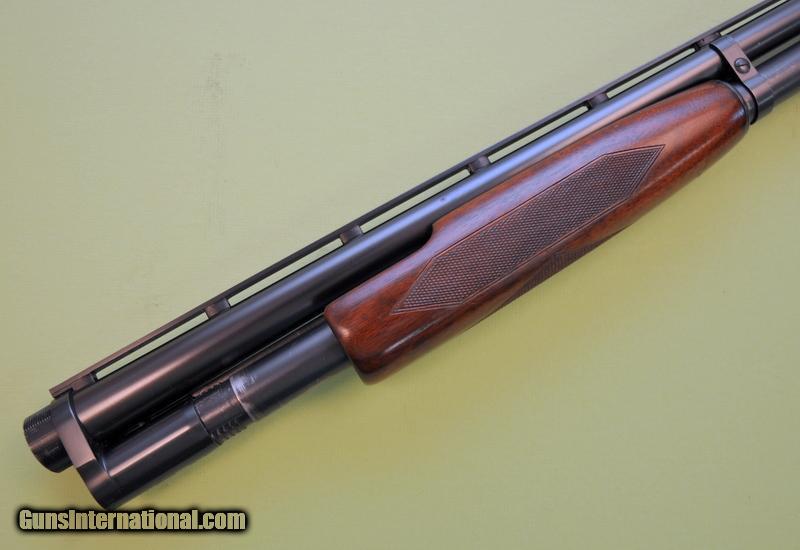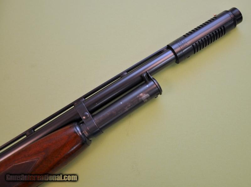 Description: 12 gauge, 2-3/4" chamber. Milled vent rib Skeet barrel, original choke was "WS-1". 26-1/2" length over Cutts Compensator with spreader tube. Ivory front & mid beads. Receiver extension has added pigeon and SN 1496110. Checkered walnut beavertail target forend has lightly worn original finish showing some small dents & marks. Bbl & mag tube retains 90% original blue. Very good bore. SOLD |