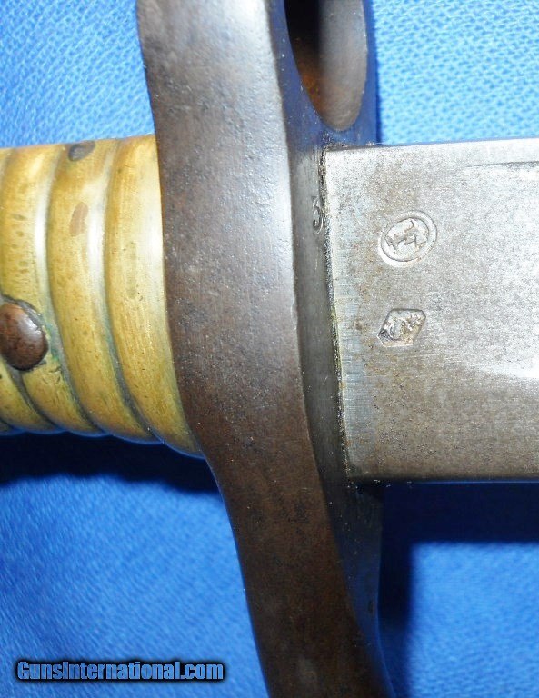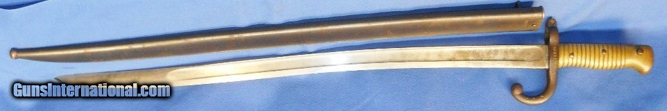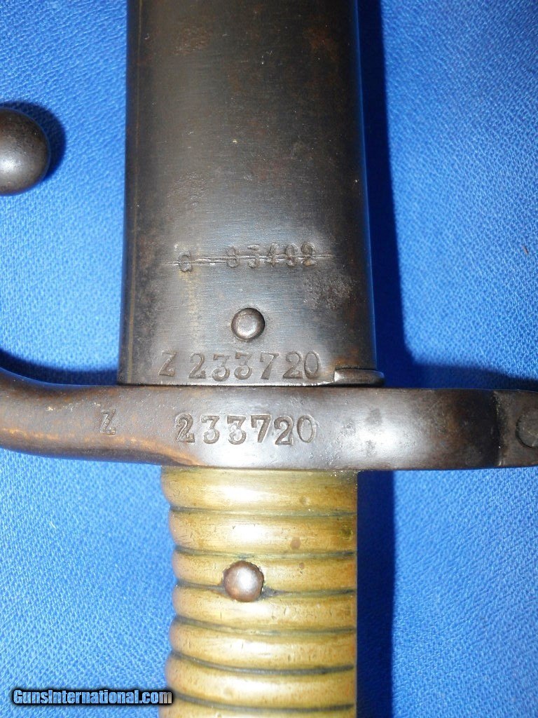 Description: BEST FOR LESS ! FRENCH MODEL 1866 CHASSEPOT MILITARY RIFLE SWORD BAYONET SERIAL # Z 233720. DATED 1872 ON BACK OF BLADE. ABOUT 28" OVERALL IN SCABBARD WITH 22 5/8" BLADE. BLADE IS BRIGHT WITH A LITTLE LIGHT SURFACE STAIN. SCABBARD SHOWS SPOTS OF SCATTERED OXIDATION & STAIN, NO DENTS. A SOLID & TIGHT WEAPON OVERALL, AS PICTURED. SHIPS DIRECT DIRECT TO BUYER ANYWHERE ALLOWED $ 21.00 PRIORITY INSURED. INTERNATIONAL S&H DEPENDS ON DESTINATION. SOLD |