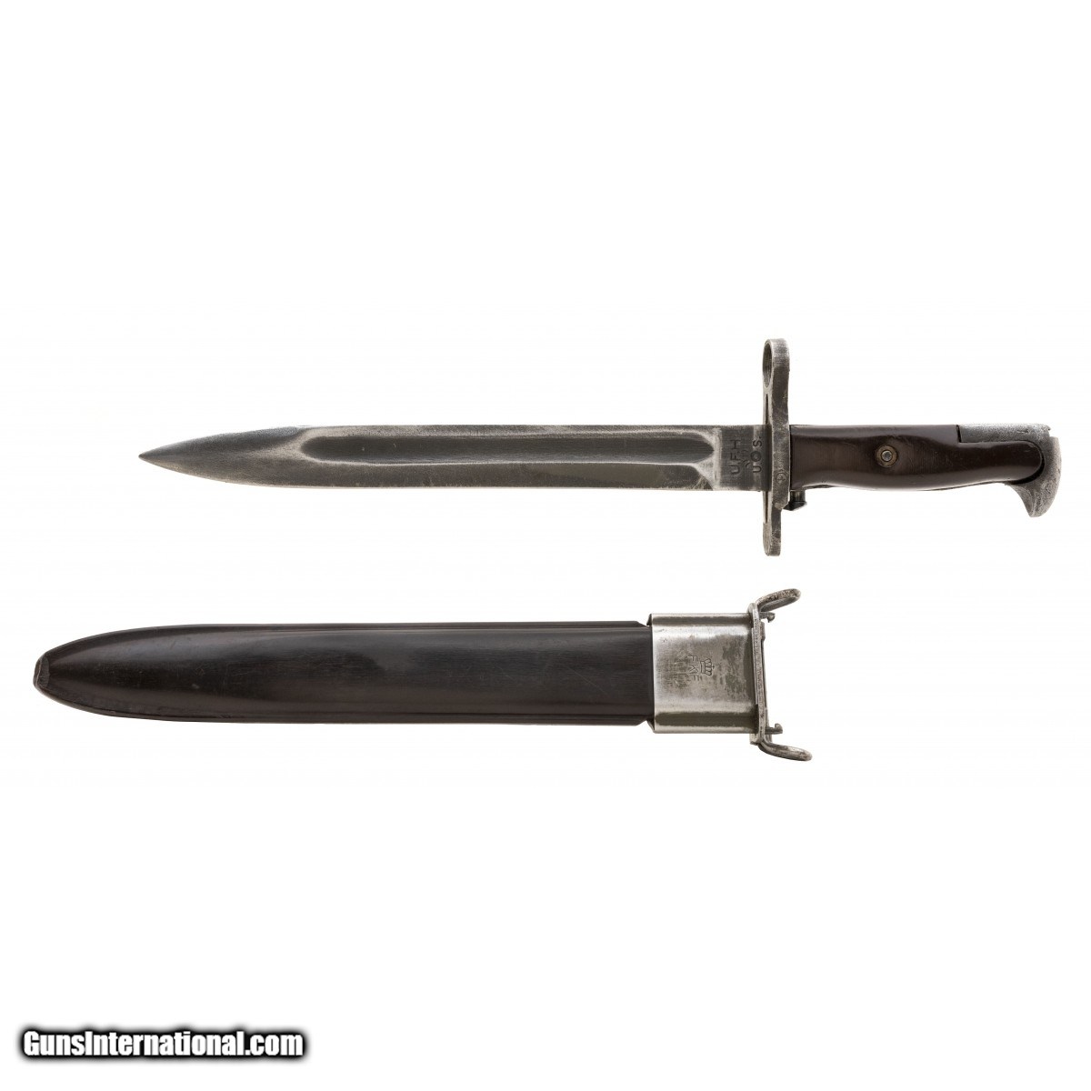 Description: " 10"" Garand Bayonet in good condition.Scabbard is made in Denmark.Blade is marked U.F.H.and stamped US. SOLD |