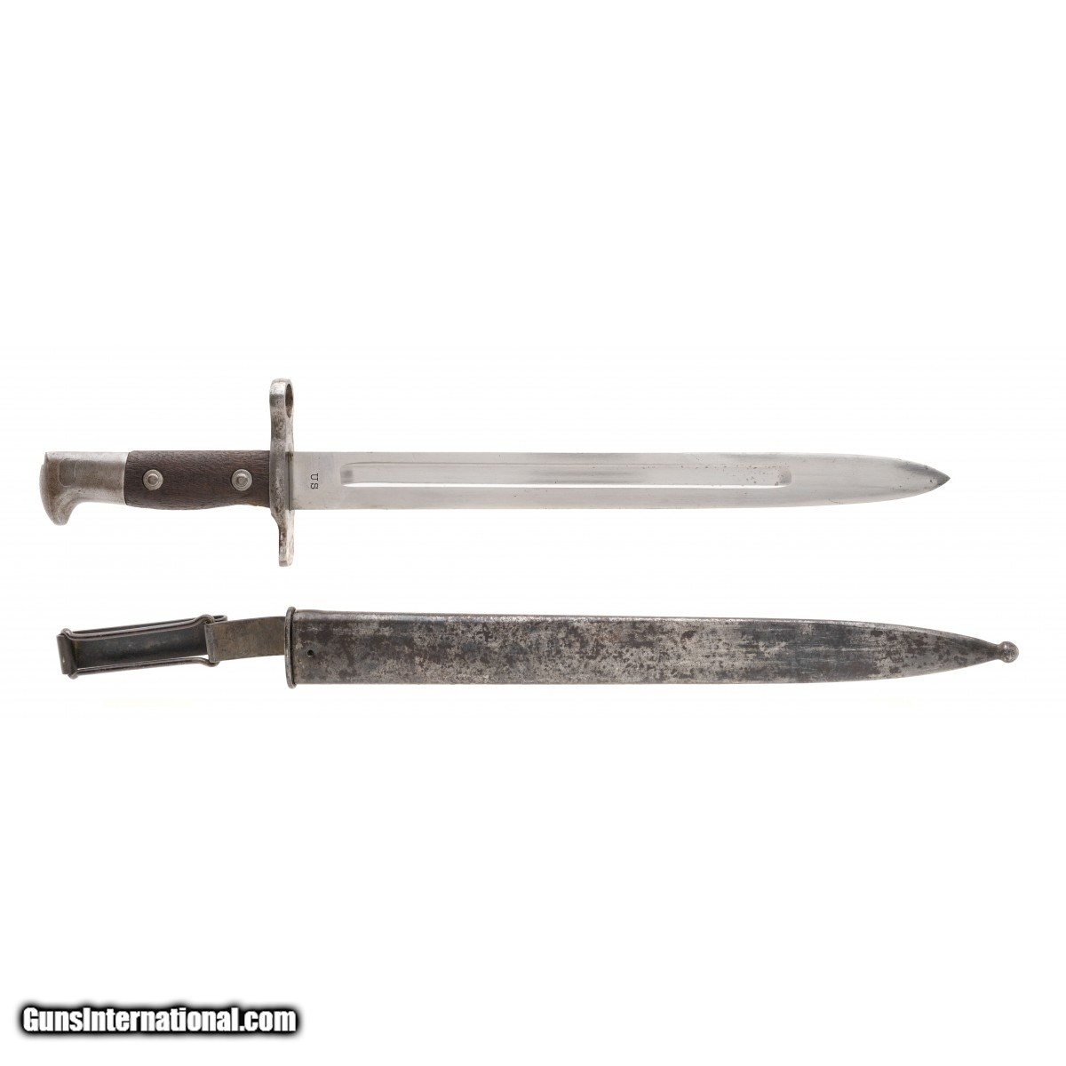 Description: "Made in 1903 U.S Krag bayonet with scabbard. Overall length is 17.5"". Blade length is 11.5"" Overall condition is very good the brown oxidation on scabbard. SOLD |