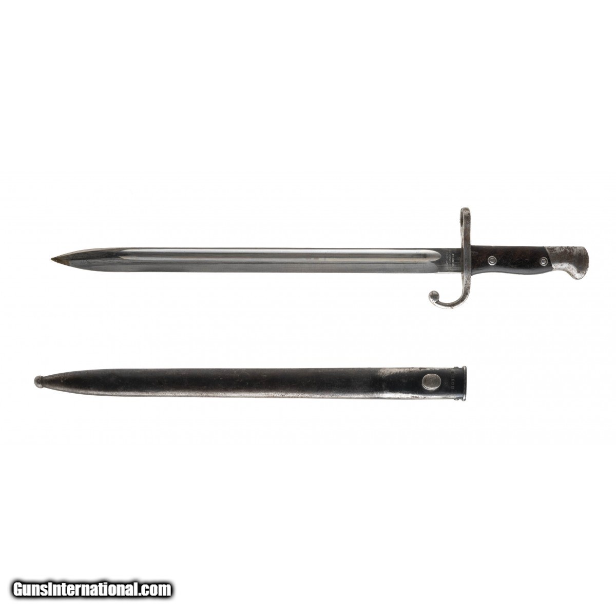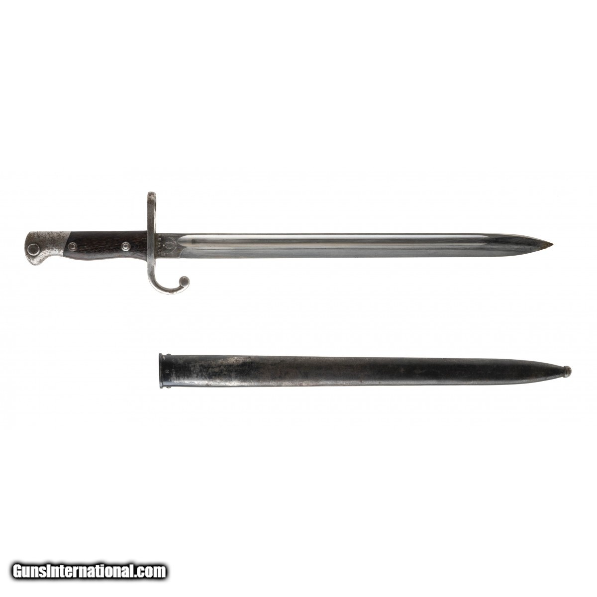 Description: " Argentine M1909 Bayonet with blade length of 15.75"" and Overall length of 20.5"". Blade is in excellent condition. Handle is in very good condition. Comes with scabbard that is in good condition with spots of gray patina. (CONSIGNMENT) SOLD |