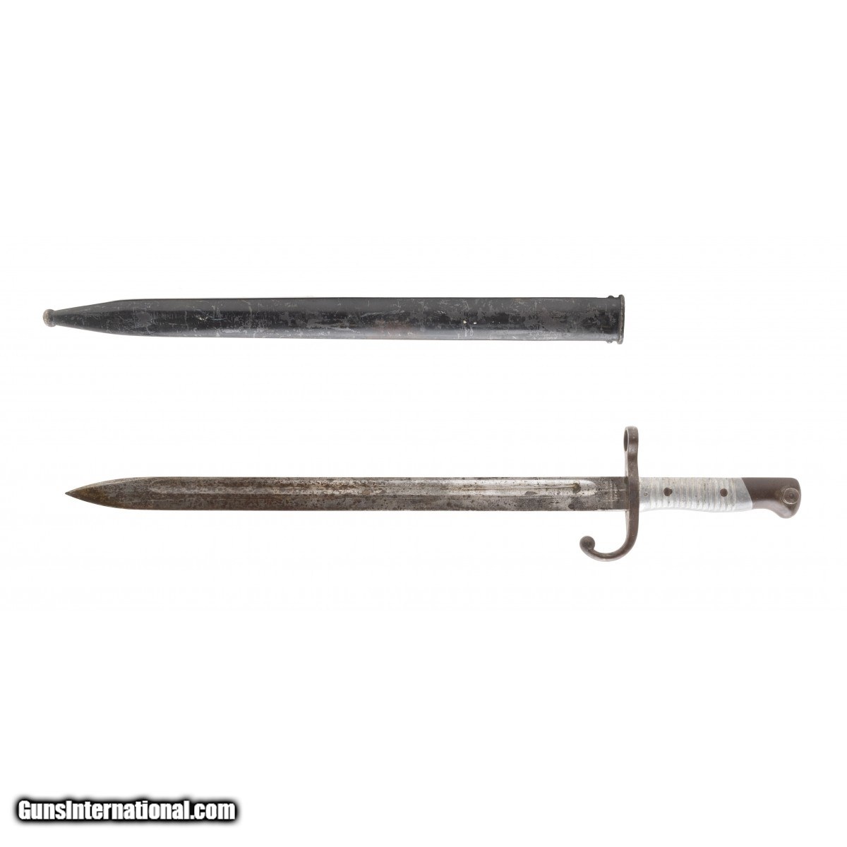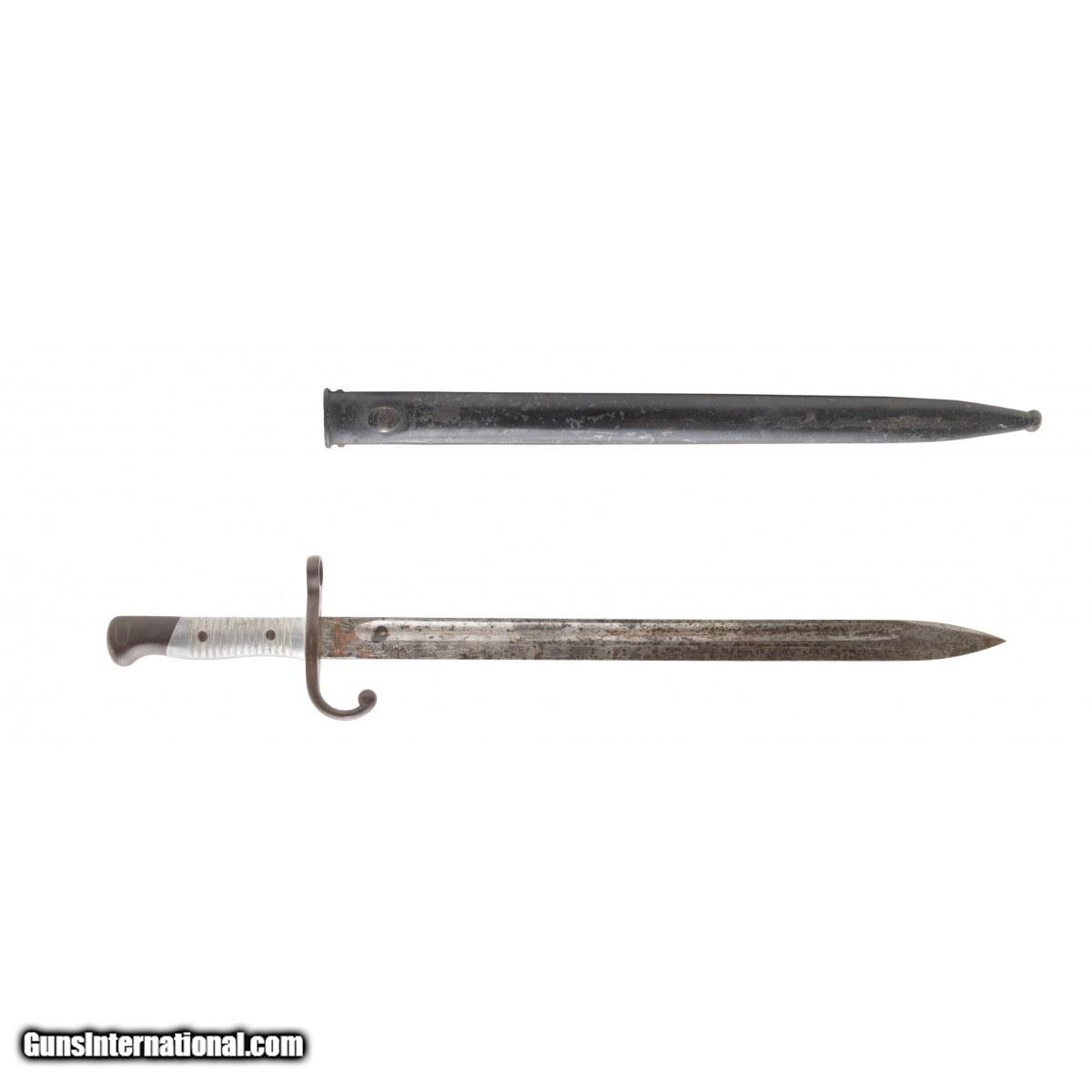 Fits the 1891 rifle. Scabbard is matching. Blade has etching and is turning a patina color. Crest is ground. Good overall condition.