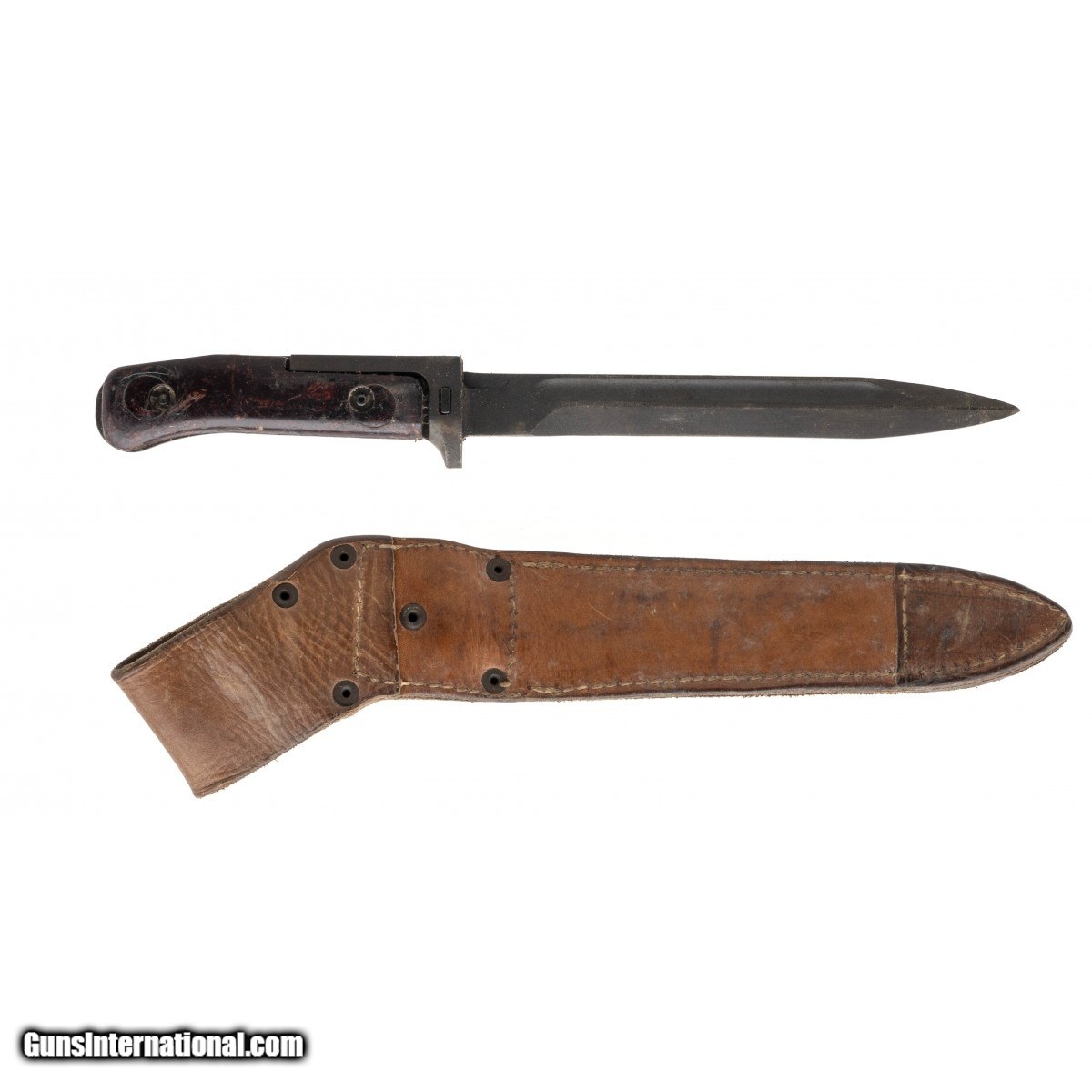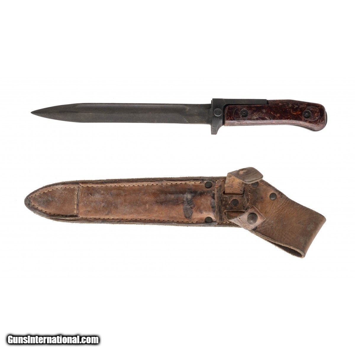Description: "Czech Vz.58 assault rifle bayonet with a leather sheath. Overall length is 11.5-inches with a 6.75-inch blade. Consignment SOLD |