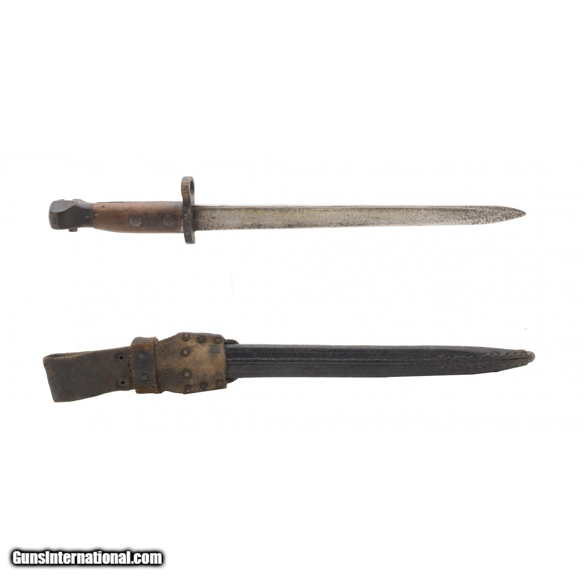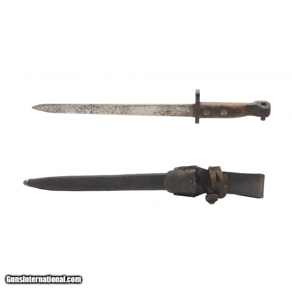 Description: " Fits the Dutch Mannlicher 1895 rifles. Blade has pitting. Overall bayonet and leather are in relic condition. SOLD |