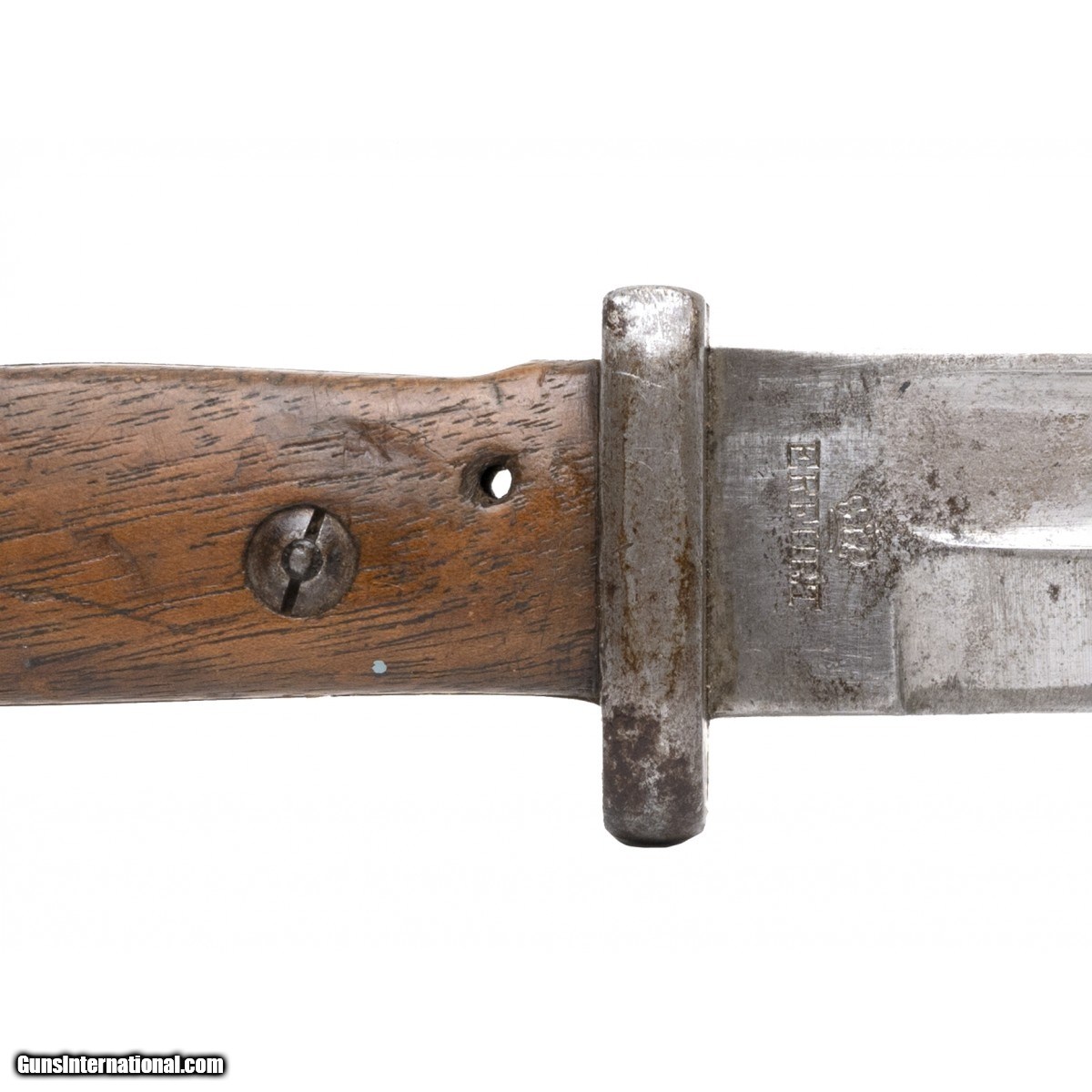 Description: " Scarce early '98 bayonet. Converted from model 1871/84 bayonets. Spine has an 1889 date. Guard is unit marked 10.R.3.164. Ricasso is marked Erfurt. Scabbard is a later replacement. Hard to find! SOLD |