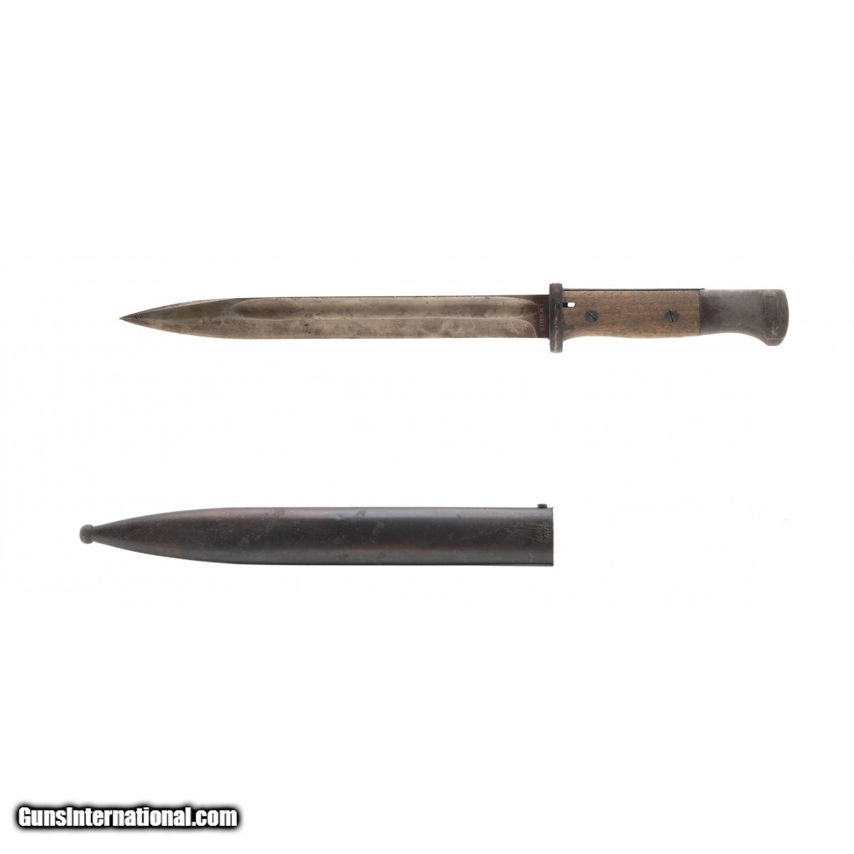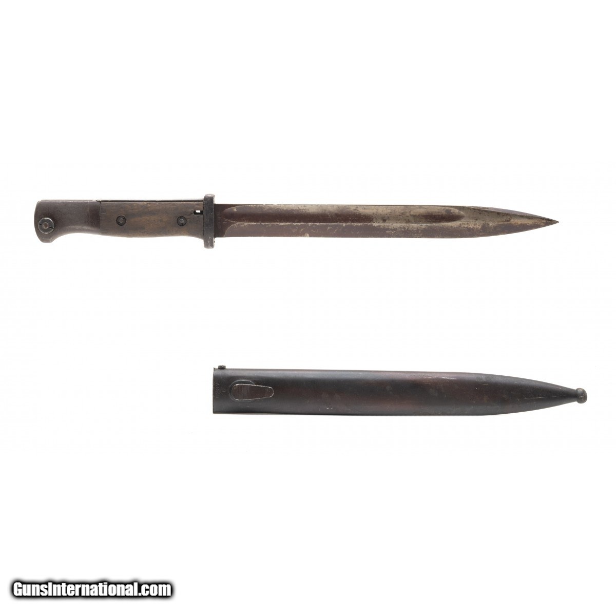 Description: " German WWII bayonet dated 1939 on spine and non-matching scabbard is dated 1937. Ricasso is makred ""F.W. Holler"". Scabbard is S/174 marked. Good overall condition. SOLD |
