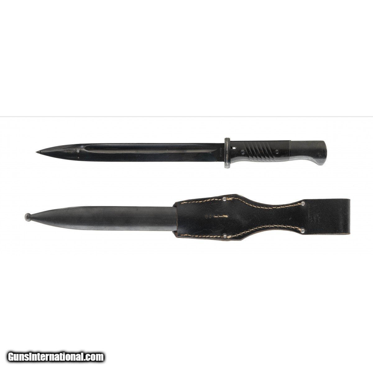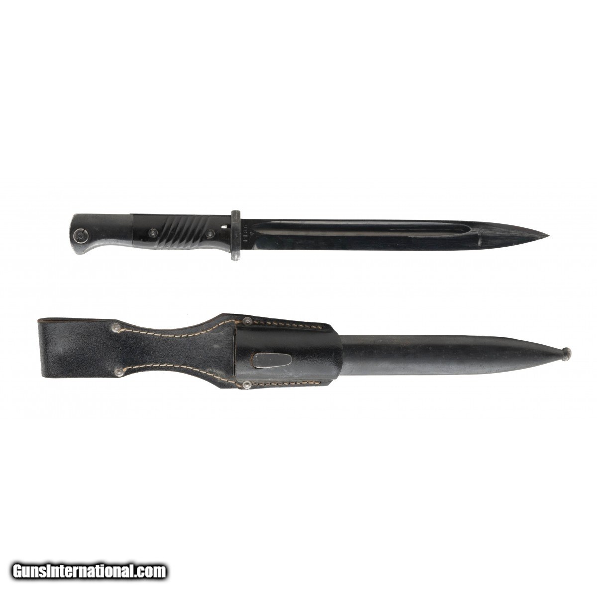 Description: " German Kar98k Mauser carbine bayonet in excellent condition marked ""41asw"" on the blade. Comes with original leather frog which is also in excellent condition. SOLD |