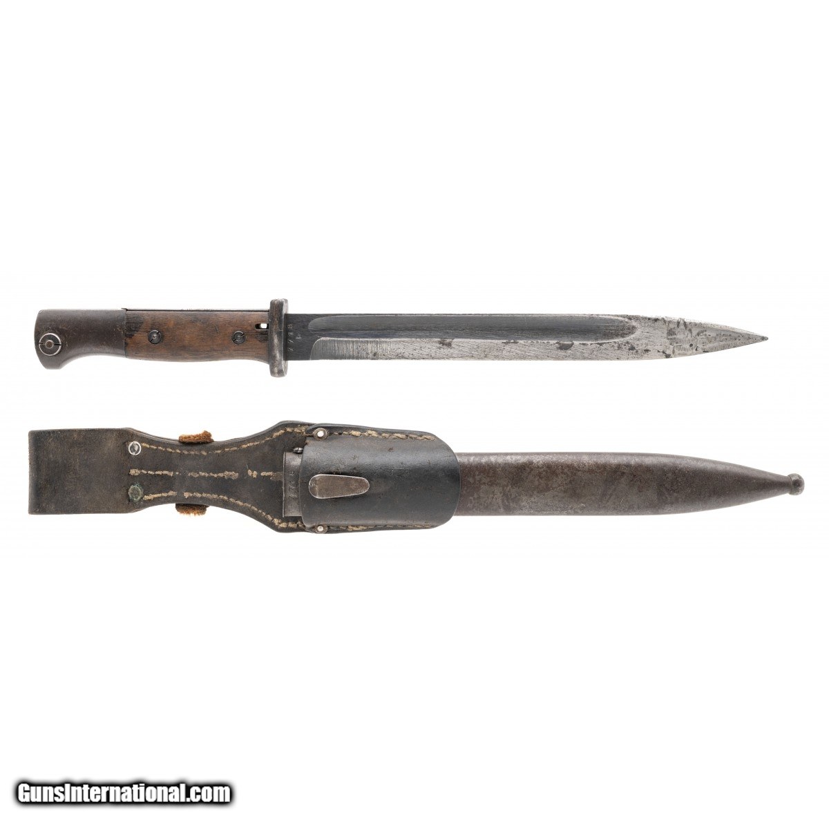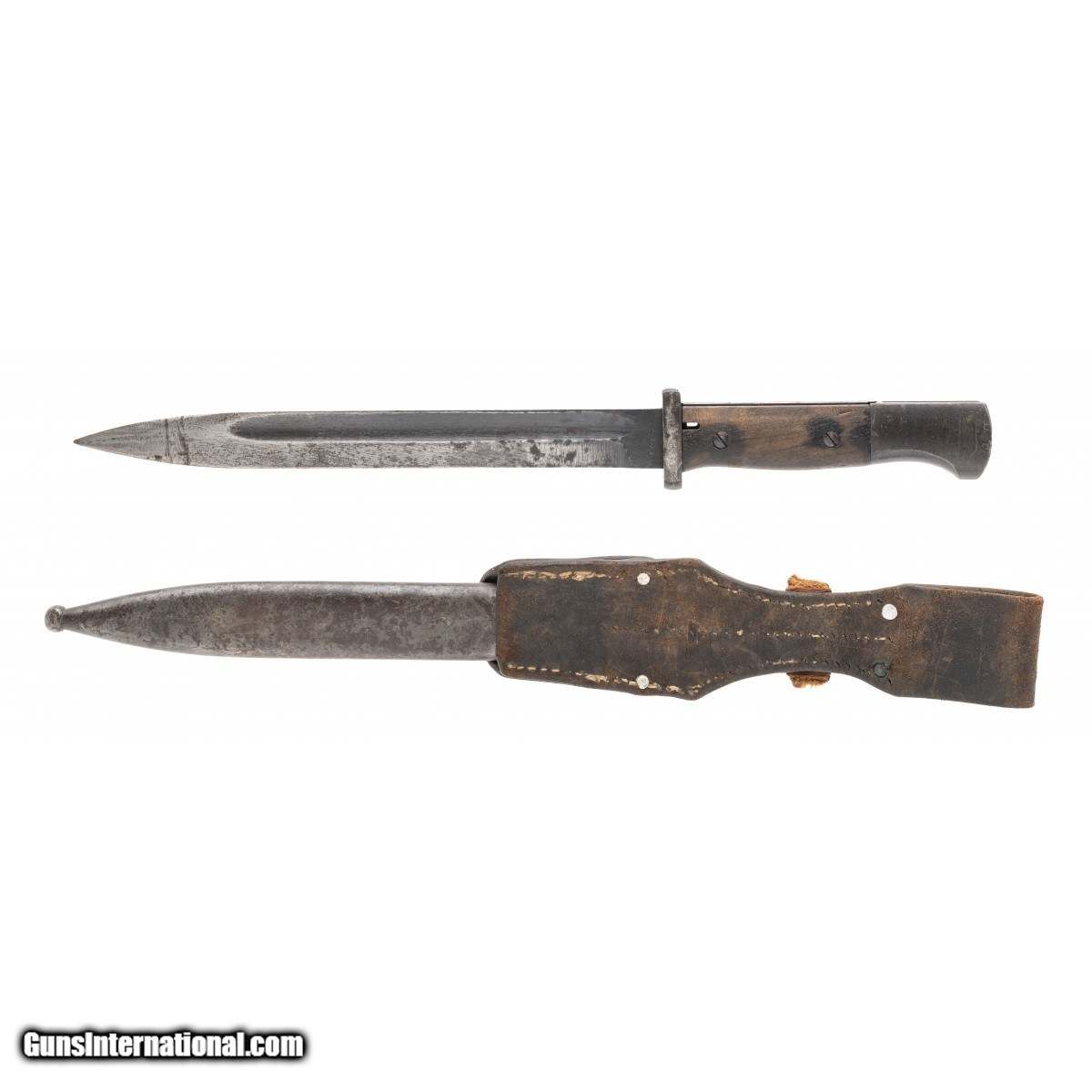 Description: " M1884/98 Mauser bayonet with matching scabbard and frog. Blade measures 10"" with an overall length of 15"". Blade is in good condition with scabbard wear present. Scabbard has brown patina throughout. Overall condition is good. SOLD |