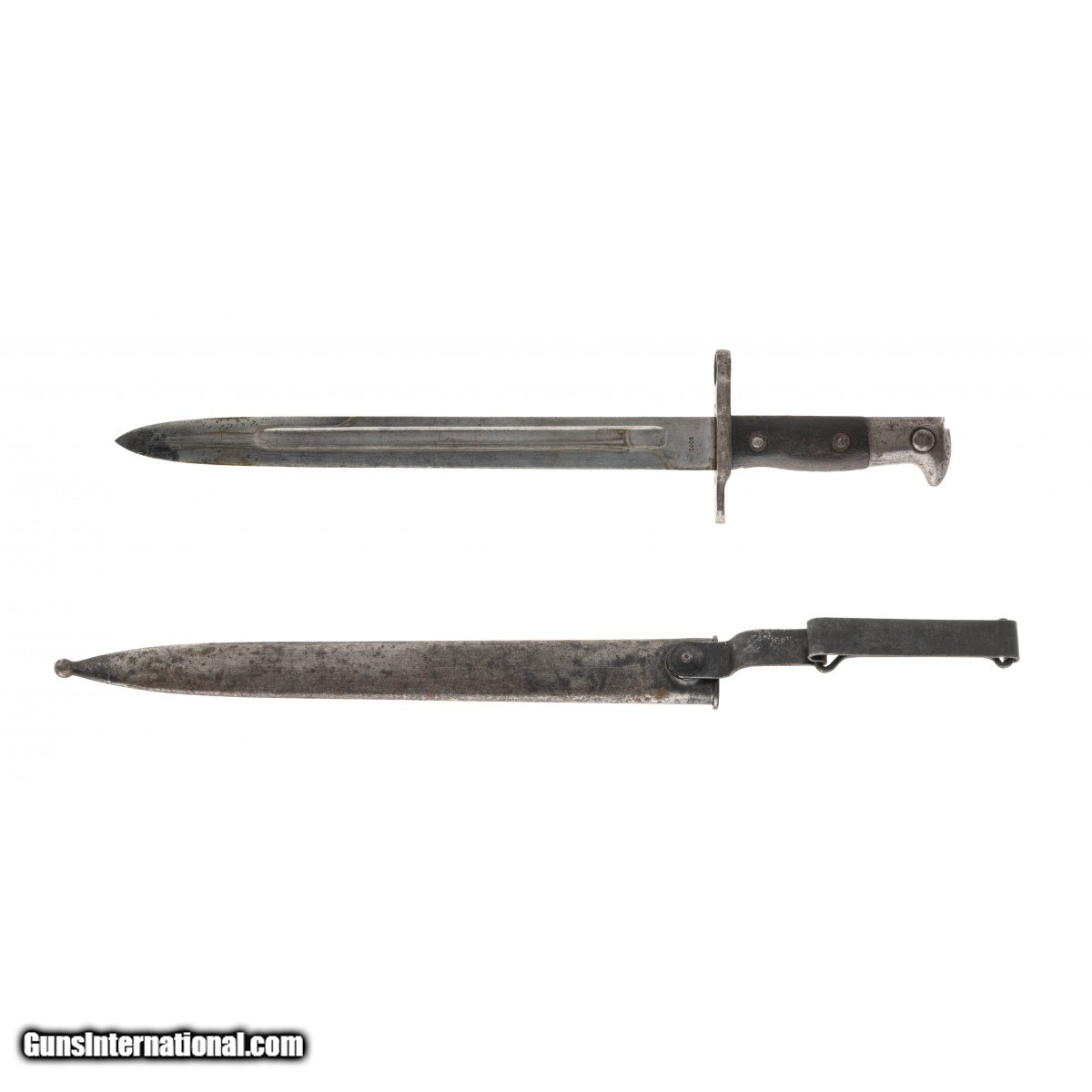 Description: " Krag Jorgensen Bayonet with scabbard. Blade is stamped 1903. Blade measures 11.5"" with an overall length of 16"". Blade condition is very good. Handle is in good condition with some handling wear noted. Scabbard is in good condition with a brown/gray patina. Overall condition is very good. Consignment. SOLD |