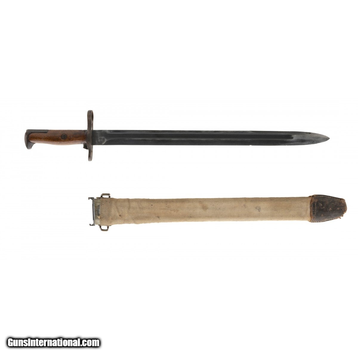 U.S. M1905 16-inch bayonet in very good condition made by Rock Island Arsenal in 1918. Comes with original canvas & wood scabbard in fair condition.