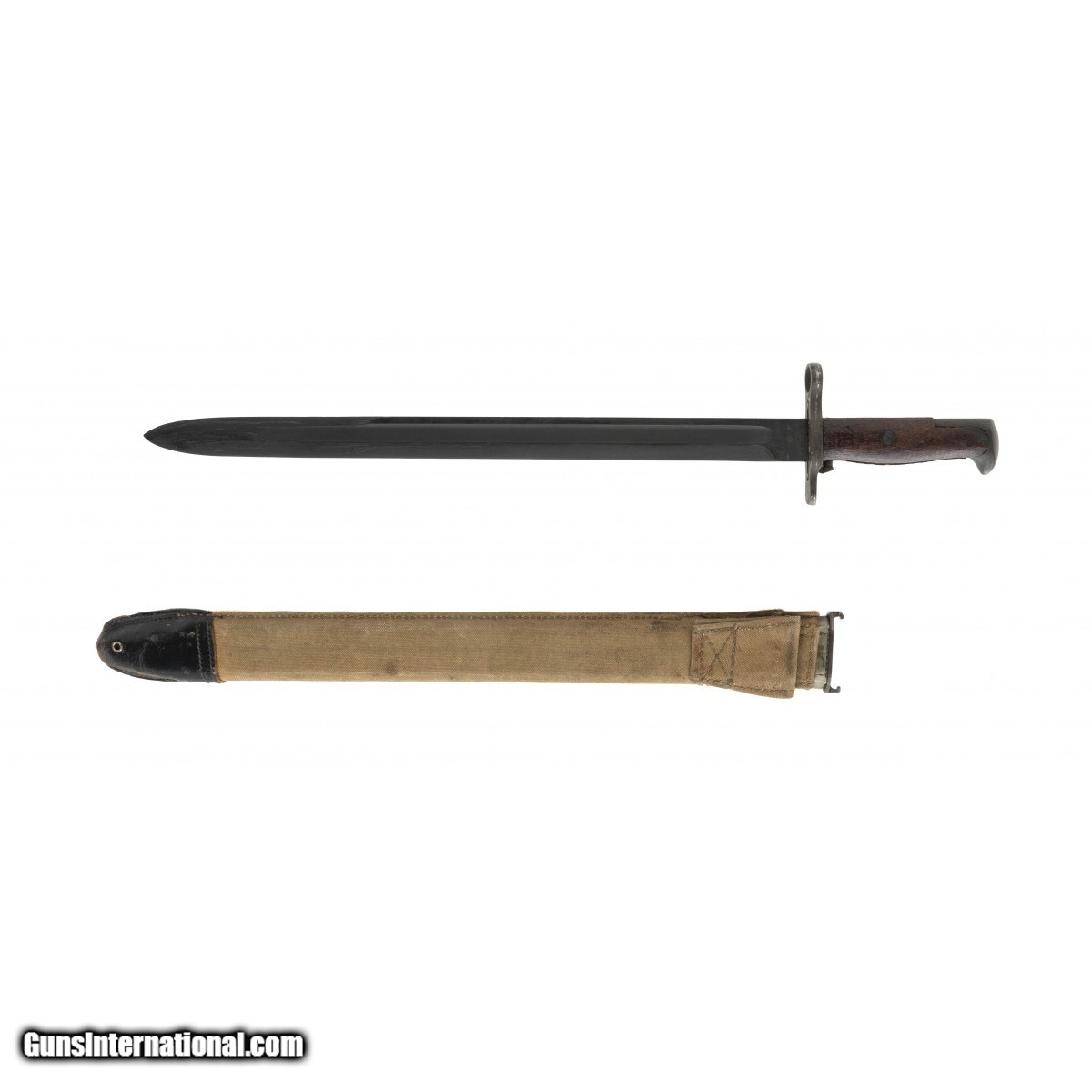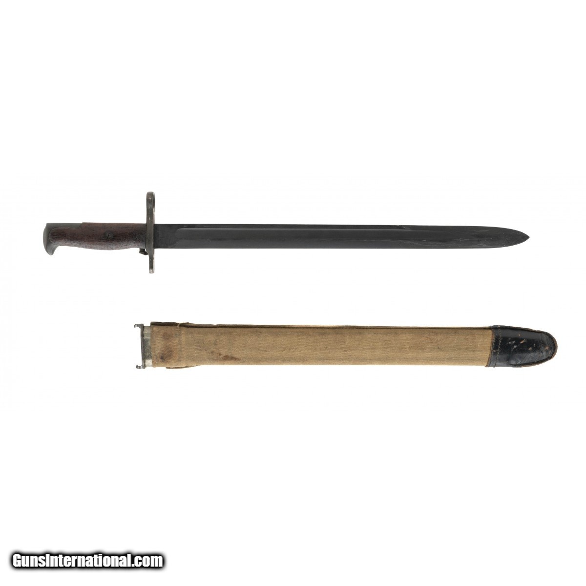 U.S. M1905 16-inch bayonet in excellent condition made by Springfield Armory in 1908. Comes with original canvas & wood scabbard in fair condition with missing belt hanger.