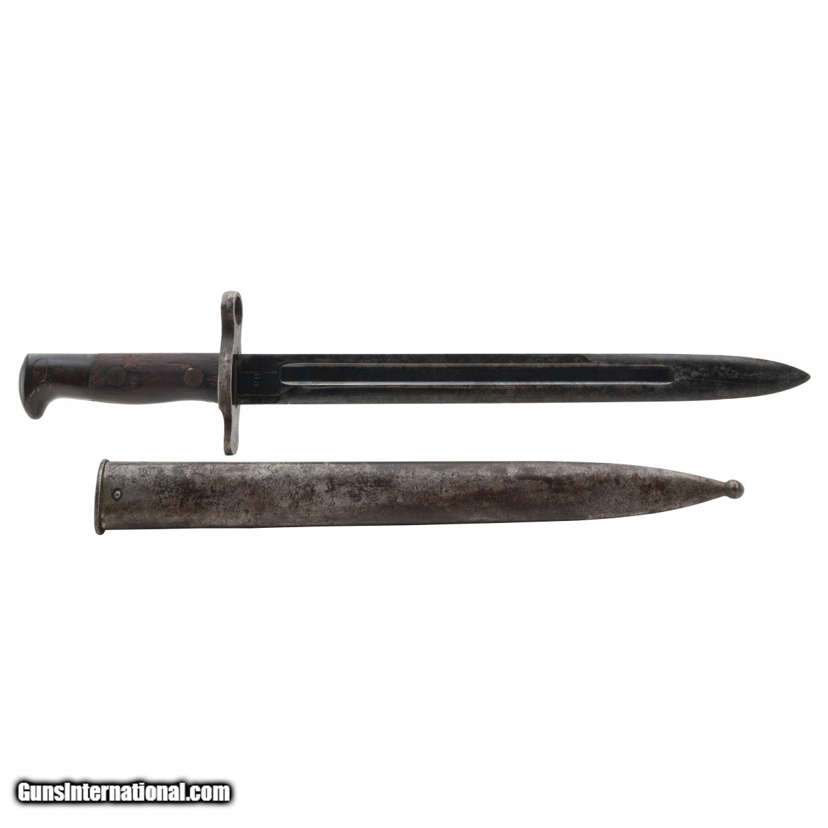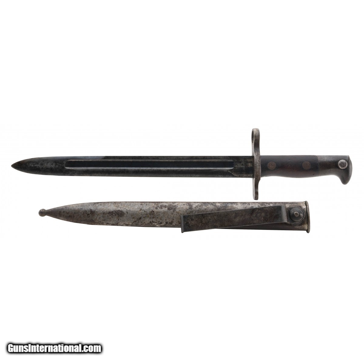 Description: " US 1894 Krag Rifle Bayonet in excellent condition.The early blued blade is dated 1894 on one side US on other.Wood grips have flush rivets that were later changed. SOLD |