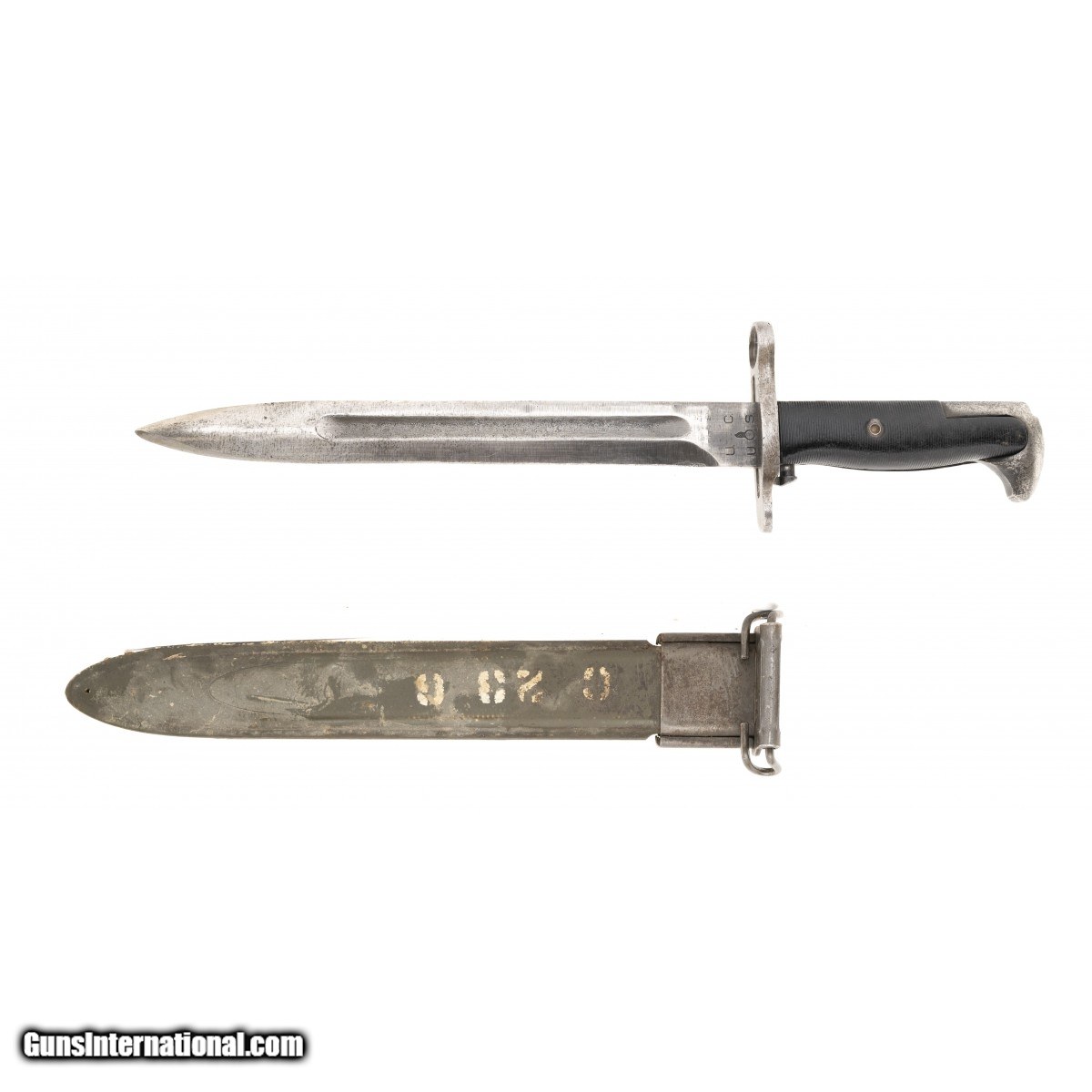 Fits the the M1 Garands and 1903 rifles. Manufactured by Utica Cutlery during WWII. Scabbard is splitting on spin. Fair overall condition.