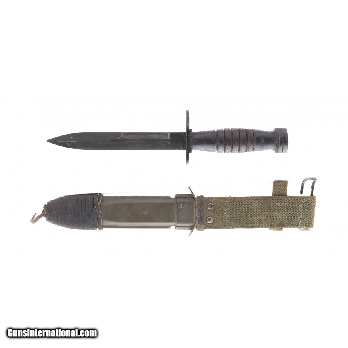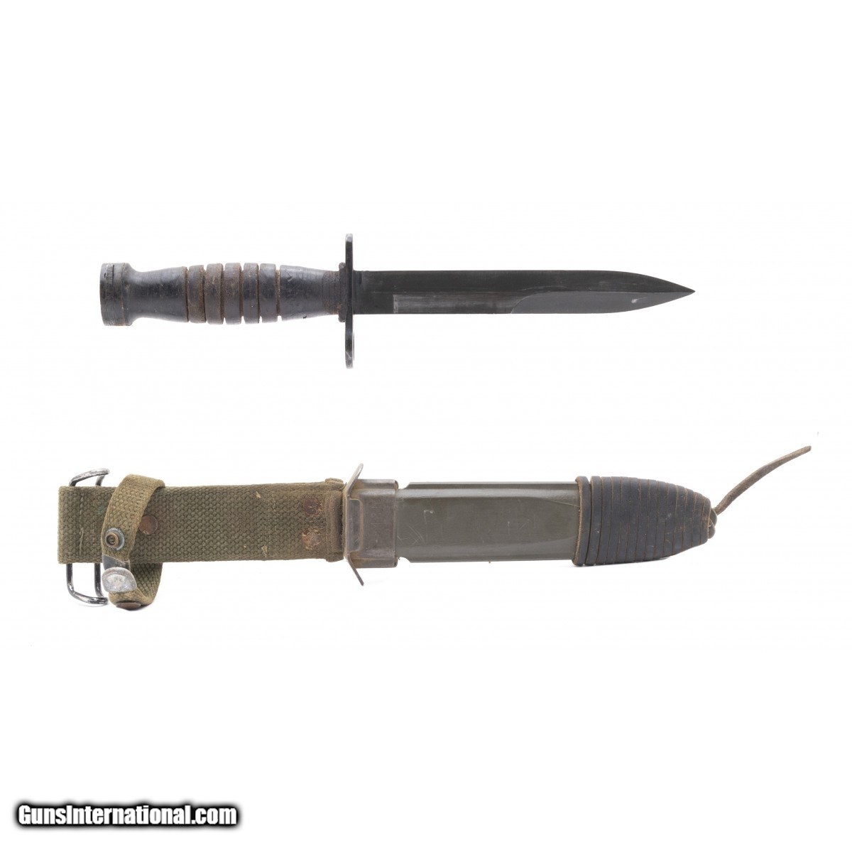 Description: " US M1 Carbine bayonet with wooden grip. Scabbard is marked ""US M8A1 BM Co."". Guard is marked ""US M4 KI"". Very good overall condition. SOLD |