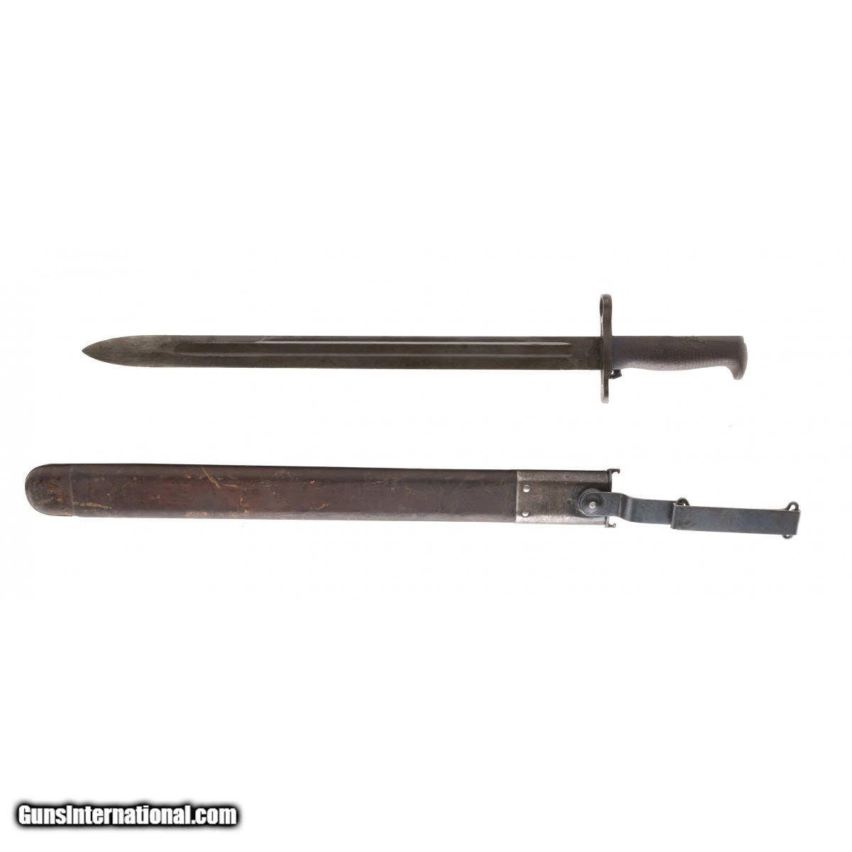Description: " Early style 1903 Springfield rifle bayonet. Blade is made by Springfield in 1908. Early style leather scabbard. Very good overall condition. SOLD |