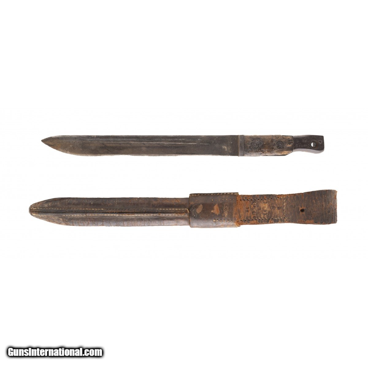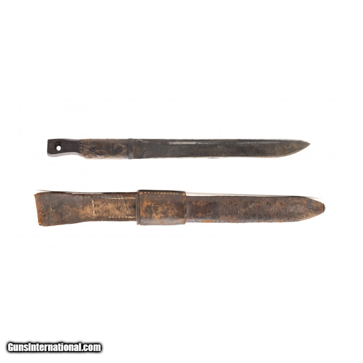 US bayonet for the Ross rifle. Blade has been sharpened. Locking mechanism needs to be replaced. Overall leather and blade are in relic condition. US markings are still visible.
