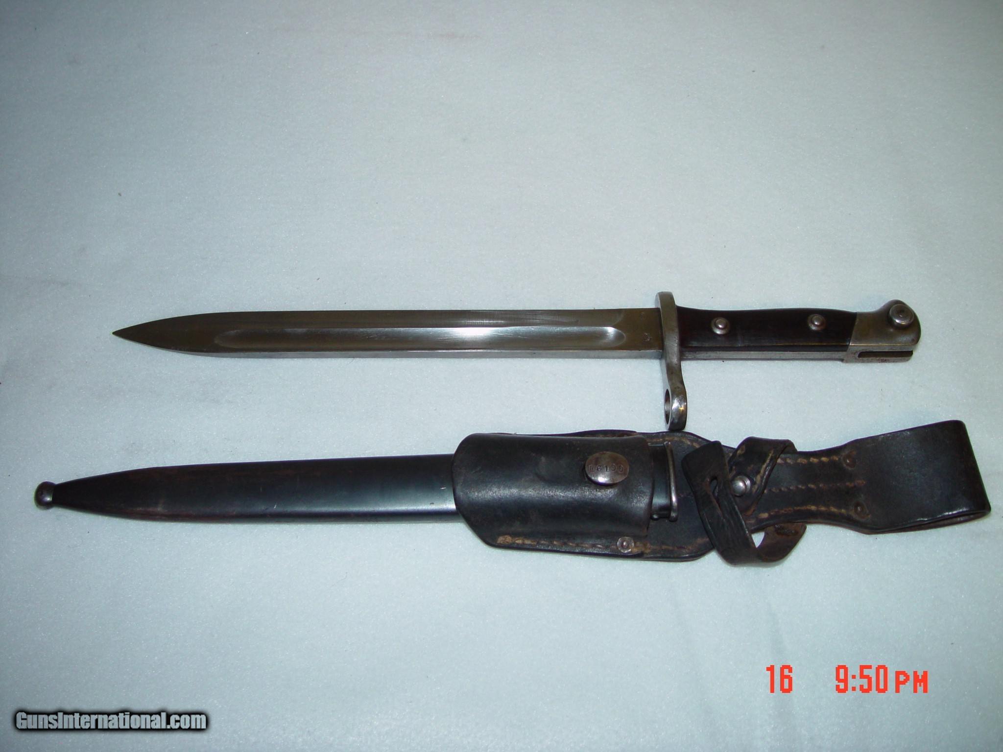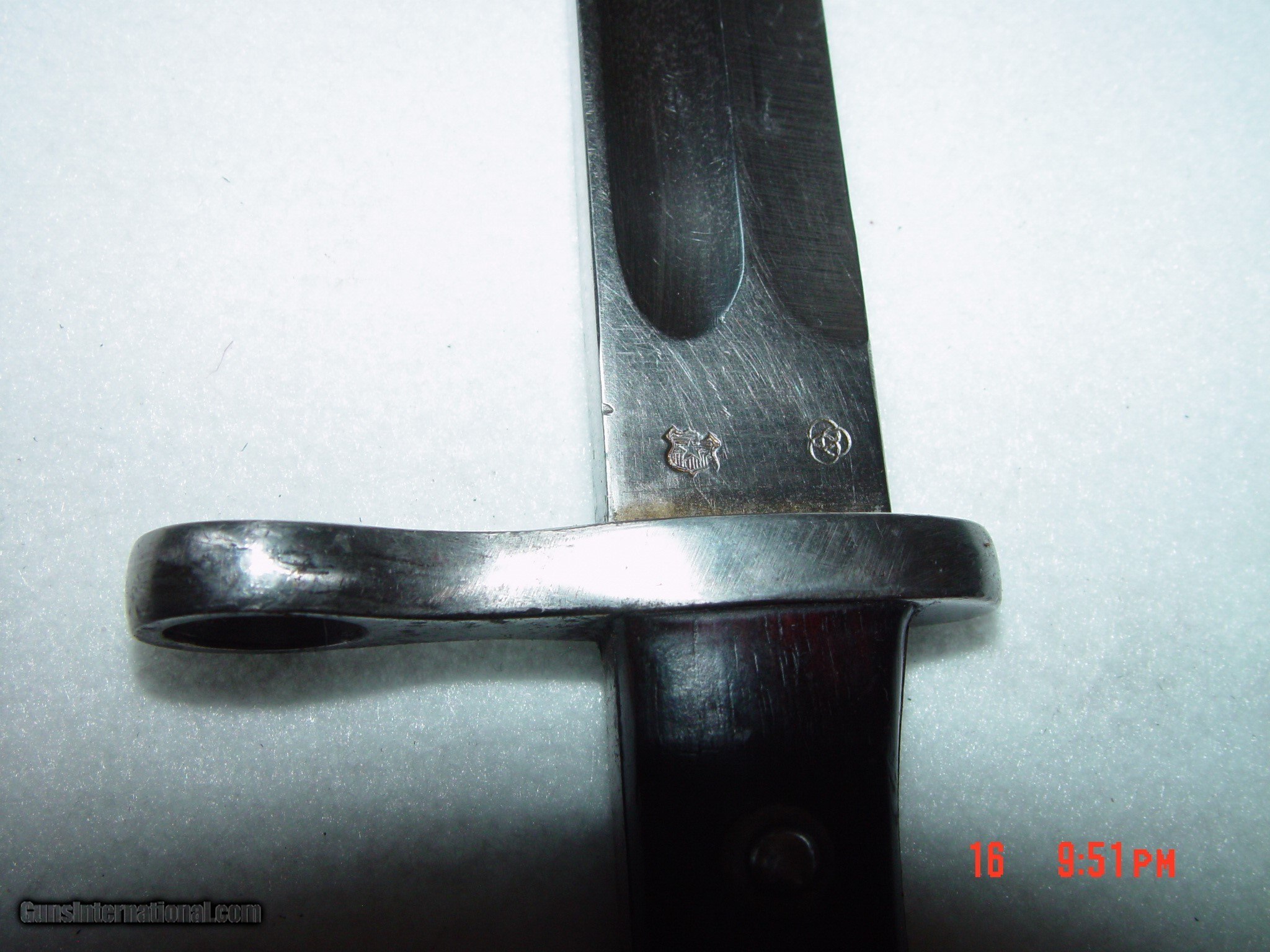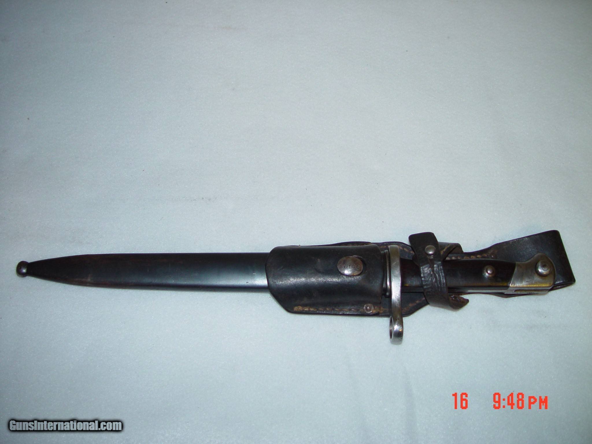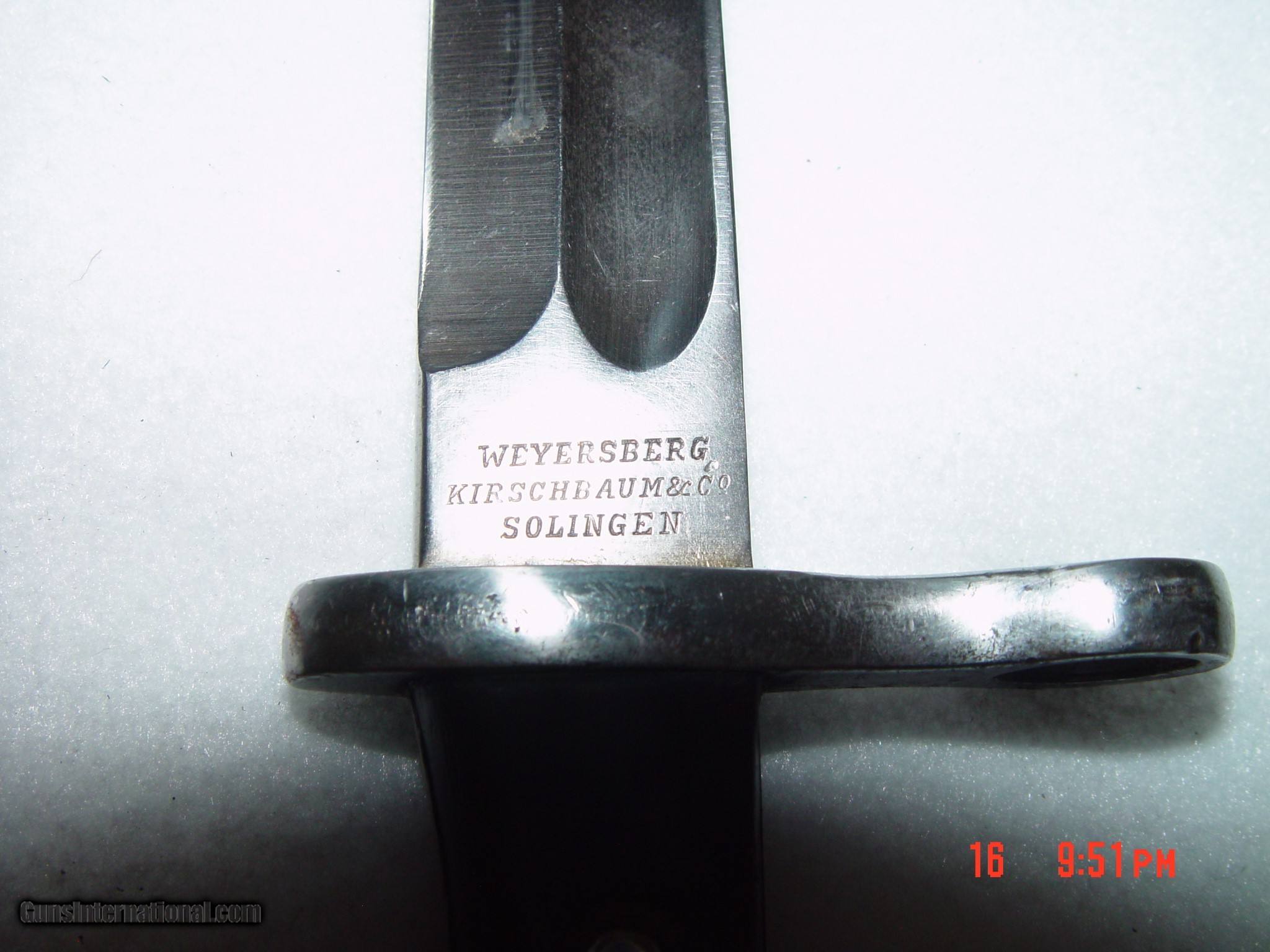 Description: THIS BAYONET HAS A 10" BLADE WITH ACCOPANYING SCABBARD AND FROG. THE BAYONET WAS MADE BY WEYERSBERG KIRSCHBAUM & CO. THERE IS NO RUST ON THE METAL AND THE SCABBARD IS IN OVERALL GOOD SHAPE WITH ONLY A COUPLE STITCHES COMING LOOSE ON THE LOOP FOR THE HANDLE. SOLD |