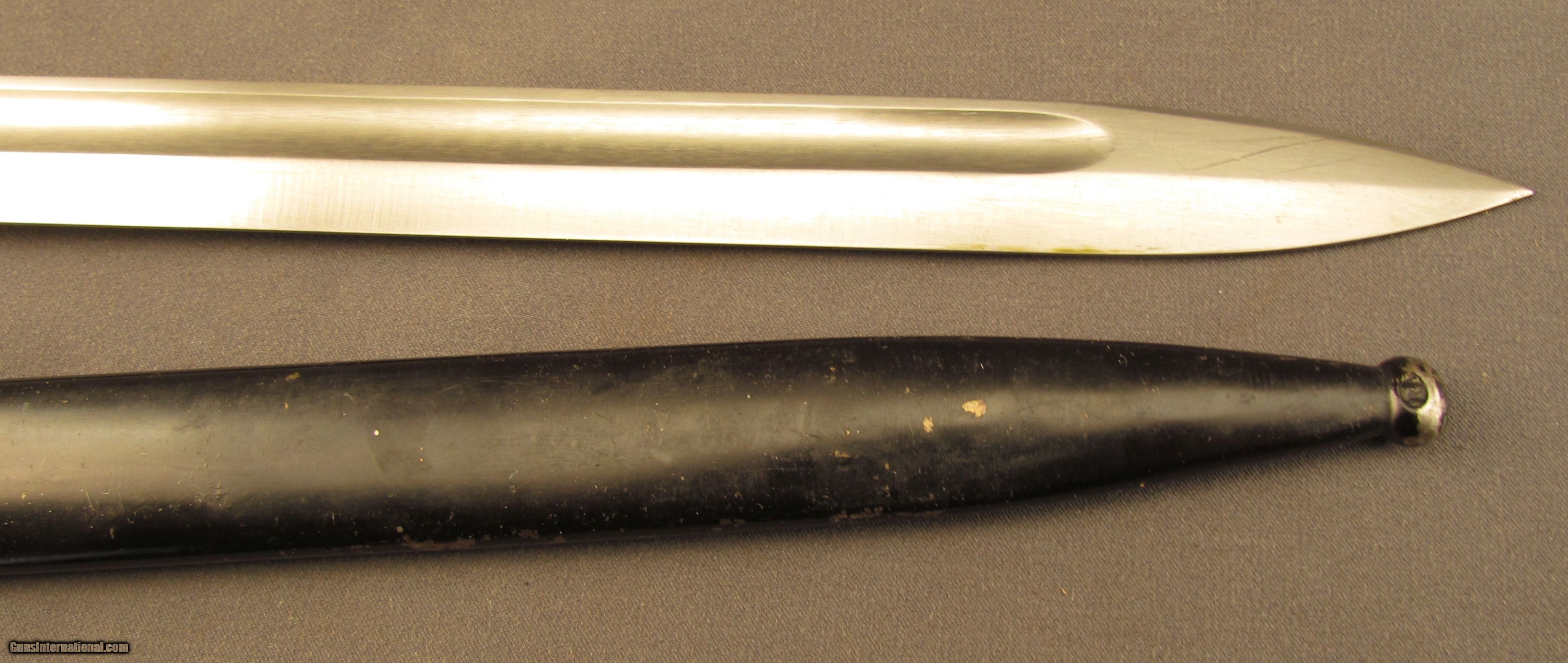 Description: This bayonet is 20 1/2” overall length with a 15 3/4” blade. Serial number on the bayonet and scabbard match. The crest has been ground. Edge has not been sharpened and the bayonet shows little use. “RA” is clearly stamped on the side. Scabbard has been painted black and retains about 90% coverage with some flaking. Tip is marked “RA” and there is a “DX” on the side. Solid example. SOLD Manufacturer: Argentine Model: Bayonet |