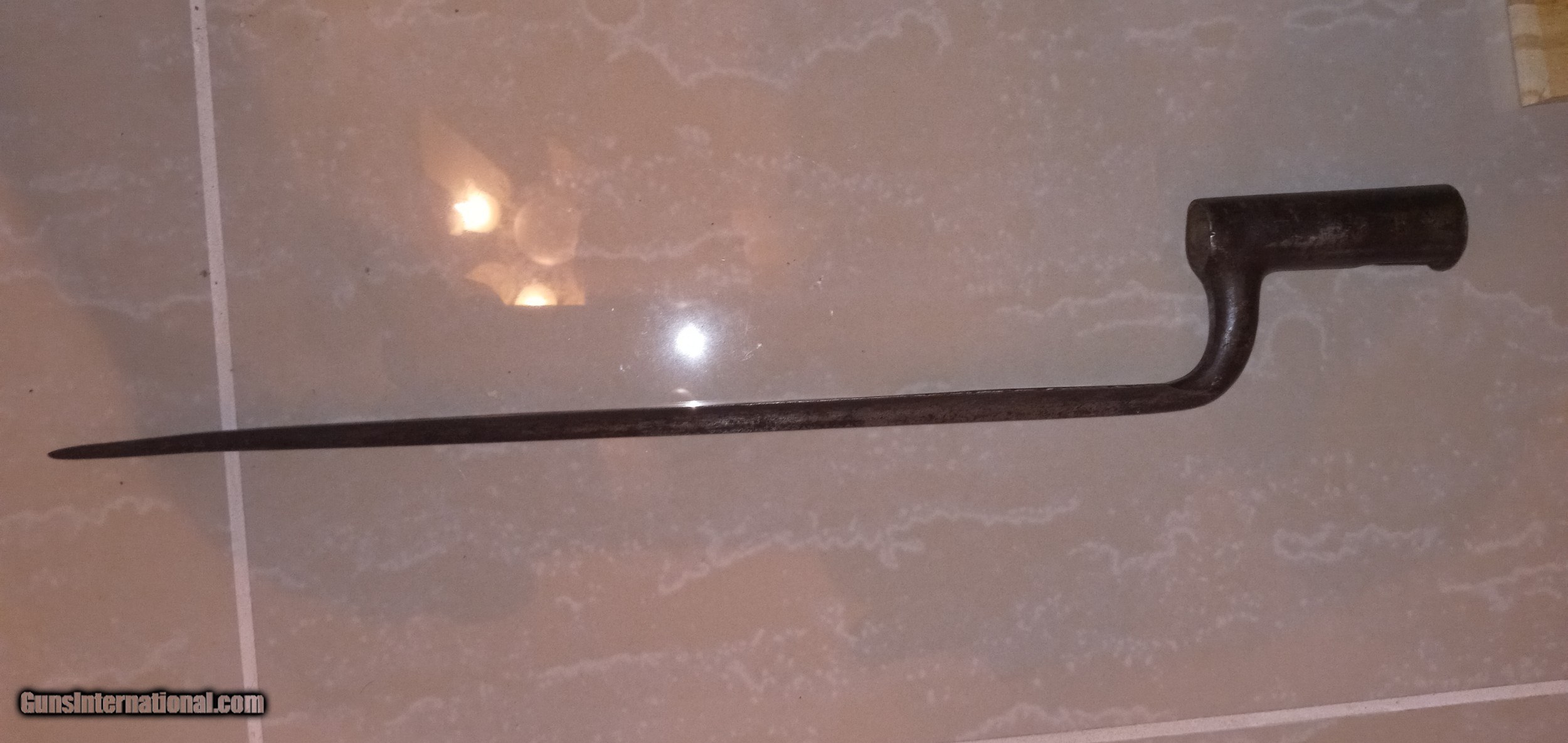 Description: us bayonet around 1800 overall 18.5 in 15in blade mussel ring .860 marked us some pitting lightpitina no cracks SOLD |