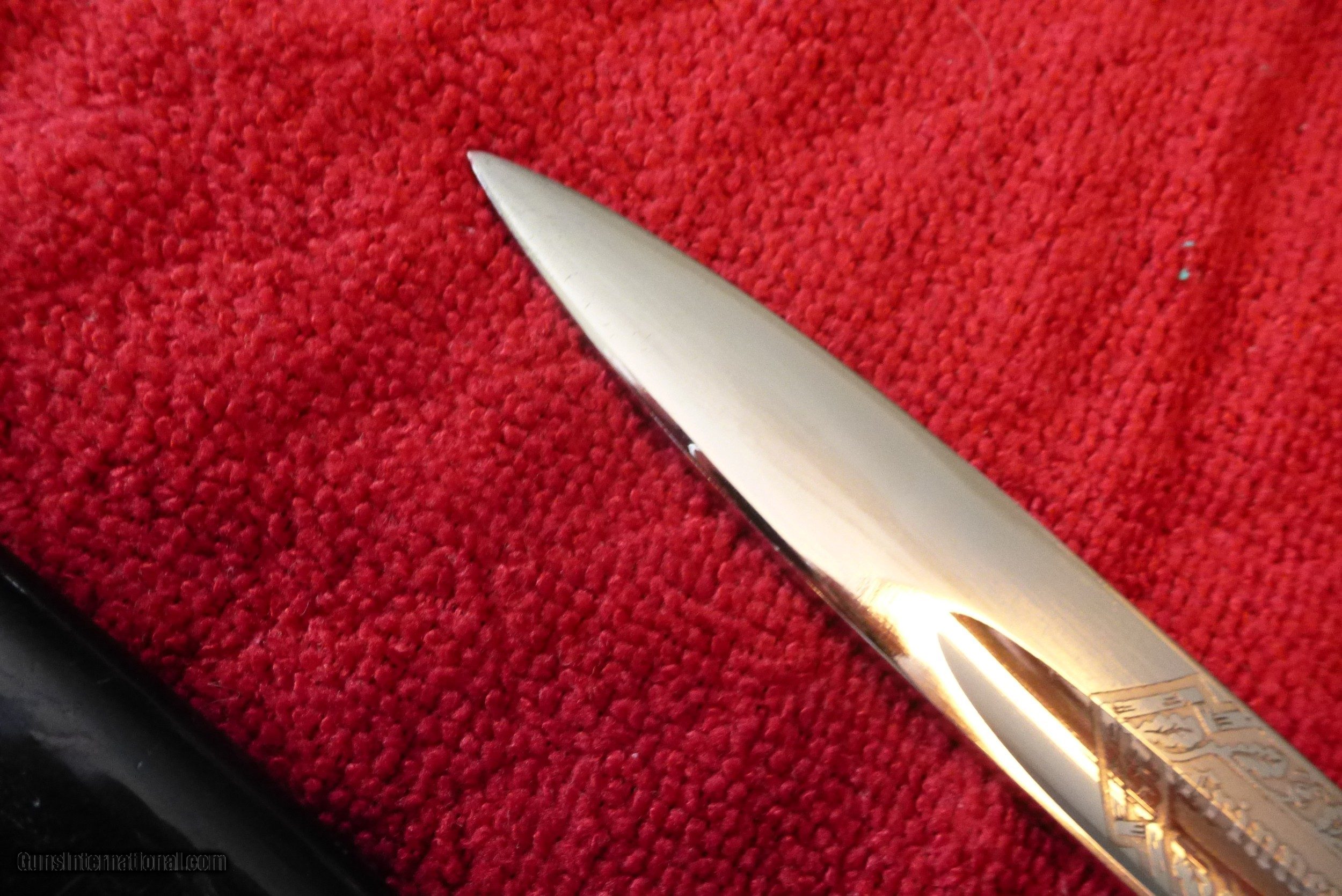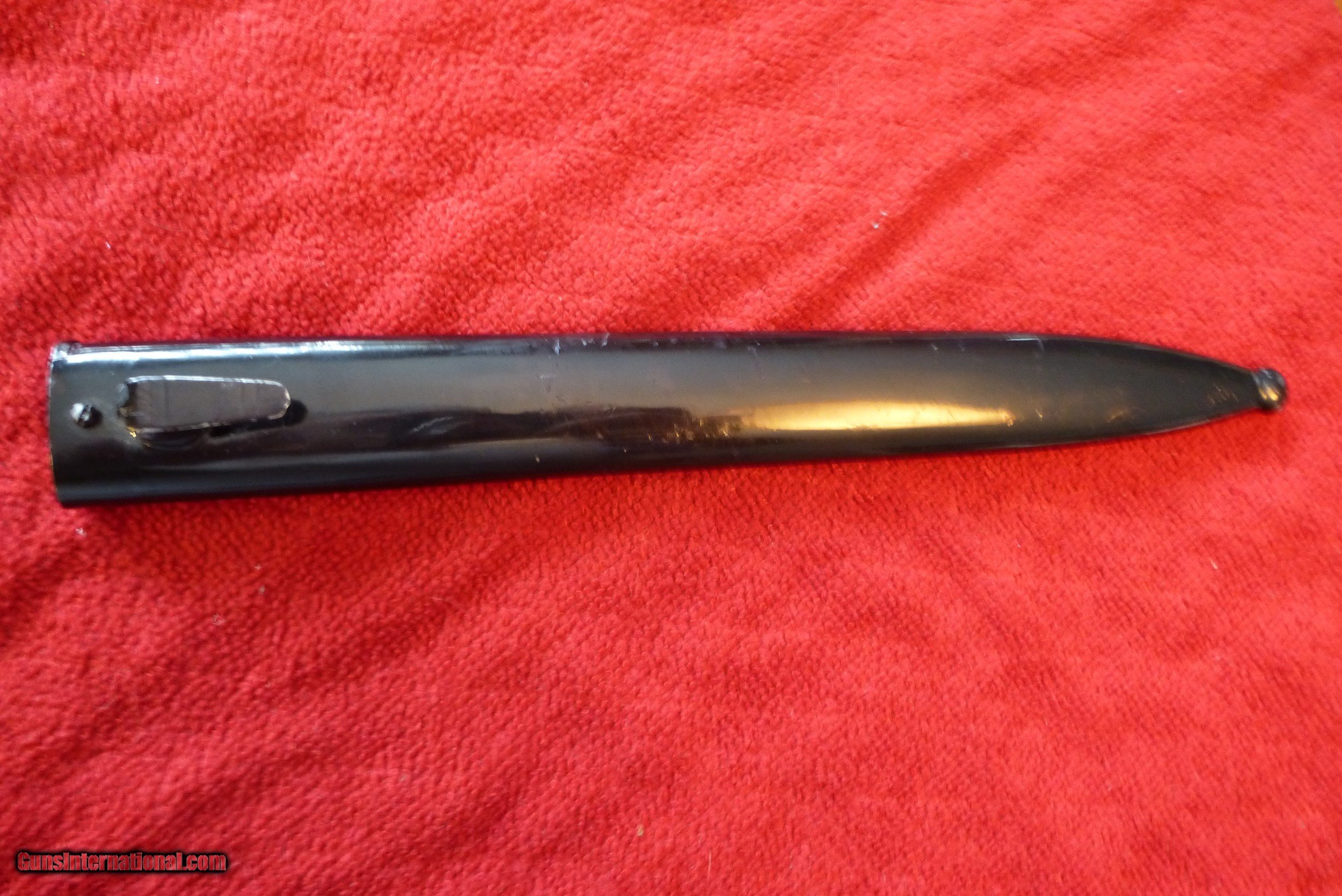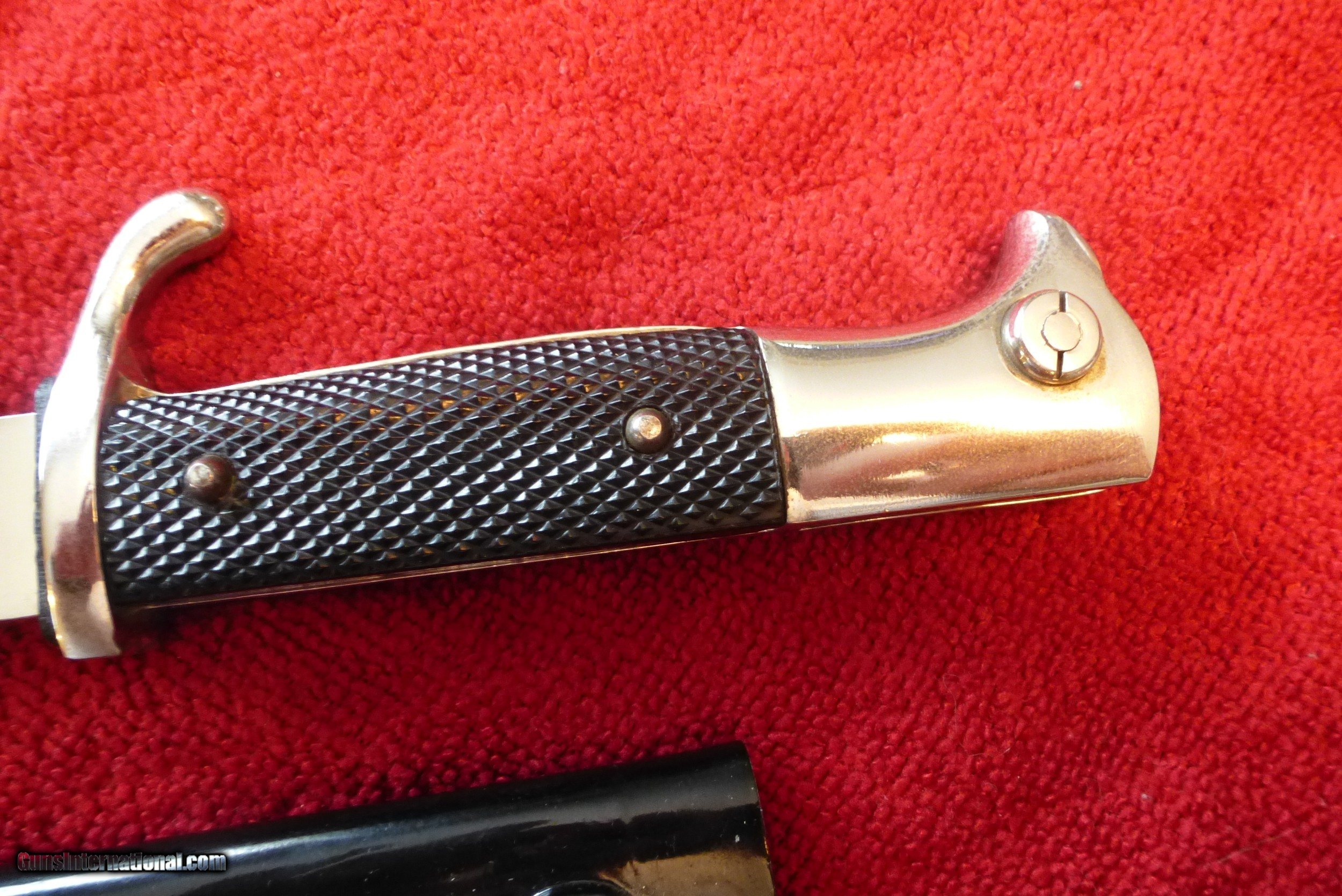 Description: From my personal collection. Beautiful double etched Nazi WW2 dress k98 bayonet with original dent free scabbard. Bayonet blade is un-sharpened and retains app 99 % orig. .mirror like finish also same on hilt and fittings. Leather blade buffer in place.. One side has 41st Inf. regimental marking and other side has Nazi eagle holding swastica and memorial of service etching.Blade stamped "SOLINGEN" at base. Scabbard atill has app 98% of its original black paint finish and has no dents. Bayonet fits in scabbard snuggly. Blade tip pointy.. Bayonet release button works fine. Black checkered handle panels in mint cond. $15 USPS shipping to cont. USA only. I accept MO, Bank cert. check, or pers.check (held till cleared) for payment. Must be 18 toon this item. Not for sale where prohibited. Use buy it now or contact me to purchase. Thanks for looking SOLD |