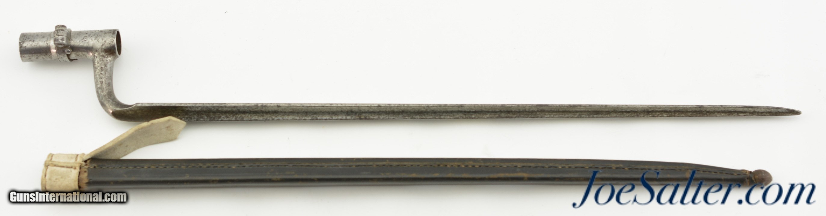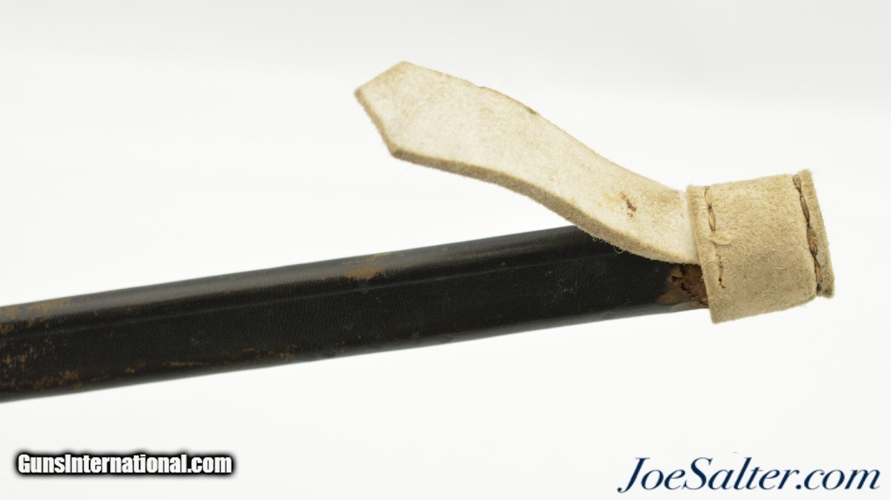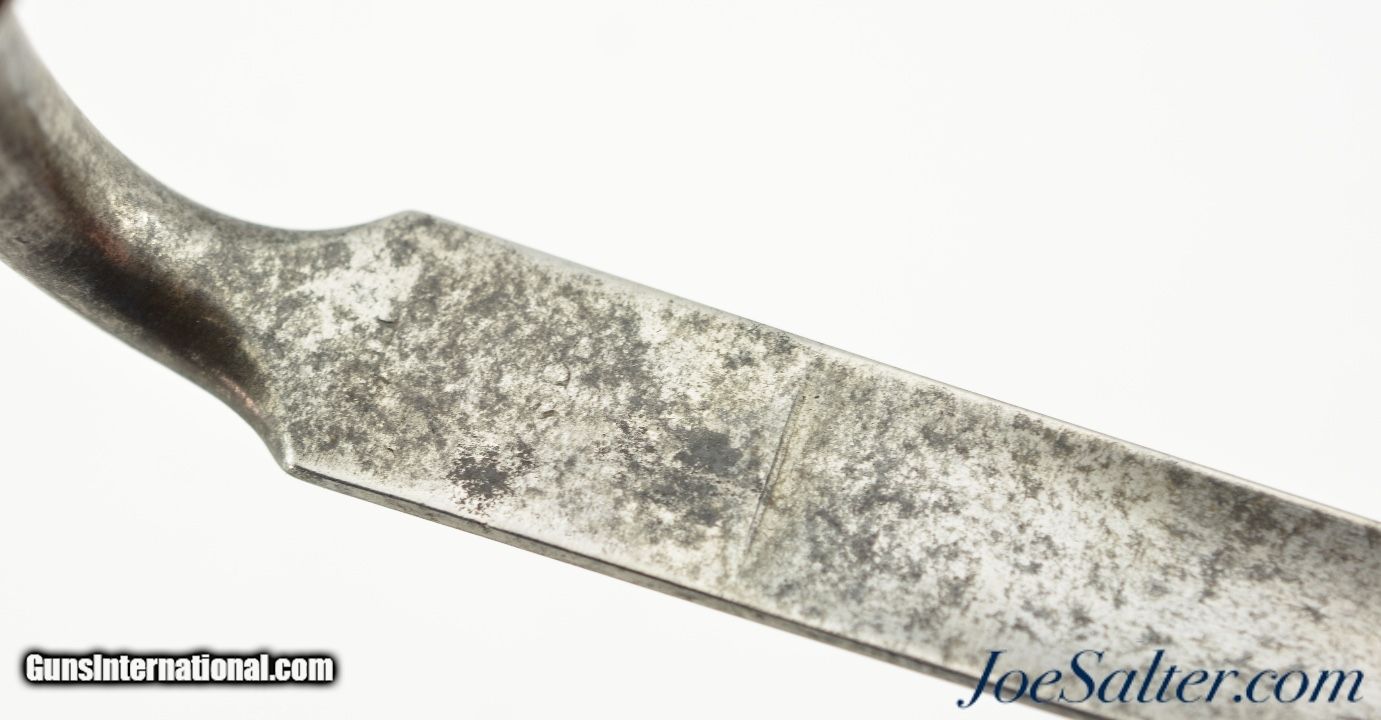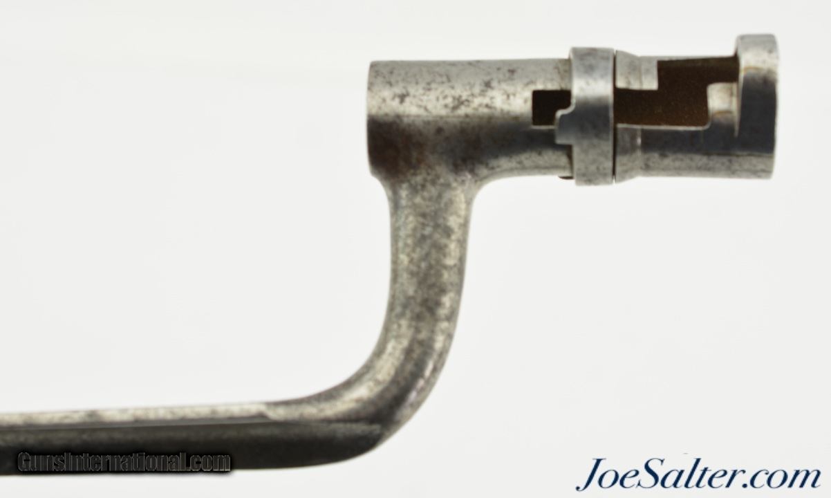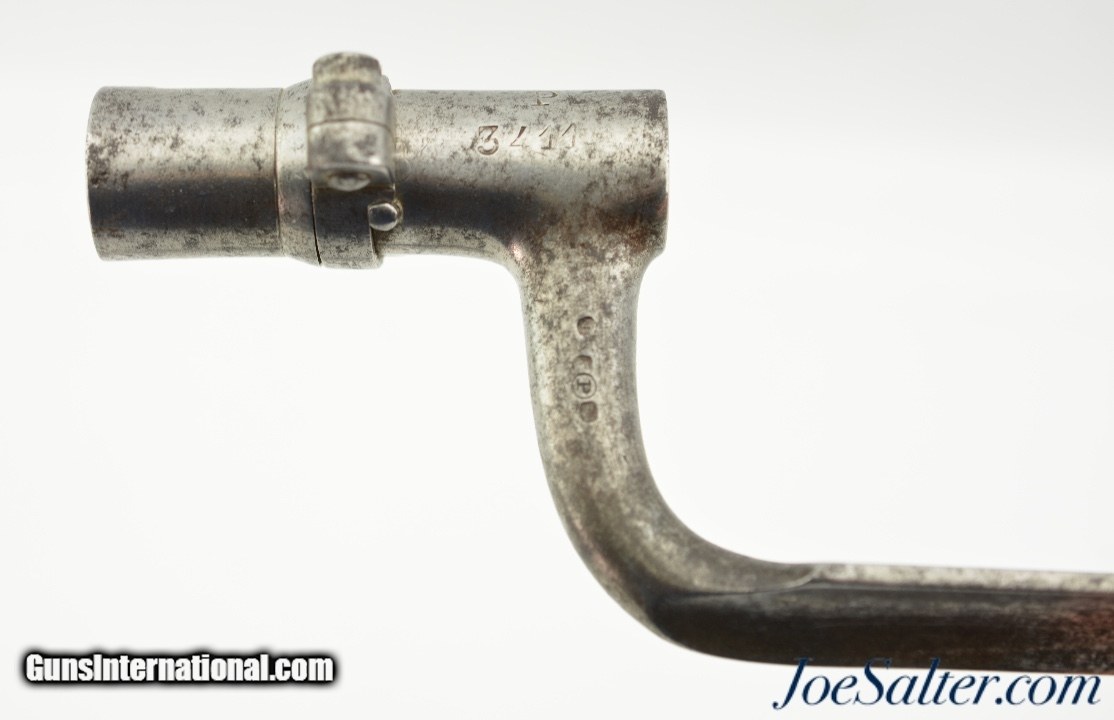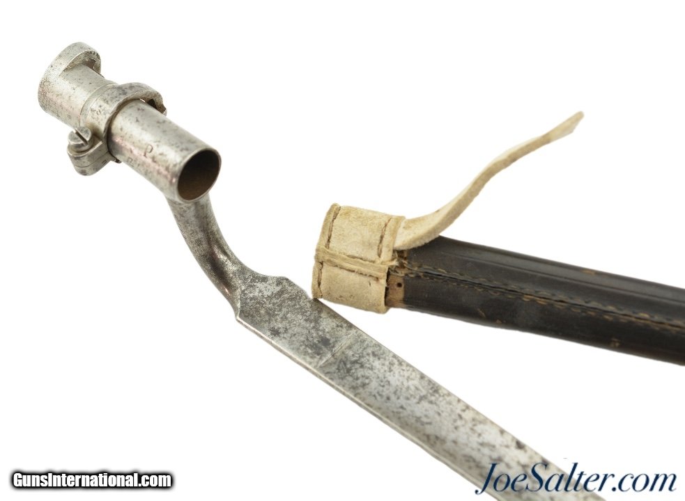 Description: This is a M1867/41 Albini- Braendlin Socket Bayonet/Scabbard for the 11 mm. M1867 Albini-Braendlin rifle. This example is a conversion of the earlier M1841 socket bayonet, as is evidenced by the off-center bridge and brazing lines on the socket. The 18 1/4" blade is in very good condition with age spotting, nice tip and no nicks. The socket is also in very good condition with mostly strong stamping. The rare leather scabbard is in near excellent condition with fine stitching and nice patina. Together a nice example for any collection. SOLD |